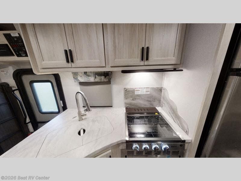 Not much is missing from this Sunseeker Classic Class C gas motorhome! Quite a lot of convenience has been packed into this coach with the full rear bathroom, the semi-private master suite, a complete kitchen, two TVs, and a bunk above the cab. An added bonus is the U-shaped dinette which can serve as a dining space or sleeping space depending on how you have it set up. If you don't need the bunk above cab for sleeping space, you could change it out for the optional Trekker cap with built-in entertainment center and storage. The kitchen is equipped with all of your favorites: a pantry, a convection microwave, a three-burner range, a flip-up countertop, and a 10.7-cubic foot refrigerator.