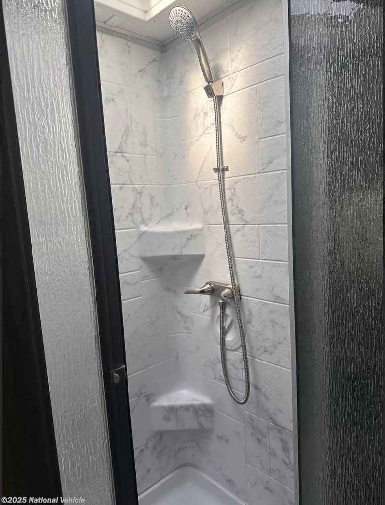 The bedroom offers a cozy retreat with a comfortable bed, storage cabinets, a TV, and lighting options for reading or relaxing. The bathroom is well-appointed with a shower, sink, and toilet, making it easy to freshen up after a day of exploring.