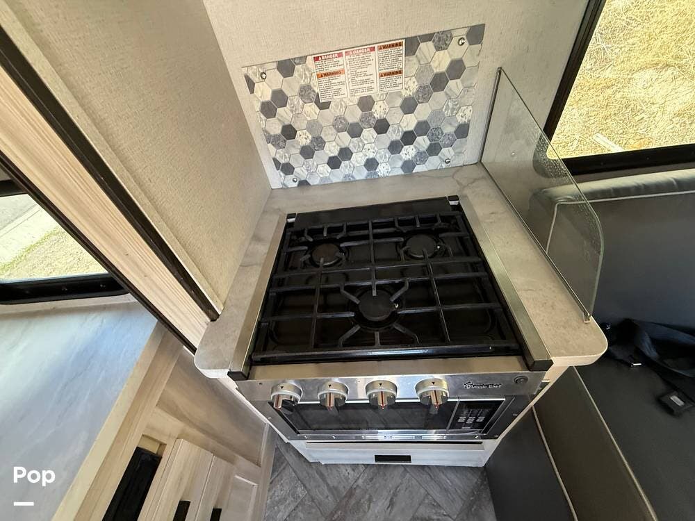 The kitchen is fully equipped with a stainless-steel sink, solid-surface countertops, a 3-burner cooktop, oven, microwave, and a full-size refrigerator -- perfect for meals on the go.