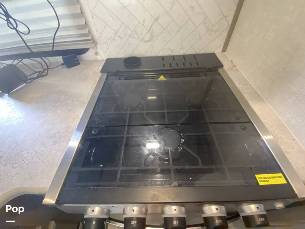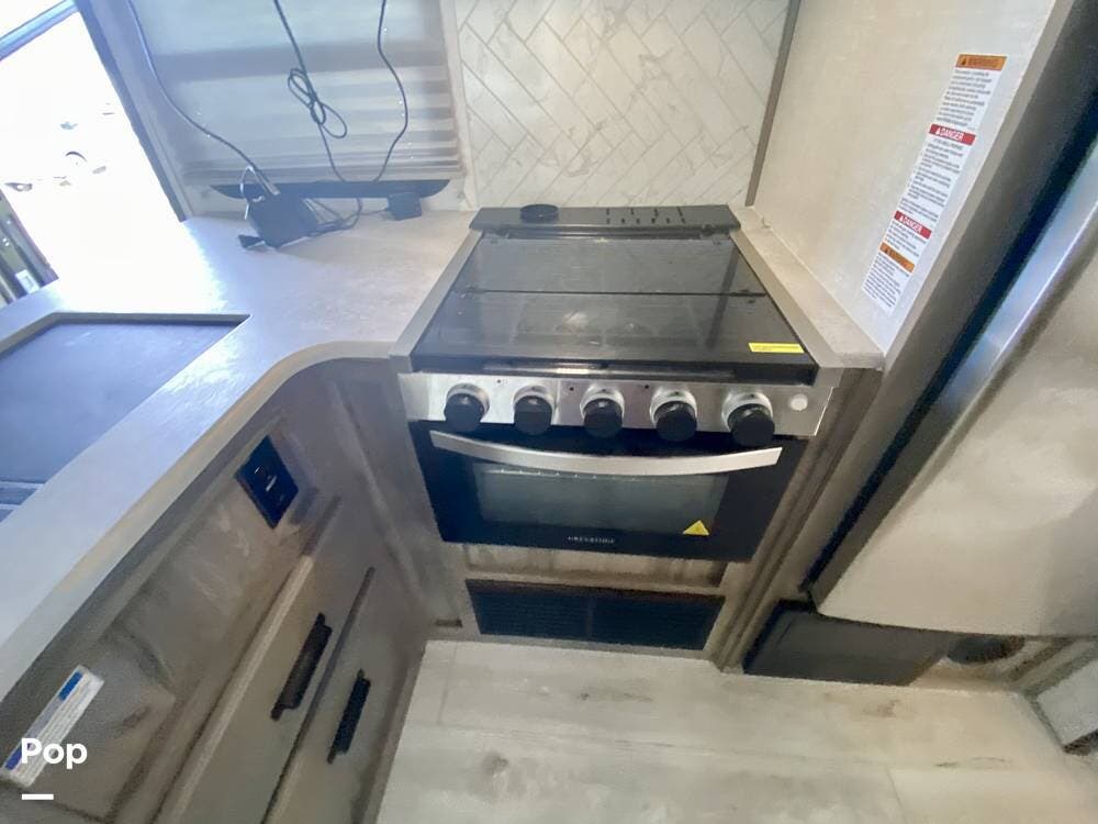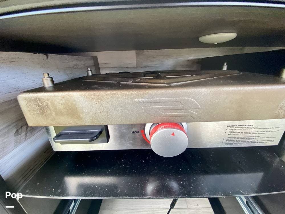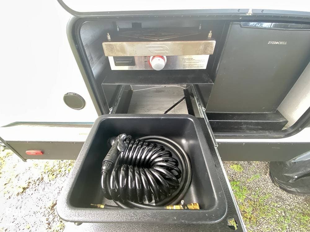 It boasts exterior amenities such as an outdoor kitchen with a mini-fridge and a propane griddle, a large awning, pass-through storage, and electric jacks for easy setup!