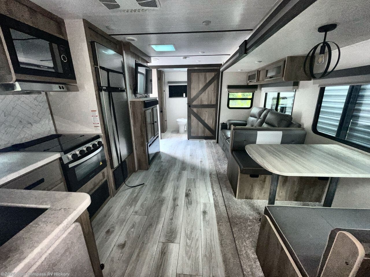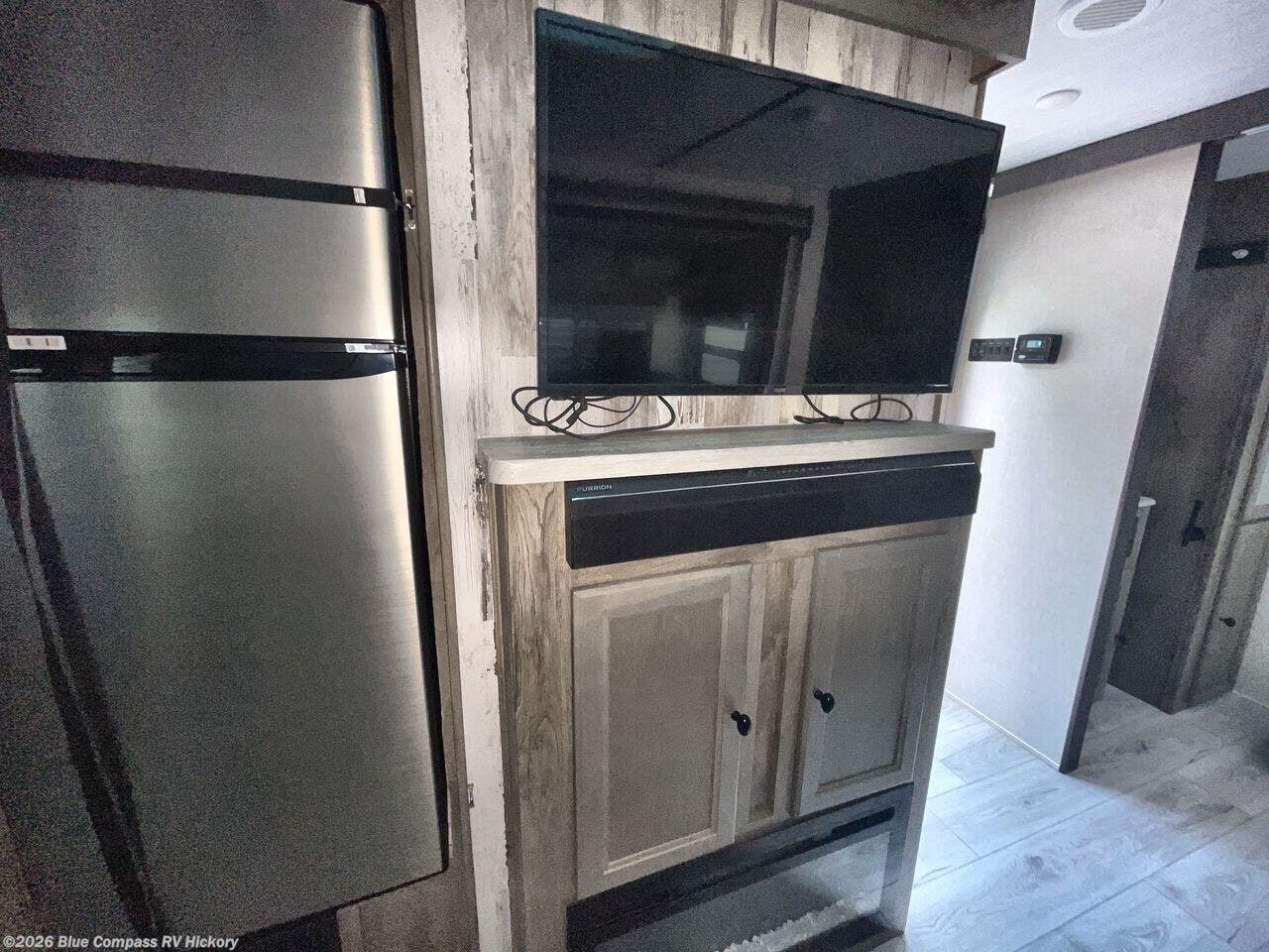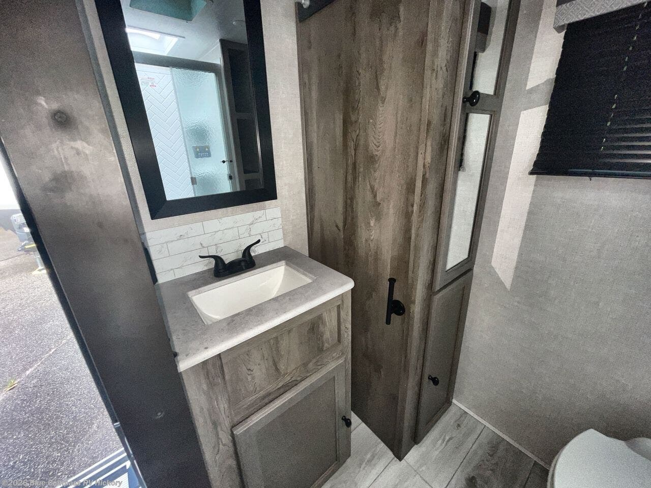 No need to rough it when you camp, this trailer offers amenities that allow you to "Glamp" if you want! The rear spacious bathroom is tucked away behind a beautiful barn door, and inside features a 30" x 36" shower, wardrobe, linen storage and residential bath hooks. The front master bedroom offers privacy, a walk-around queen bed, two wardrobes, "Cubbie" storage at the head of the bed, USB ports for your electronics, and massive under bed storage for extra blankets and pillows. The L-shaped counter in the kitchen provides enough space to have everything at your fingertips while you cook, plus there is a countertop extension for more prep and serving space if needed. A nice walk-in pantry just inside the entry door will be perfect for chips and snacks or canned goods for those longer camping trips. If dining inside, the booth dinette with EZ-Access storage beneath will be comfortable plus you will enjoy the view provided by the panoramic windows within the slide out. This slide also features a tri-fold sofa opposite the TV and fireplace and it can create added sleeping space for your guests, or you may like the theater seating option instead. An outside kitchen will be a favorite for anyone that cooks, and the 19' awning will provide some protection from the elements and offering an outdoor living area to enjoy with everyone. And, there is also a pass-through storage plus a bike/utility rack allowing you to bring along everything you need for a perfect camping experience.