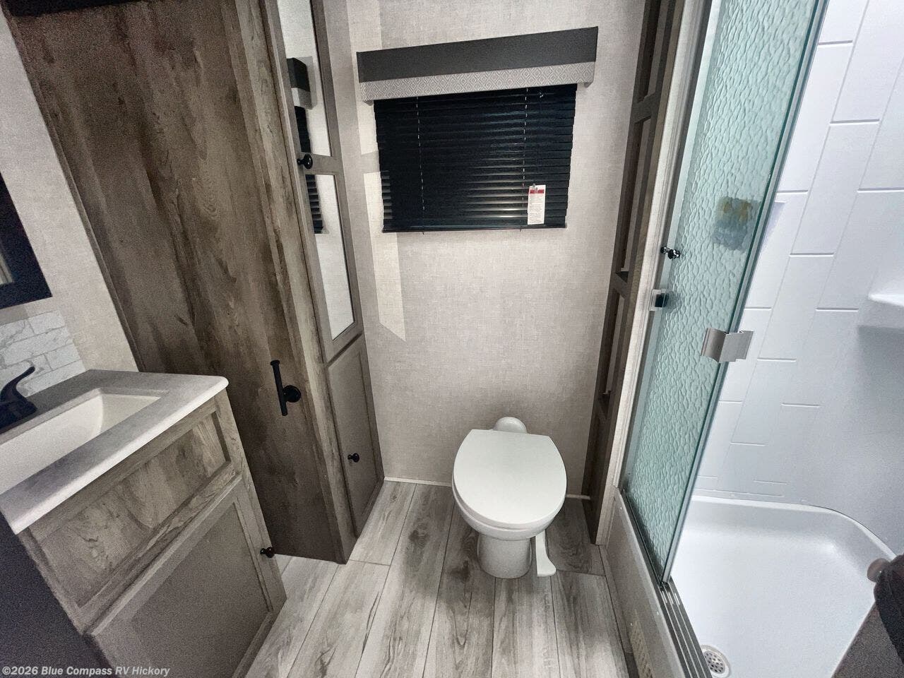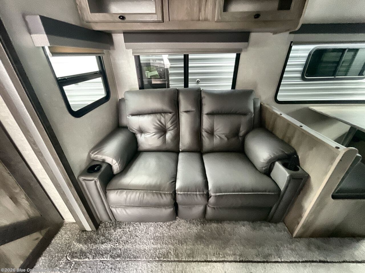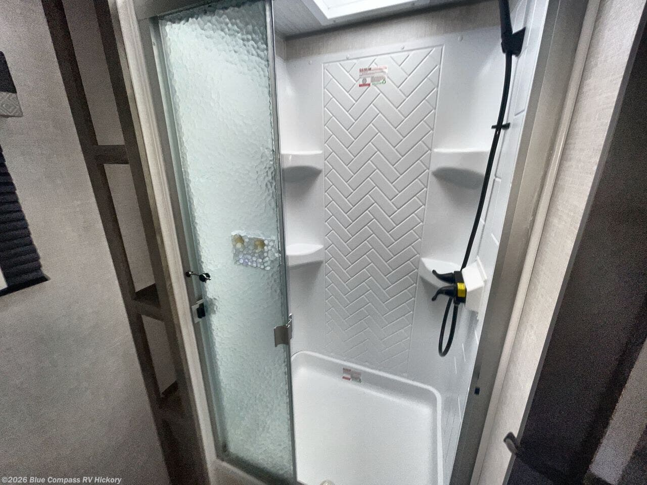 No need to rough it when you camp, this trailer offers amenities that allow you to "Glamp" if you want! The rear spacious bathroom is tucked away behind a beautiful barn door, and inside features a 30" x 36" shower, wardrobe, linen storage and residential bath hooks. The front master bedroom offers privacy, a walk-around queen bed, two wardrobes, "Cubbie" storage at the head of the bed, USB ports for your electronics, and massive under bed storage for extra blankets and pillows. The L-shaped counter in the kitchen provides enough space to have everything at your fingertips while you cook, plus there is a countertop extension for more prep and serving space if needed. A nice walk-in pantry just inside the entry door will be perfect for chips and snacks or canned goods for those longer camping trips. If dining inside, the booth dinette with EZ-Access storage beneath will be comfortable plus you will enjoy the view provided by the panoramic windows within the slide out. This slide also features a tri-fold sofa opposite the TV and fireplace and it can create added sleeping space for your guests, or you may like the theater seating option instead. An outside kitchen will be a favorite for anyone that cooks, and the 19' awning will provide some protection from the elements and offering an outdoor living area to enjoy with everyone. And, there is also a pass-through storage plus a bike/utility rack allowing you to bring along everything you need for a perfect camping experience.