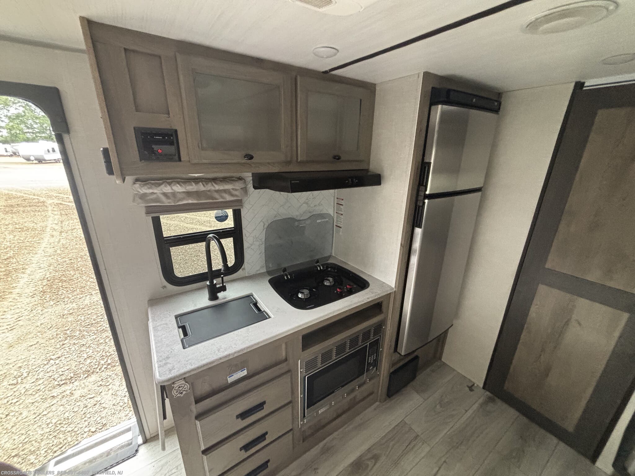 This travel trailer is equipped with a full kitchen, including a microwave, oven, refrigerator, and stove top burner—ideal for preparing home-cooked meals while traveling. The refrigerator's capacity is perfect for keeping food cold during your journey, complemented by additional features like an exterior grill and outdoor speakers for entertaining outdoors. An awning provides shade and extends your living space, perfect for relaxing outside your RV.