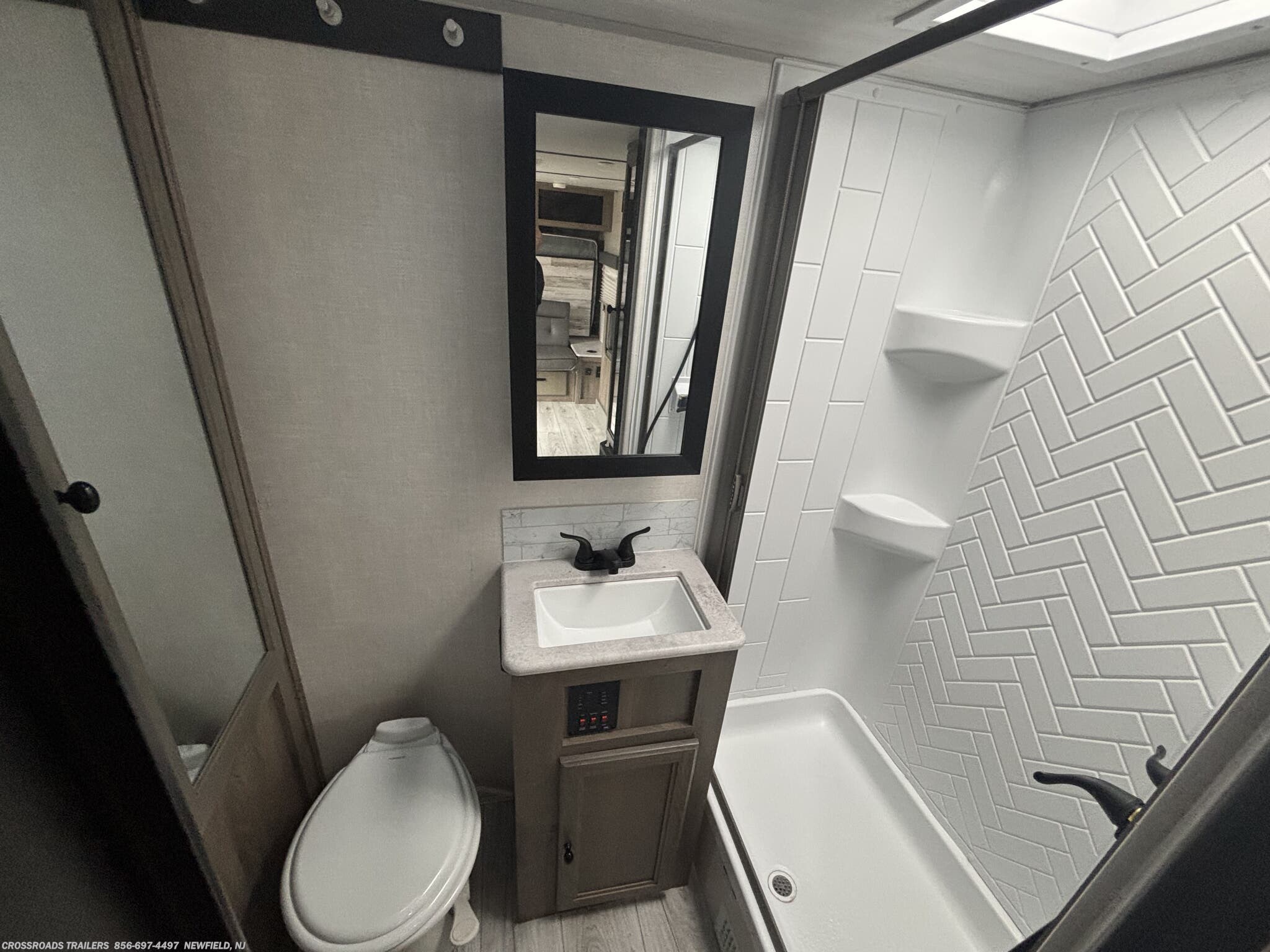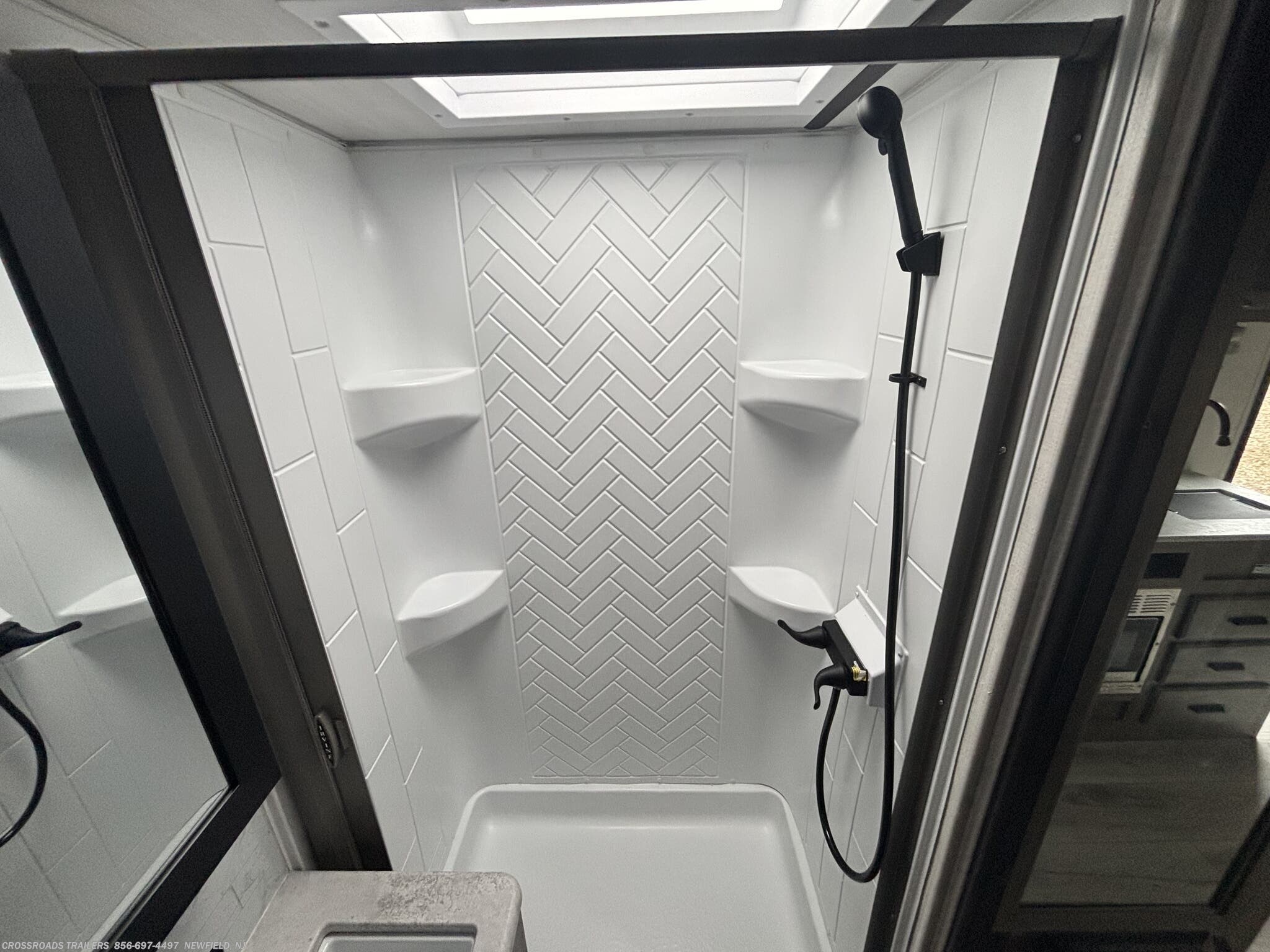 The Surveyor Legend features a thoughtfully designed interior that sleeps up to four people comfortably, making it perfect for weekend getaways or extended trips. Key amenities include a cozy queen bed, booth dinette, and versatile sleeping arrangements that maximize comfort and functionality. The interior showcases essential features such as a medicine cabinet, skylight, roof vents, and a modern shower and toilet setup, ensuring a home-like experience on the road.