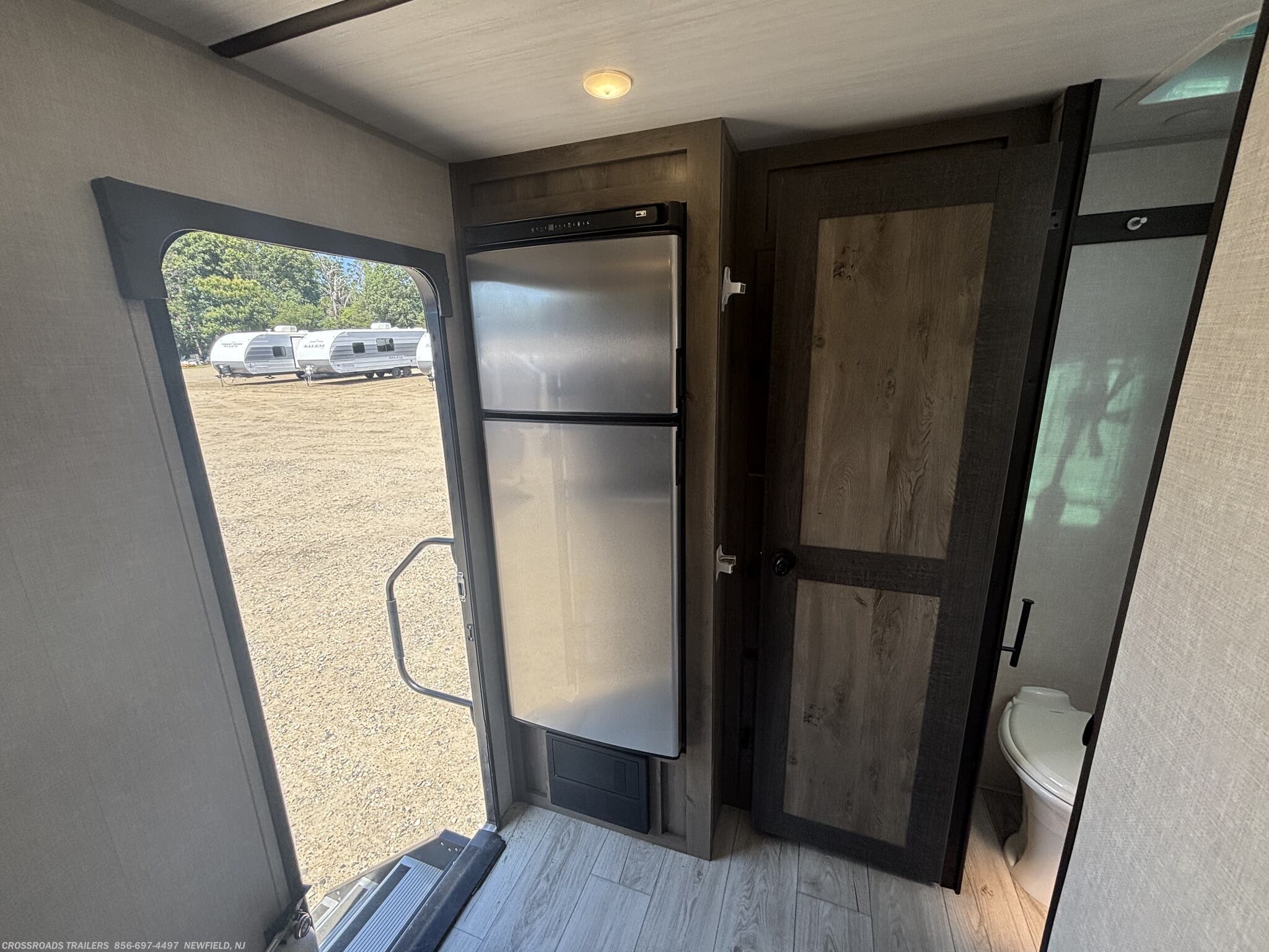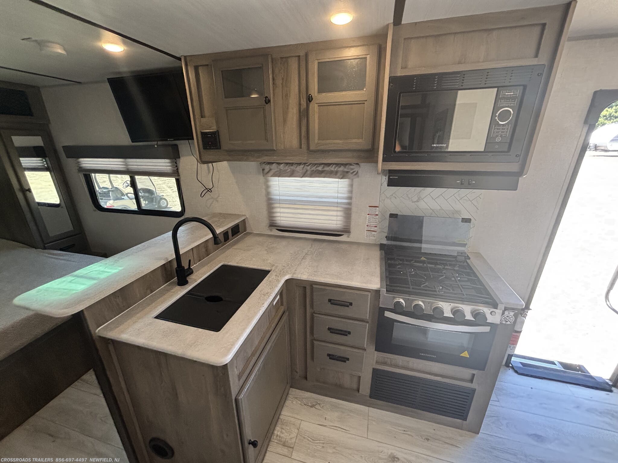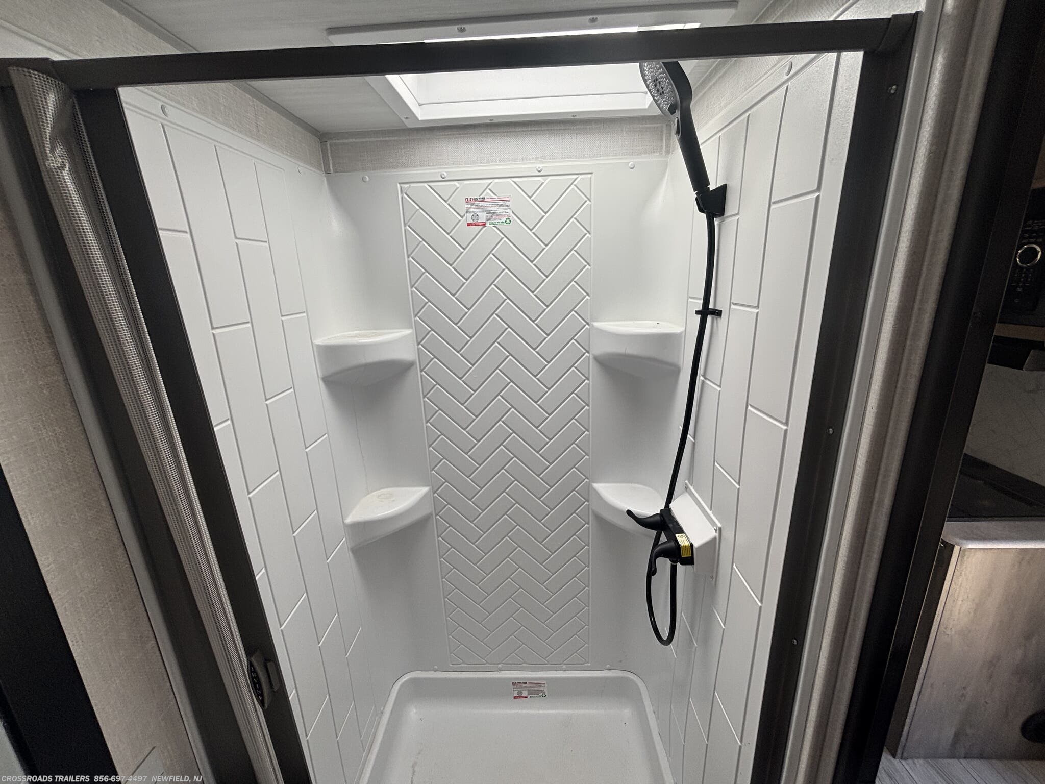 The fully equipped kitchen boasts a refrigerator, oven, microwave, stove-top burner, and a water heater, providing all essentials for preparing meals on the road. The bathroom includes a shower and toilet, complemented by a medicine cabinet, roof vents, and ventilation to maintain comfort and convenience during your travels.