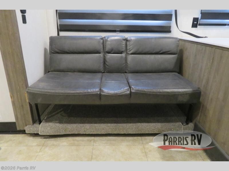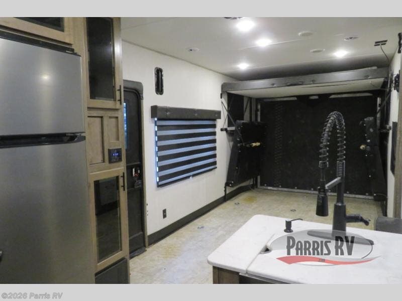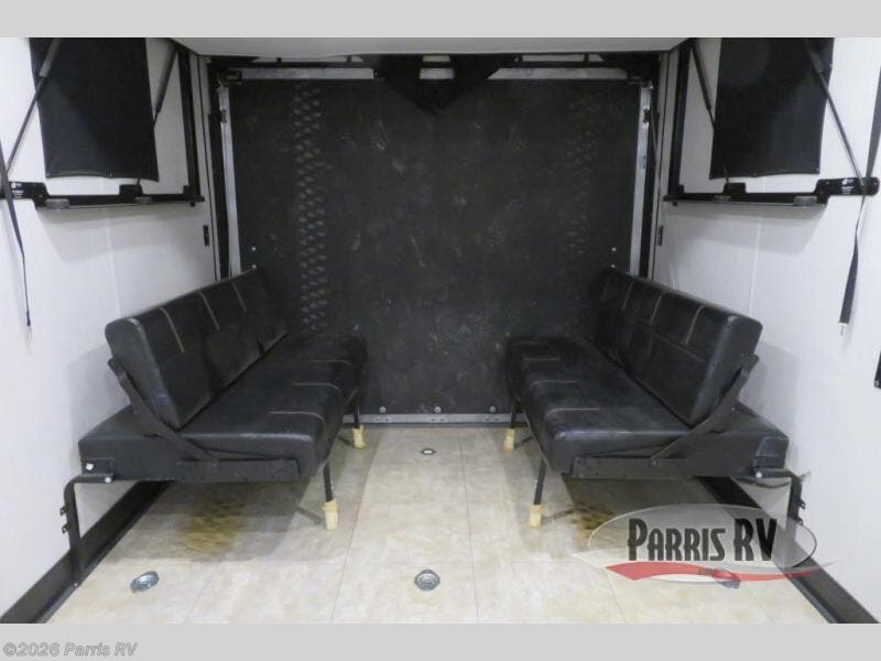 Bring along your kayaks, dirt bikes, or even a side-by-side in this toy hauler. There is 15' 10" total garage space, and a ramp door for easy unloading. Once your toys are out, enjoy lunch at the roll-over sofas, or let your guests rest on the quick set queen bed system before heading out. There is a dual entry bath to clean up in each day, and the Rogue king bed is sure to bring sweet dreams. In the morning, prepare eggs and bacon on the three burner cooktop, and the milk can go back in the 10.1 cu. ft. residential refrigerator. This model also includes a flip-up sofa for more seating and sleeping space, and you can add the optional lounge chairs too!