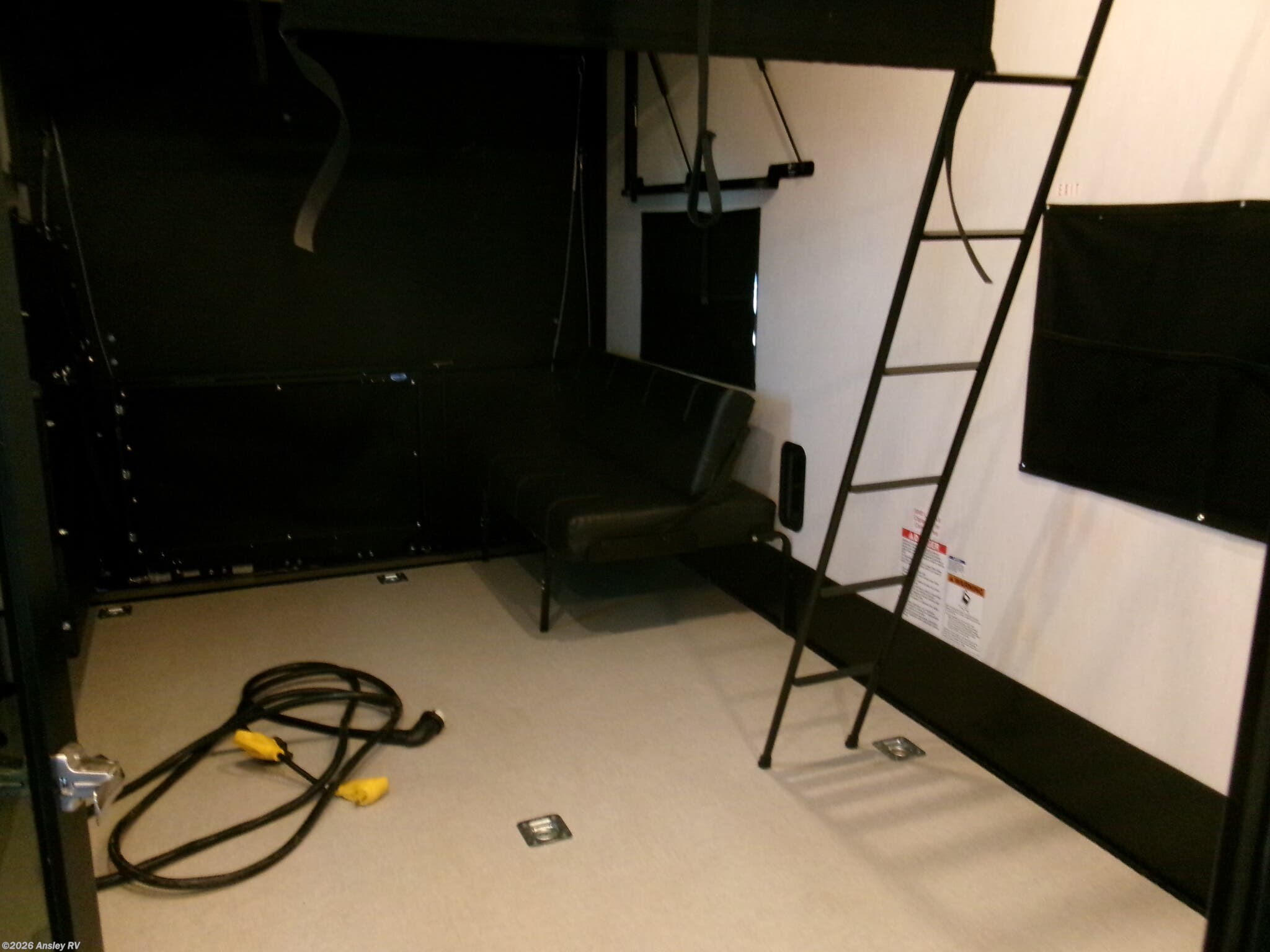 The 15' 6" garage area of this fifth wheel toy hauler has enough space for you to bring along your favorite off-road toys! The garage area also has opposing flip-up sofas with a table in between and a raised queen bed above, plus a loft, a half bathroom, and an area prepped for an optional washer and dryer. There is plenty of walking around space in the central combined living/kitchen area thanks to the large slide out sofa with recliners, as well as the refrigerator and three burner cooktop slide. The front dual entry bathroom has a radius shower for you to freshen up in each morning and an entrance into a private bedroom with king bed and lots of storage!