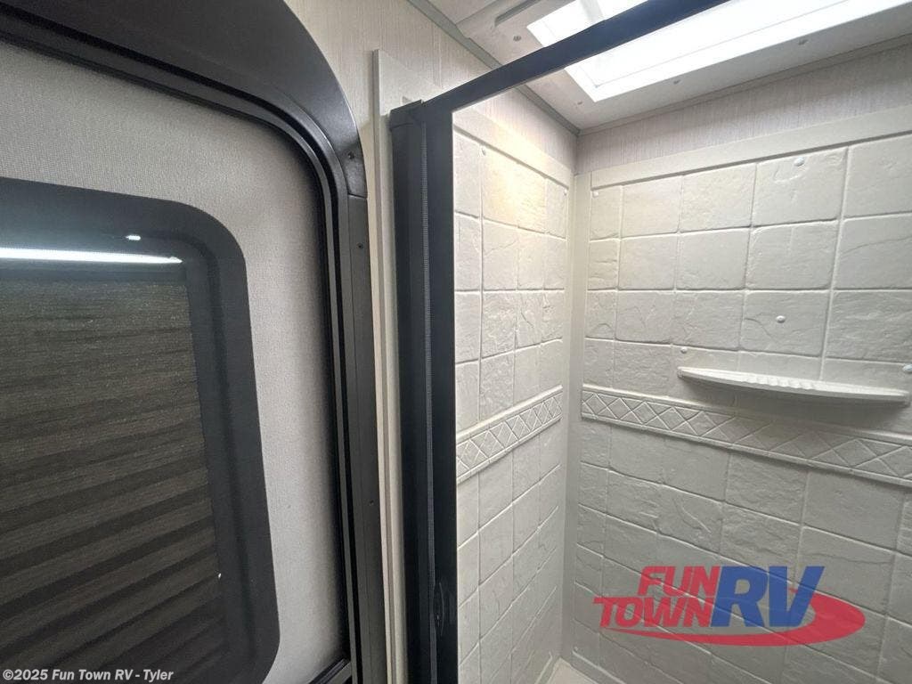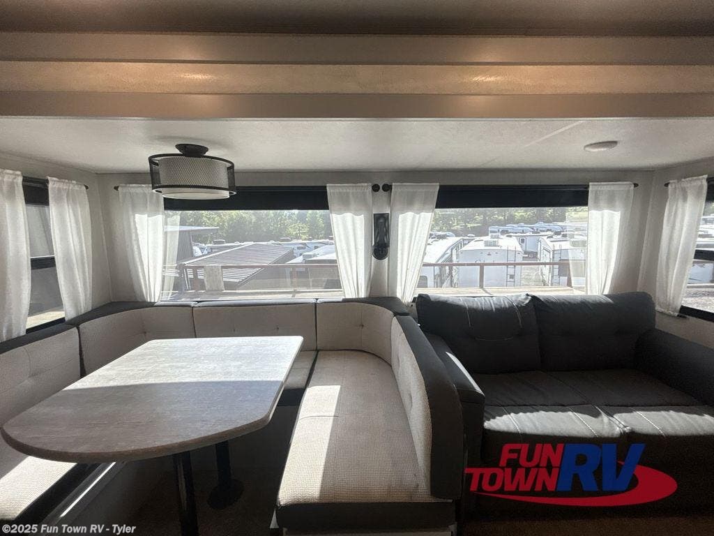 Are you looking to upgrade your RV to a trailer with more space and more features? Look no further than this Vibe that can sleep ten people each night. The kids are sure to claim the double-size bunks to themselves, while the adults take the front private bedroom with the queen bed. You will find even more sleeping space on the U-shaped dinette and sleeper sofa within the large slide out. After a day outdoors at the lake, get cleaned up in the full bath that includes a 40" x 30" walk-in shower and its own exterior entry door for convenience. There is so much more to love about this model, like the fireplace and entertainment center, the oversized panoramic windows, and the large pass-through storage for all your gear!