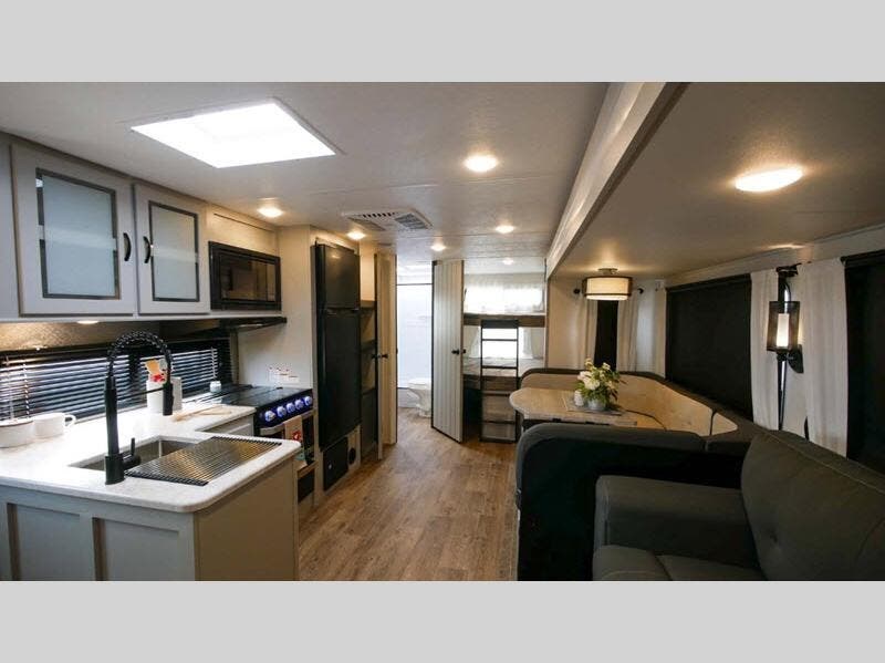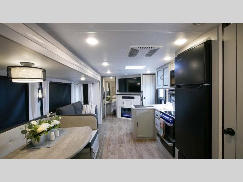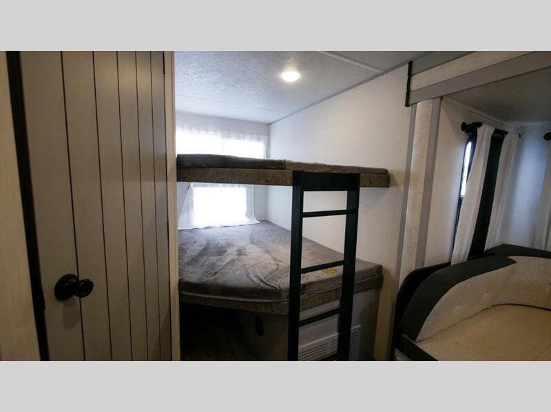 Are you looking to upgrade your RV to a trailer with more space and more features? Look no further than this Vibe that can sleep ten people each night. The kids are sure to claim the double-size bunks to themselves, while the adults take the front private bedroom with the queen bed. You will find even more sleeping space on the U-shaped dinette and sleeper sofa within the large slide out. After a day outdoors at the lake, get cleaned up in the full bath that includes a 40" x 30" walk-in shower and its own exterior entry door for convenience. There is so much more to love about this model, like the fireplace and entertainment center, the oversized panoramic windows, and the large pass-through storage for all your gear!
