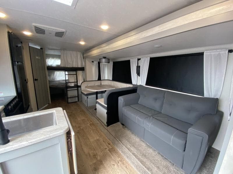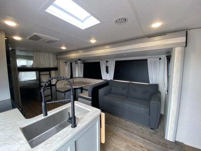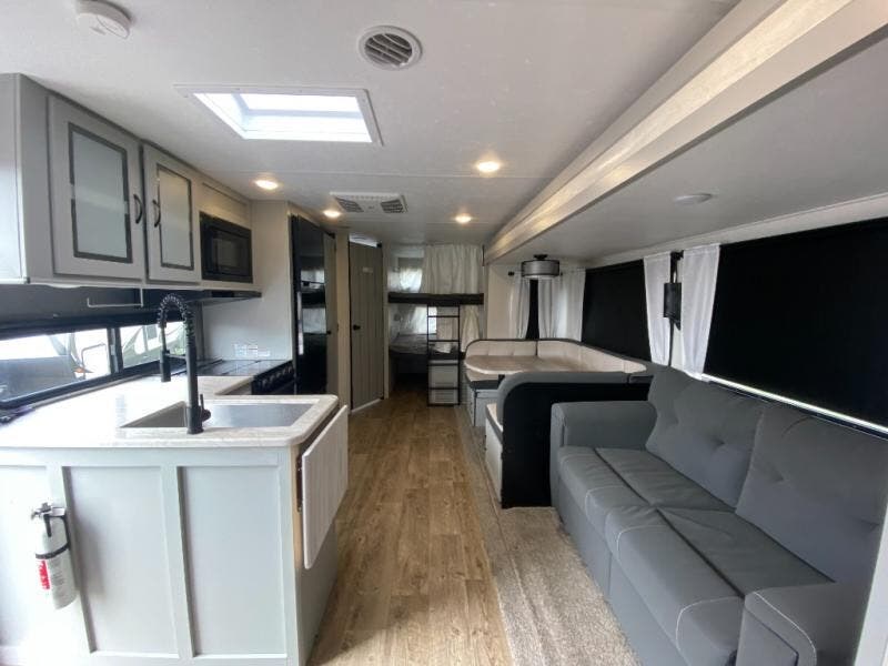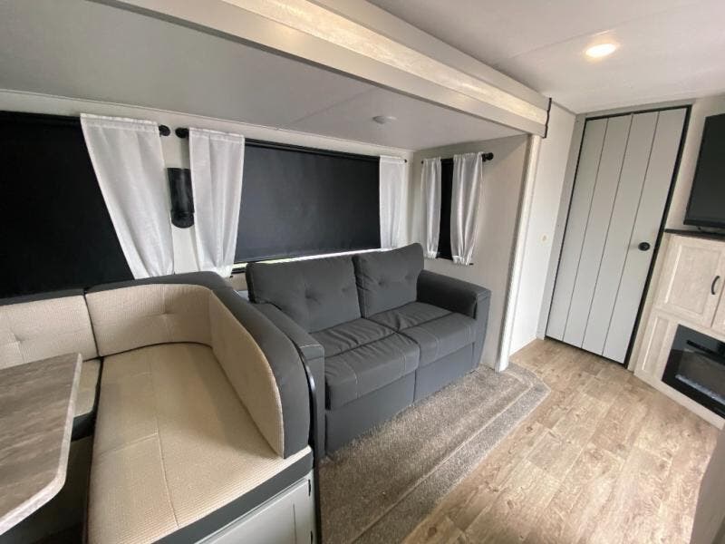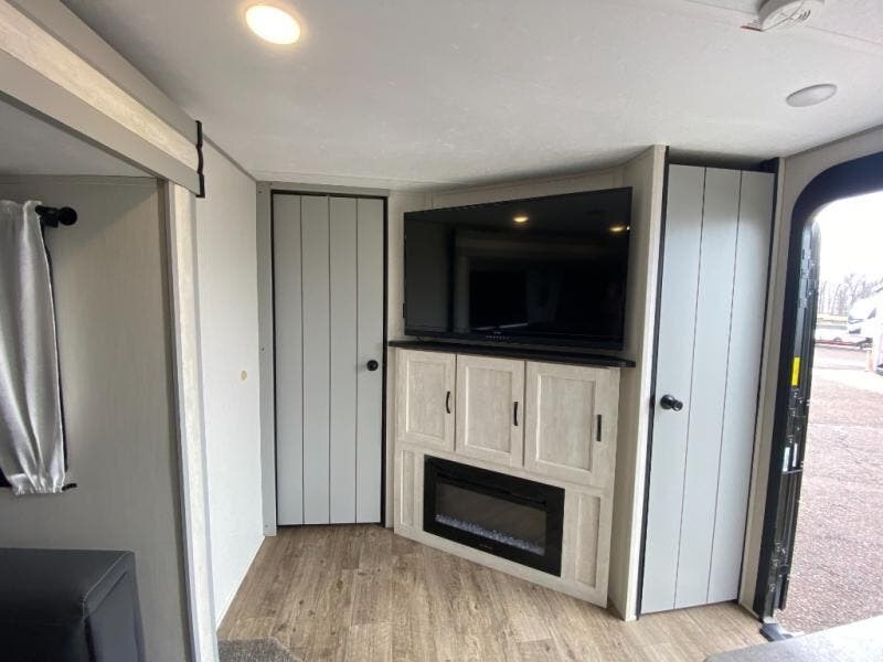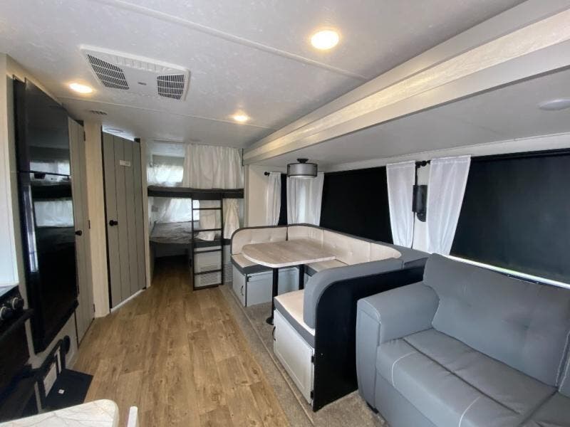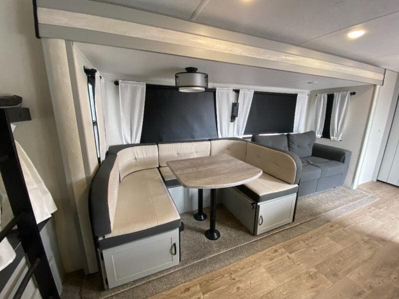 Are you looking to upgrade your RV to a trailer with more space and more features? Look no further than this Vibe that can sleep ten people each night. The kids are sure to claim the double-size bunks to themselves, while the adults take the front private bedroom with the queen bed. You will find even more sleeping space on the U-shaped dinette and sleeper sofa within the large slide out. After a day outdoors at the lake, get cleaned up in the full bath that includes a 40" x 30" walk-in shower and its own exterior entry door for convenience. There is so much more to love about this model, like the fireplace and entertainment center, the oversized panoramic windows, and the large pass-through storage for all your gear!