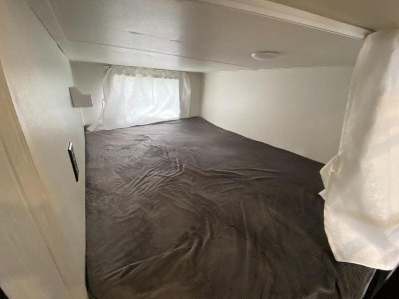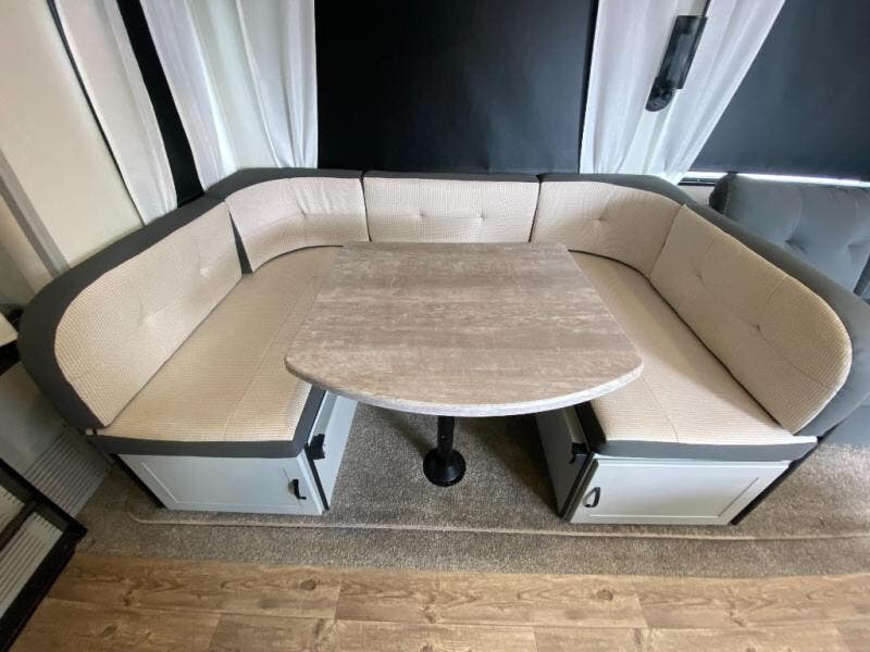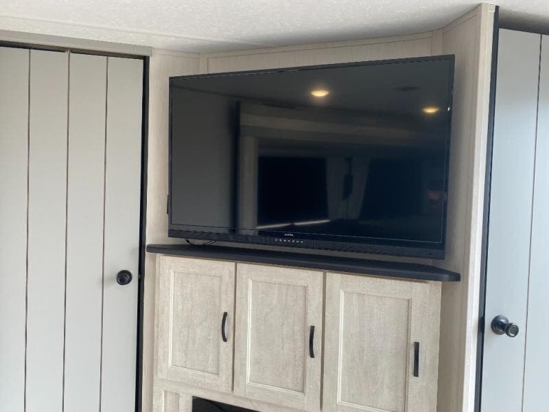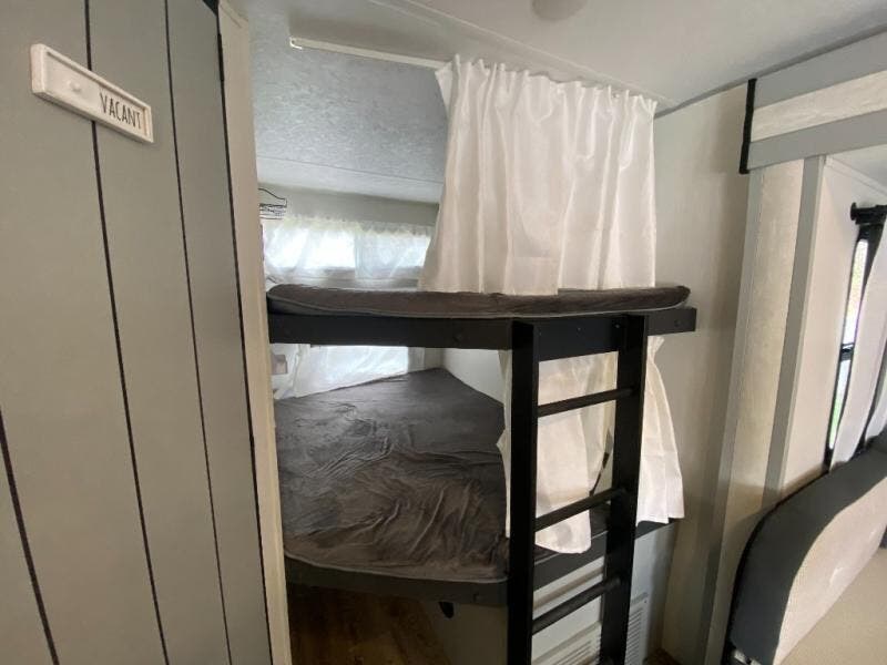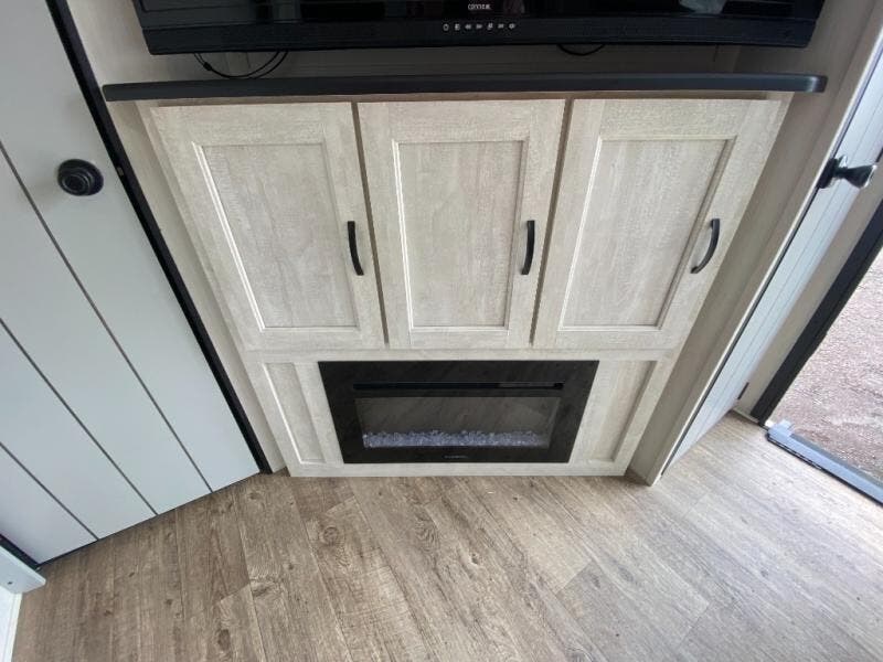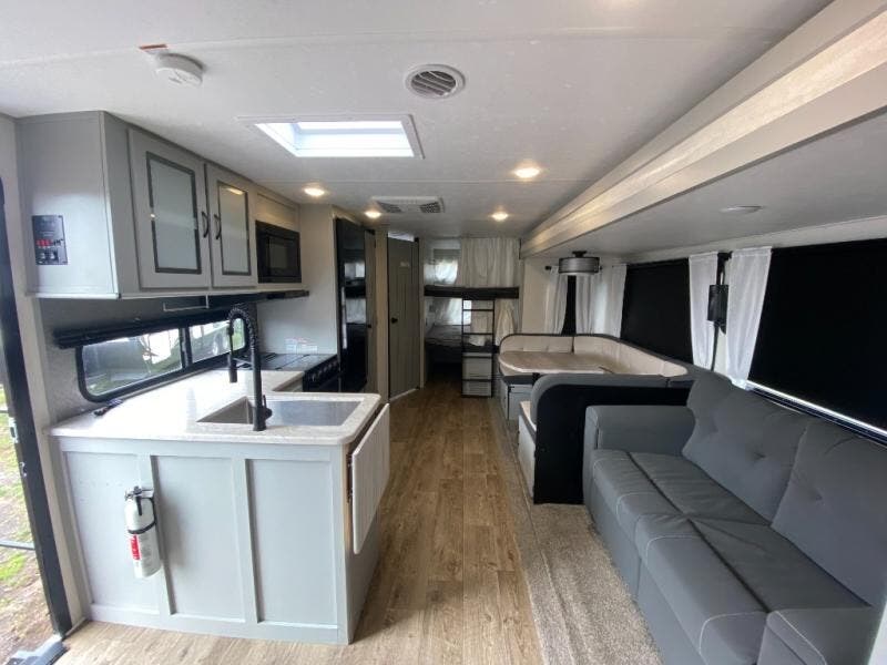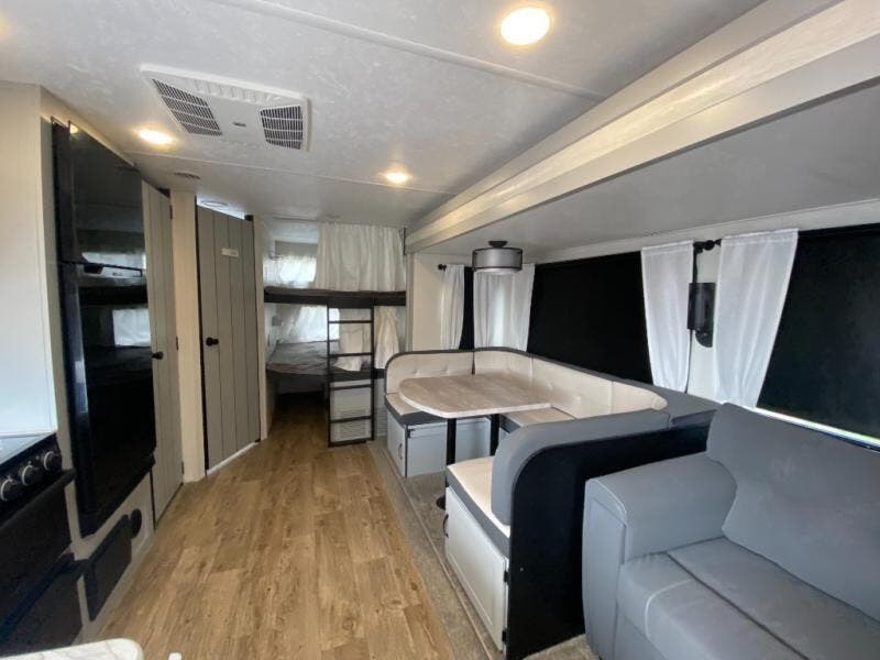 Are you looking to upgrade your RV to a trailer with more space and more features? Look no further than this Vibe that can sleep ten people each night. The kids are sure to claim the double-size bunks to themselves, while the adults take the front private bedroom with the queen bed. You will find even more sleeping space on the U-shaped dinette and sleeper sofa within the large slide out. After a day outdoors at the lake, get cleaned up in the full bath that includes a 40" x 30" walk-in shower and its own exterior entry door for convenience. There is so much more to love about this model, like the fireplace and entertainment center, the oversized panoramic windows, and the large pass-through storage for all your gear!
