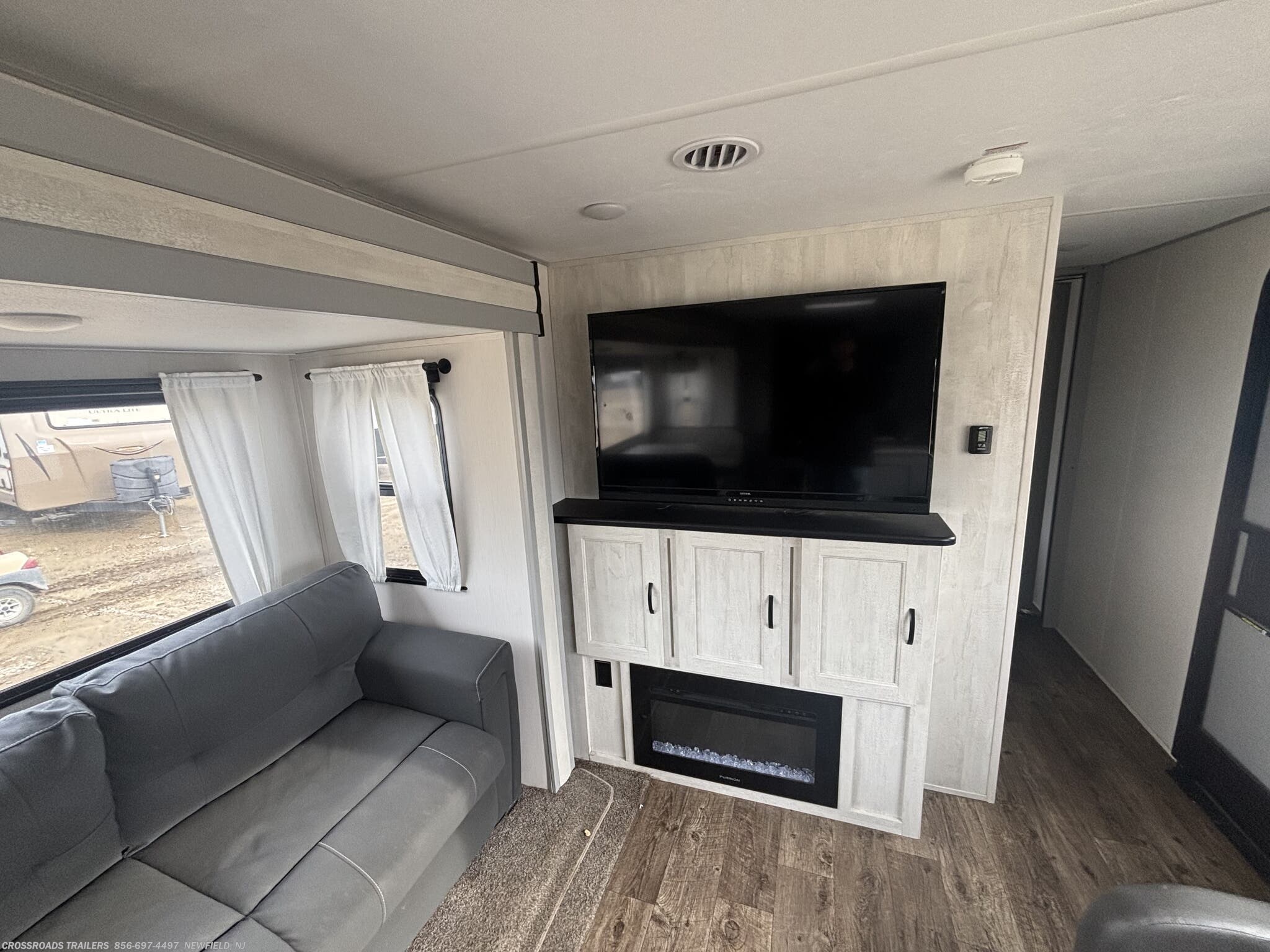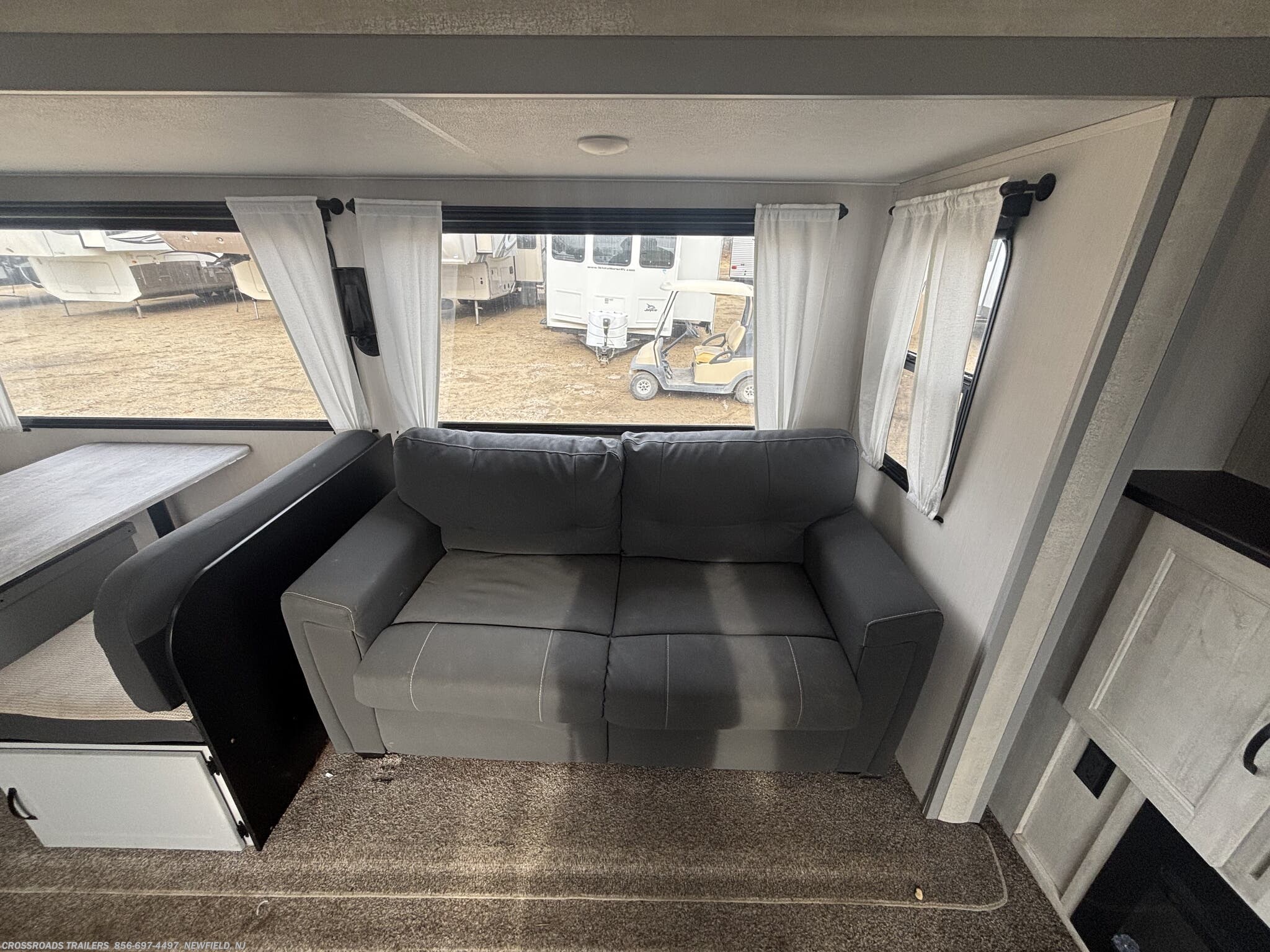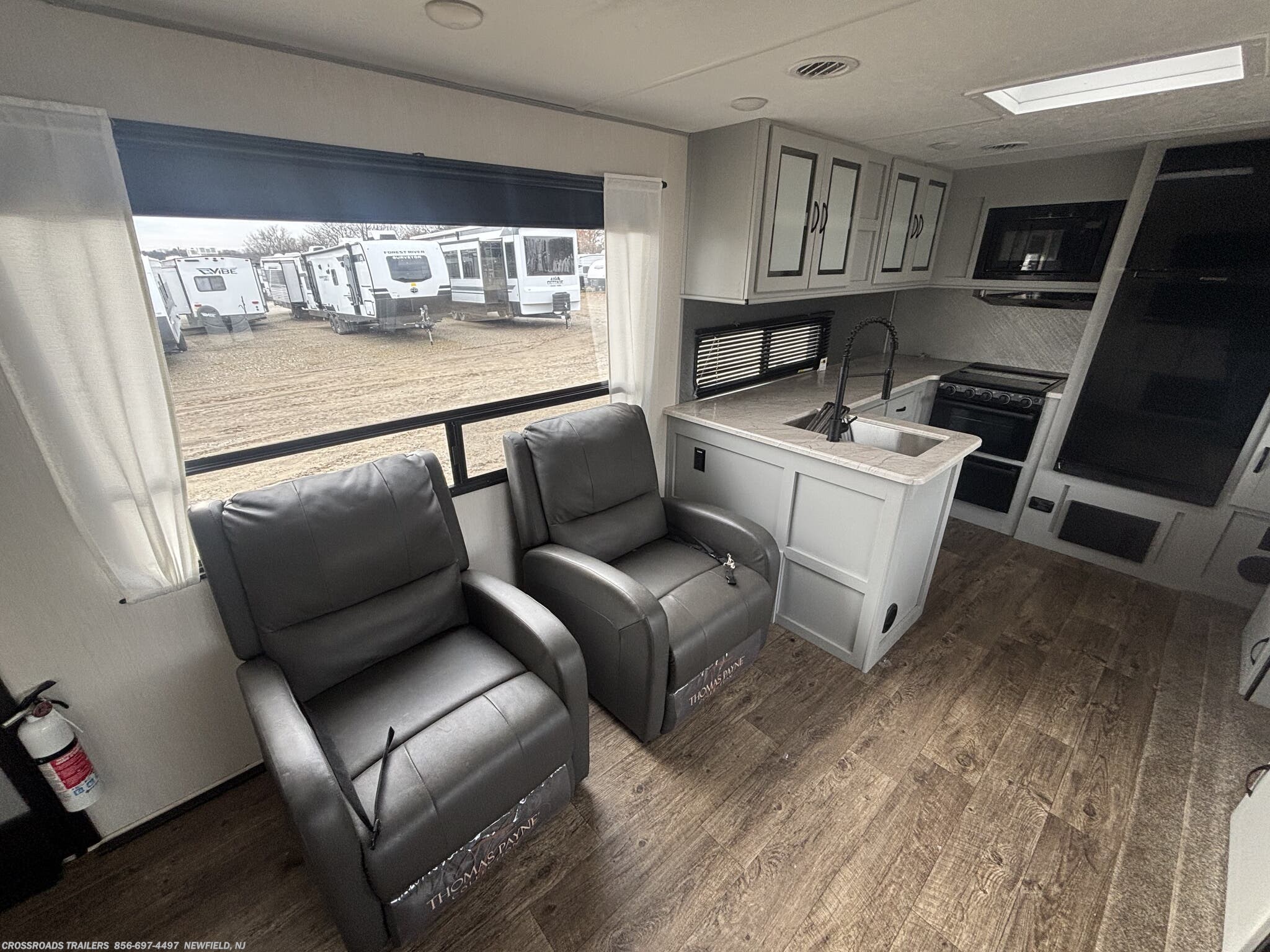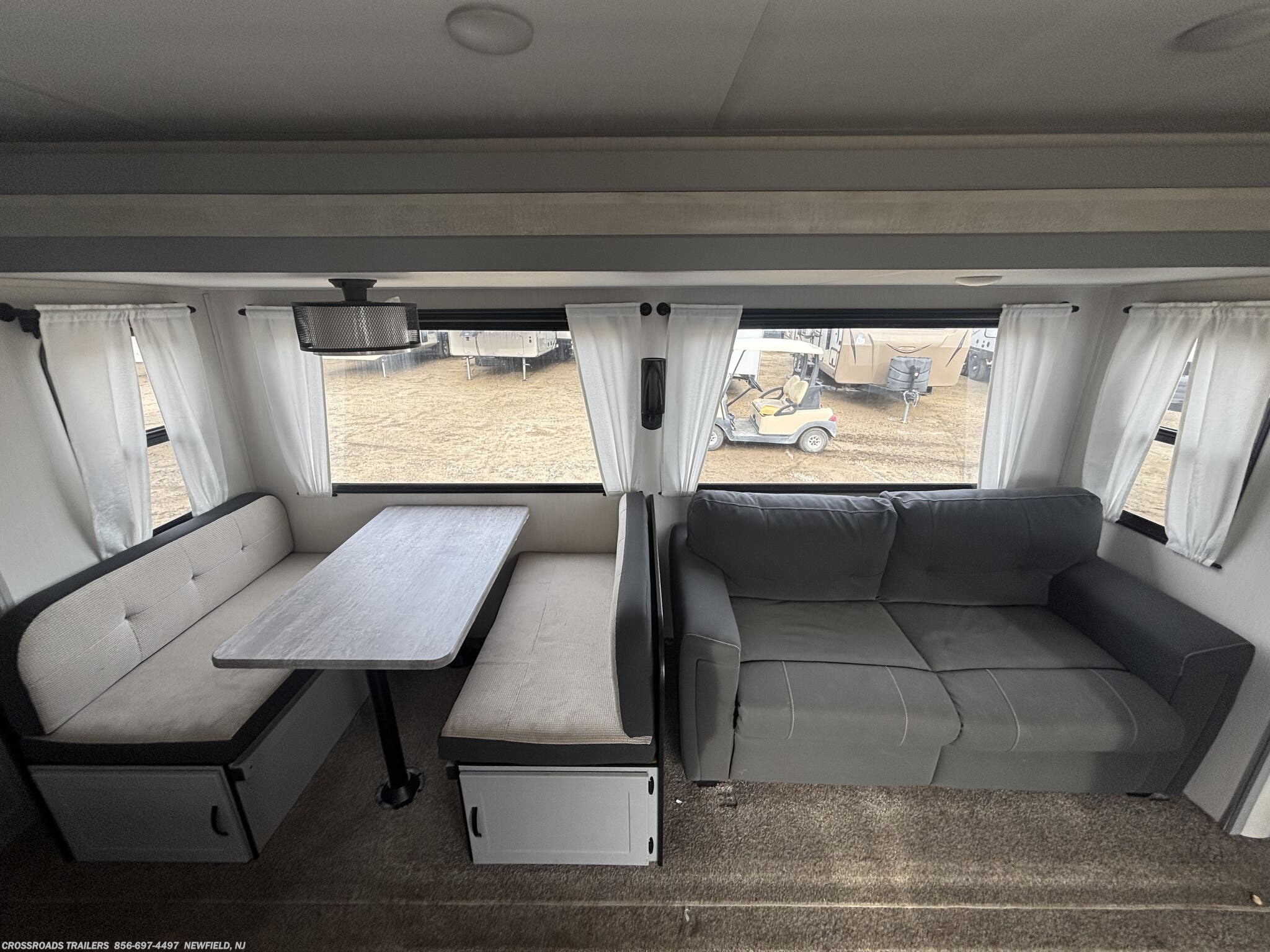 Inside, the Vibe 26RK offers a well-equipped kitchen with a convection microwave, traditional microwave, oven, stove top burner, and a refrigerator to keep meals fresh. It also includes a furnace and a water heater for year-round comfort, along with an auxiliary battery and optional solar panels for extended off-grid adventures. For safety, you’ll find CO and LP detectors, a smoke detector, a fire extinguisher, and a dedicated TV setup to keep everyone entertained after a day on the road.