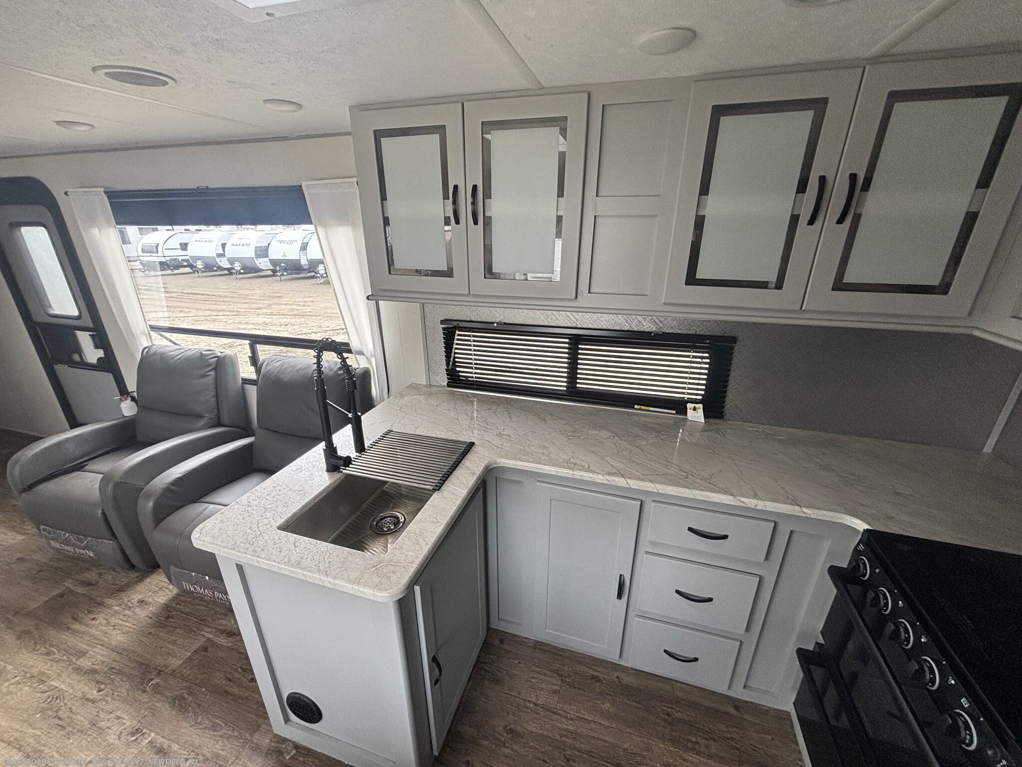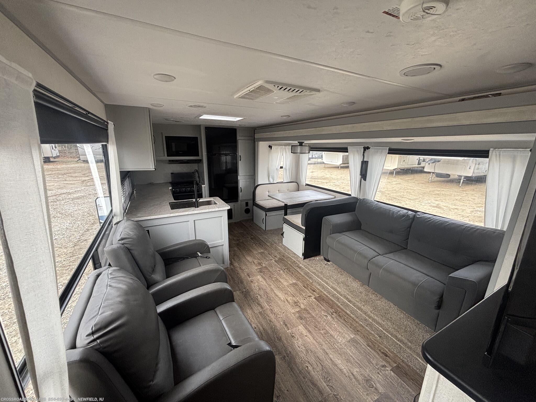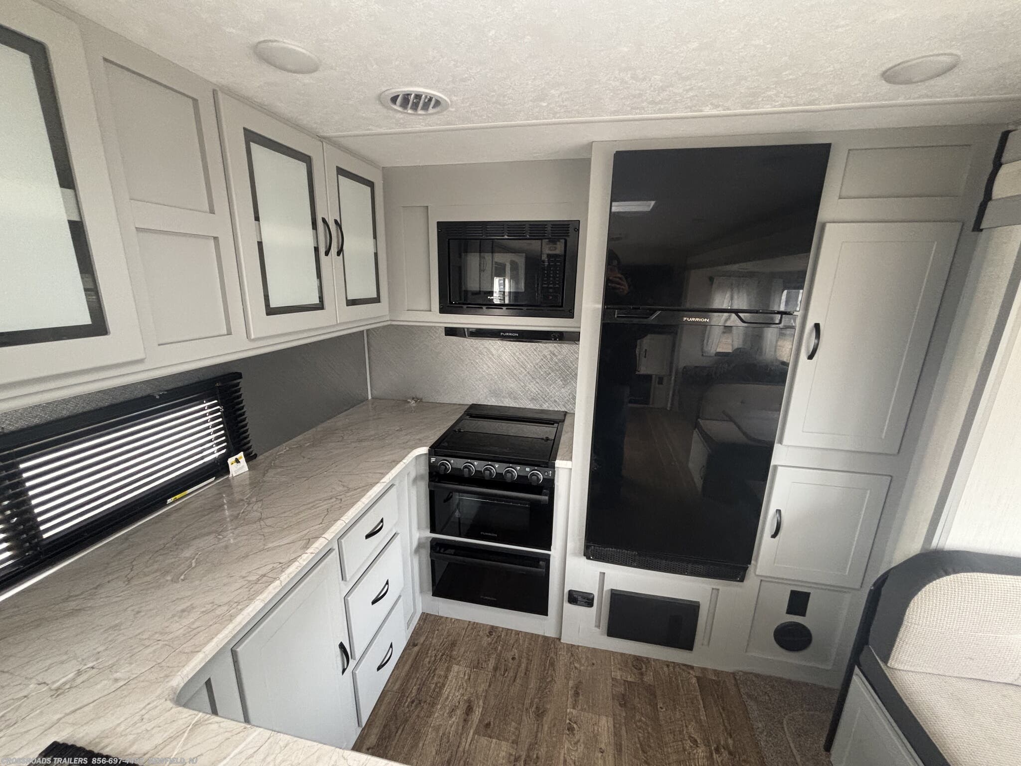 Inside, the Vibe 26RK offers a well-equipped kitchen with a convection microwave, traditional microwave, oven, stove top burner, and a refrigerator to keep meals fresh. It also includes a furnace and a water heater for year-round comfort, along with an auxiliary battery and optional solar panels for extended off-grid adventures. For safety, you’ll find CO and LP detectors, a smoke detector, a fire extinguisher, and a dedicated TV setup to keep everyone entertained after a day on the road.