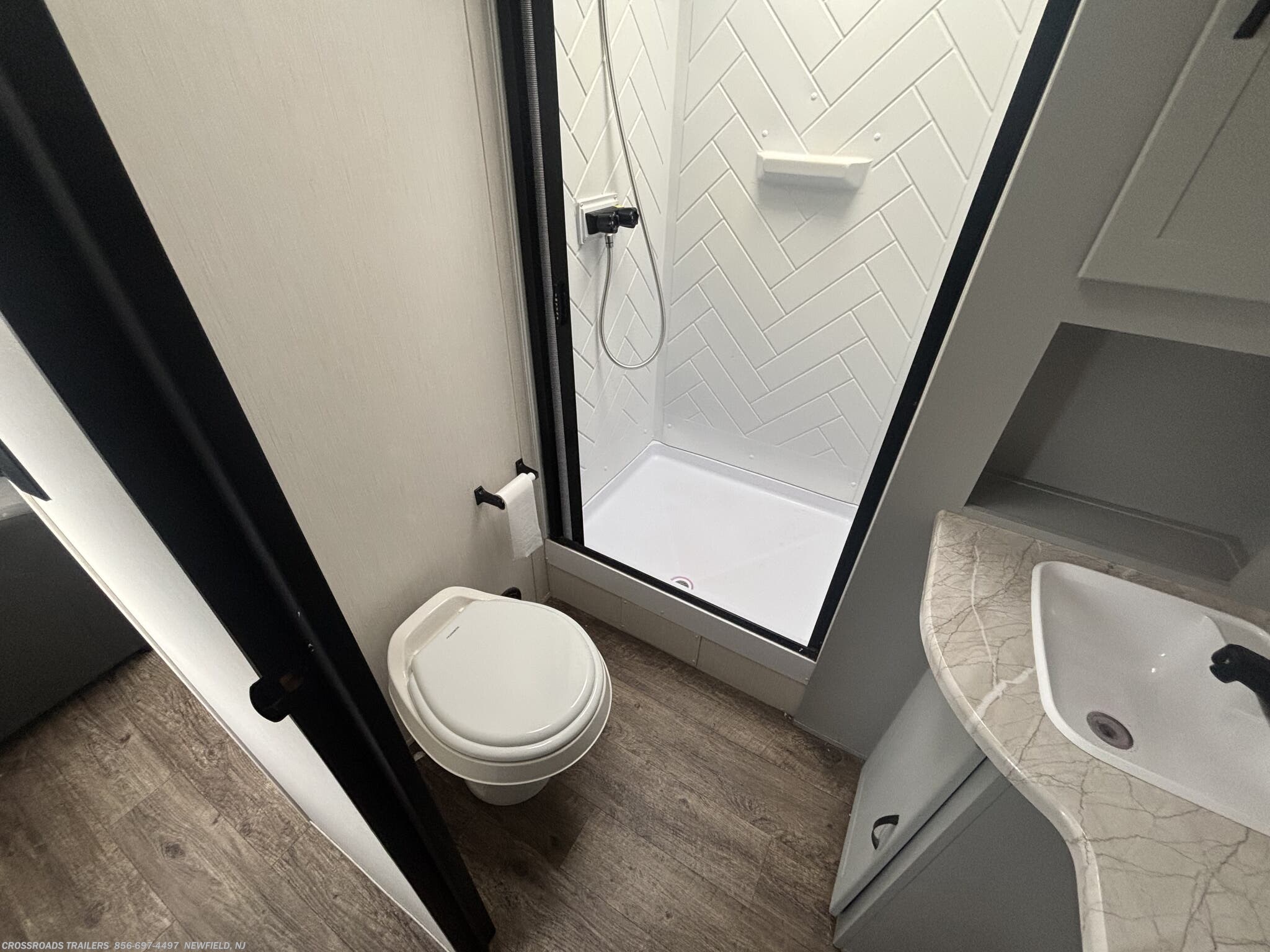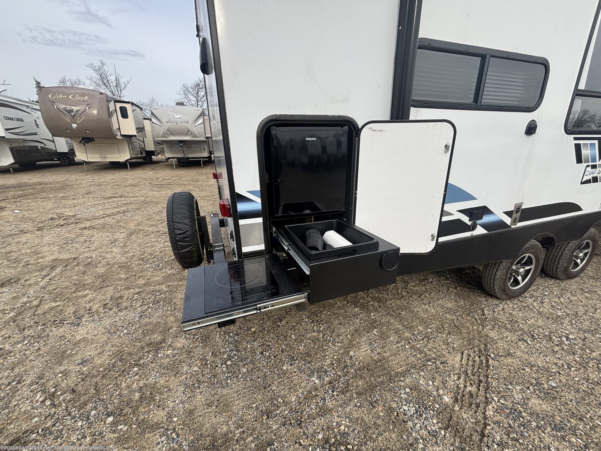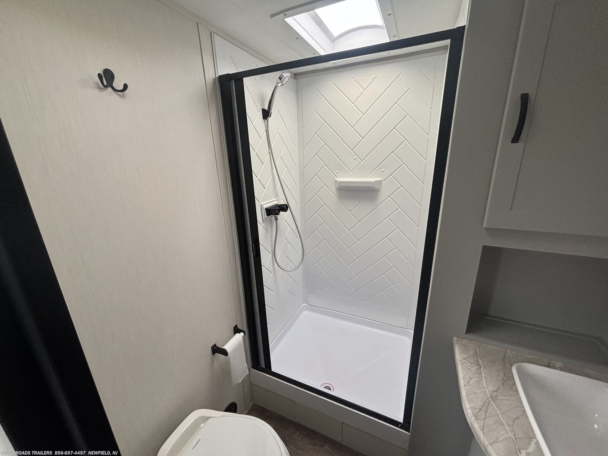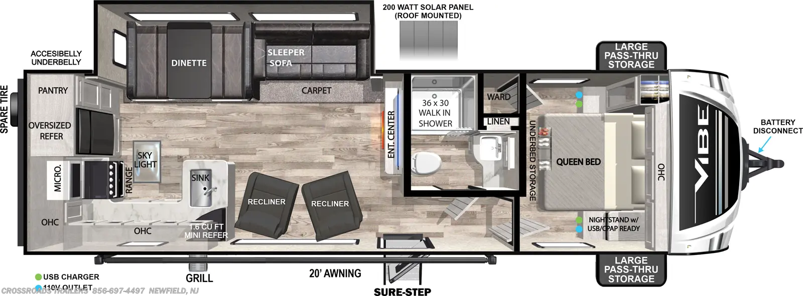 Inside, the Vibe 26RK offers a well-equipped kitchen with a convection microwave, traditional microwave, oven, stove top burner, and a refrigerator to keep meals fresh. It also includes a furnace and a water heater for year-round comfort, along with an auxiliary battery and optional solar panels for extended off-grid adventures. For safety, you’ll find CO and LP detectors, a smoke detector, a fire extinguisher, and a dedicated TV setup to keep everyone entertained after a day on the road.