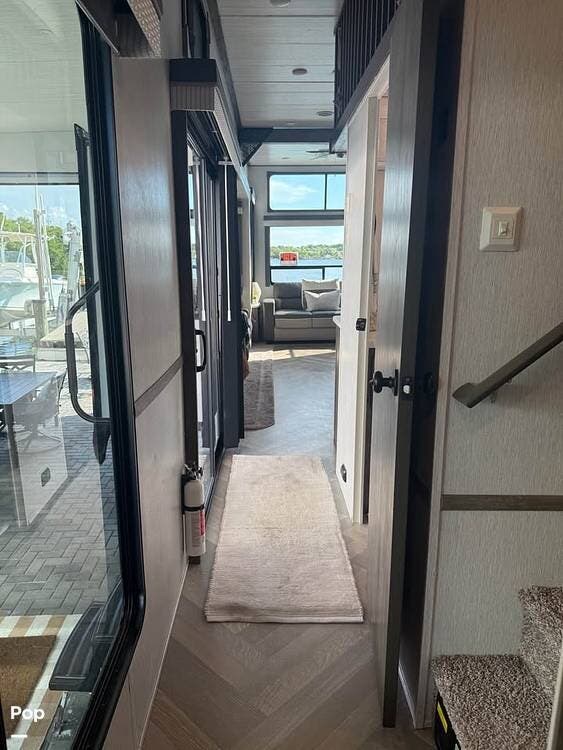 On the outside, it comes with a power awning with LED lighting, exterior speakers, large pass-through storage compartments, dual propane tanks, stabilizer jacks, and heated, enclosed holding tanks.