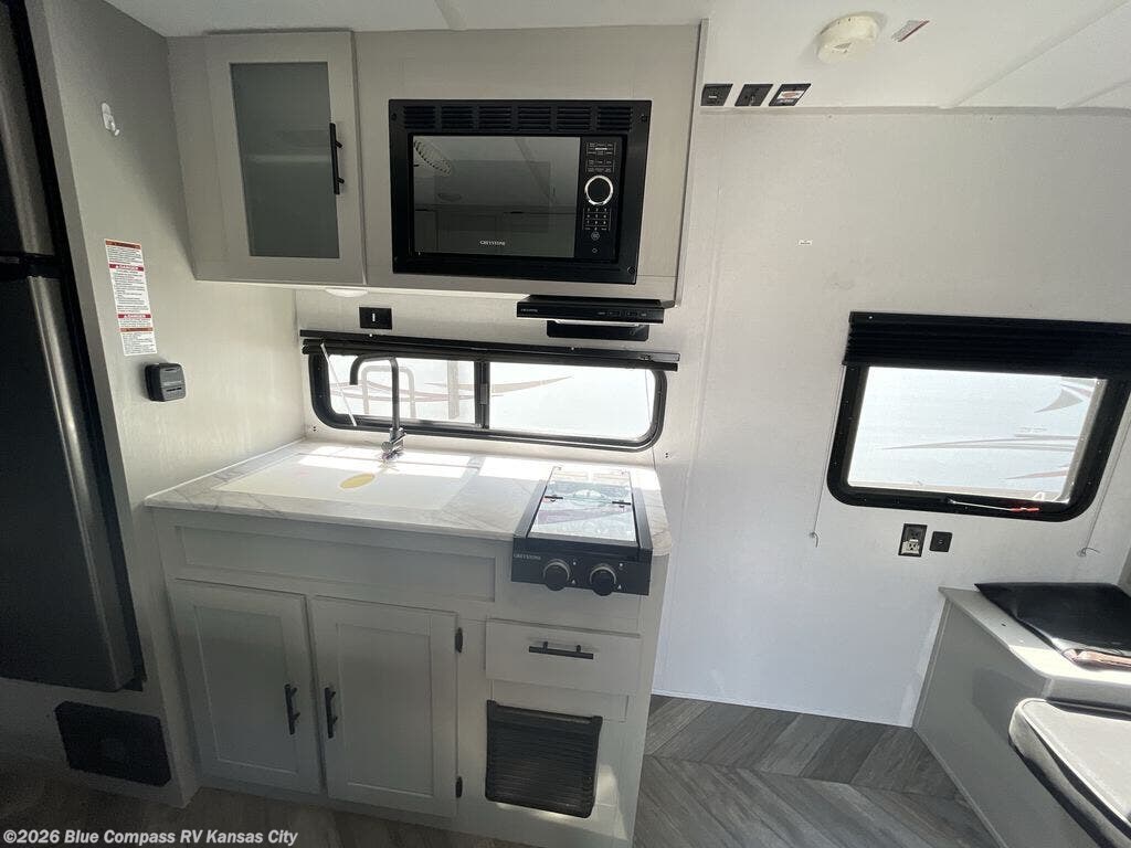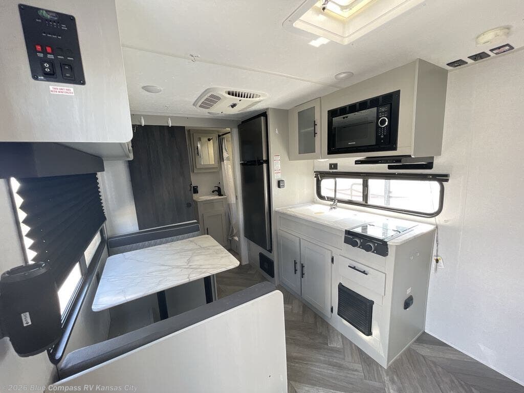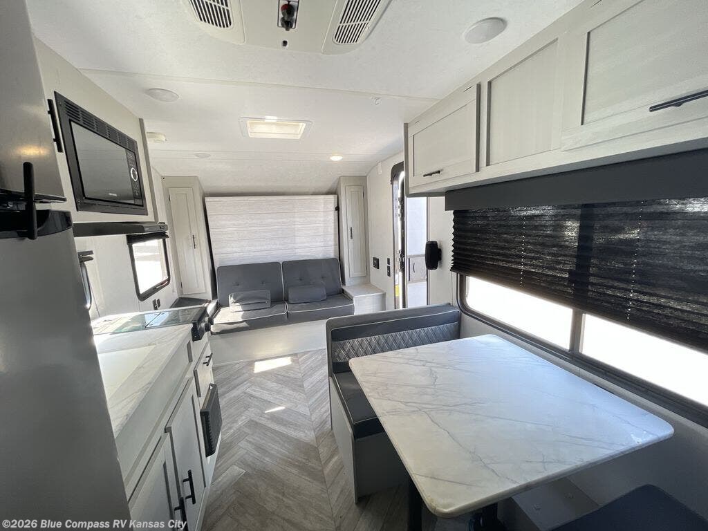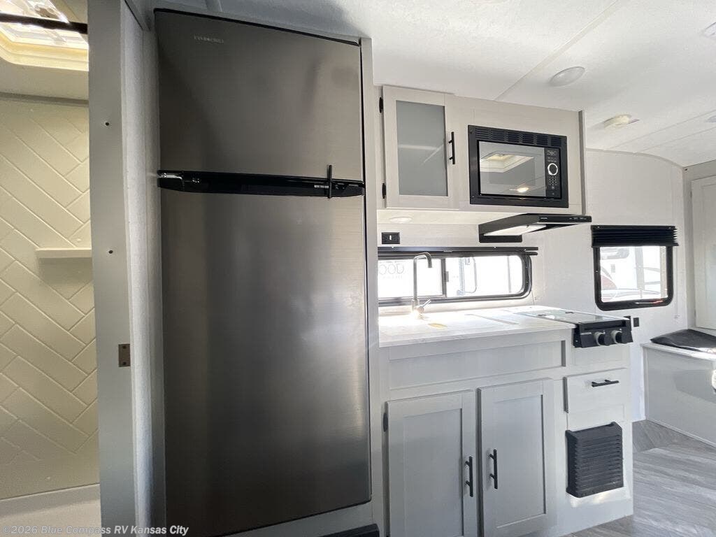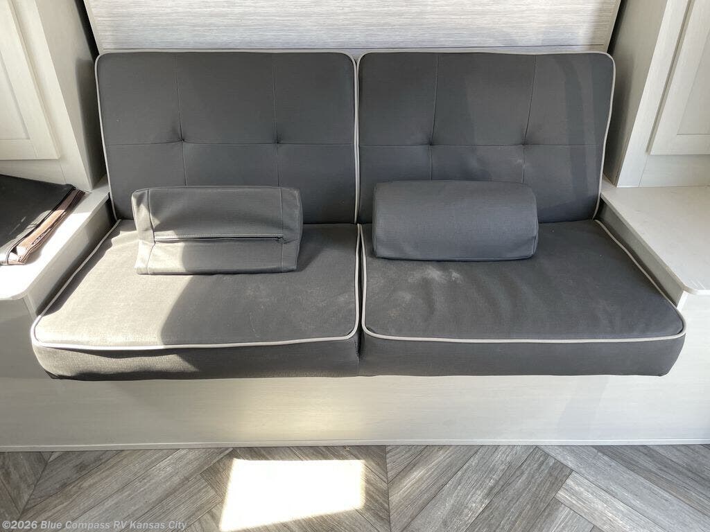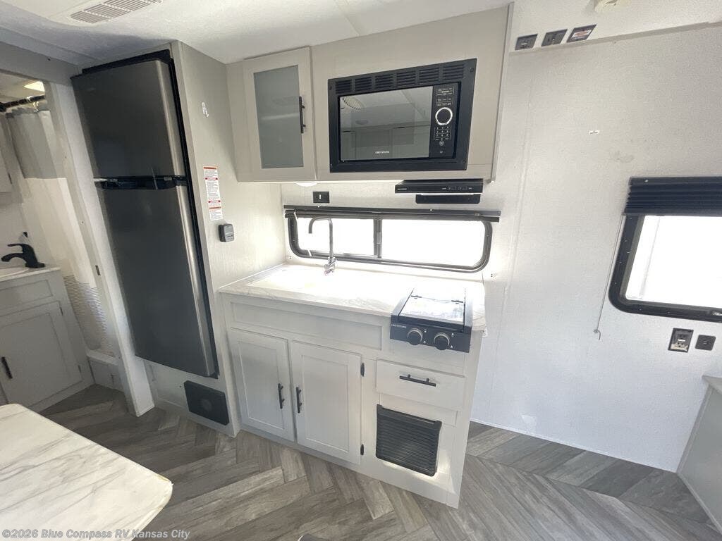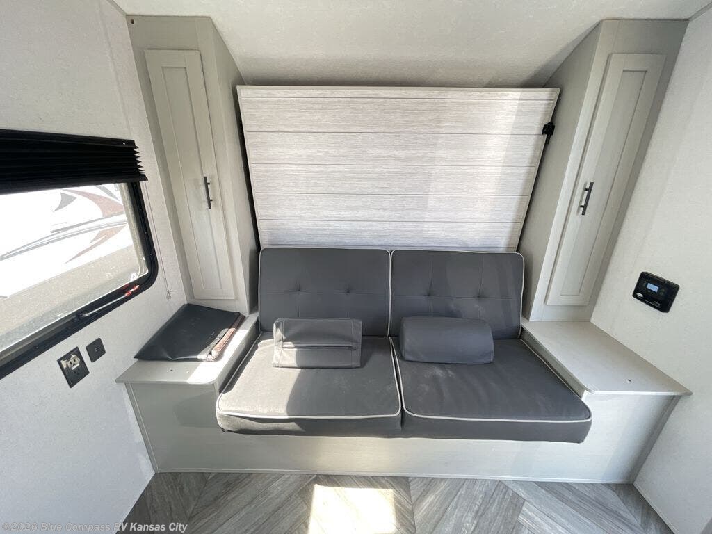 This travel trailer with a full rear bath and versatile sleeping space is your ticket to fun and adventure. While you're putting out the 12' power awning, you can grab a cold drink from the outdoor refrigerator and grab the lawn chairs from the full pass-through storage. There is a two burner cooktop and a microwave oven to prepare your meals in, and a booth dinette to dine at. You'll love the RV queen Murphy bed to sleep on at night, and the sofa with storage to relax on during the day!