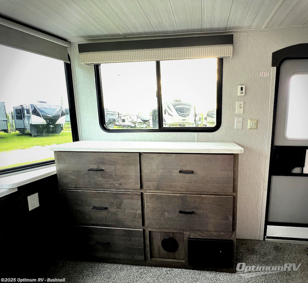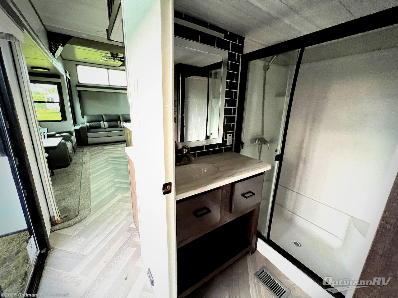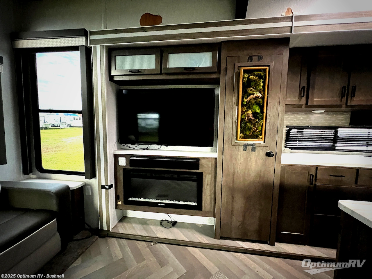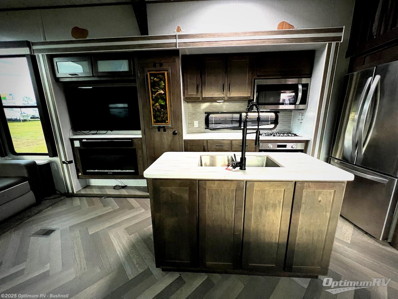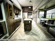 If you just need to get away from the busyness of life and need a little piece of home to escape to, the Forest River Wildwood Grand Lodge destination trailer is your ticket to paradise! The quality construction includes a 12" forged l-beam frame, 5-ply tongue and groove plywood floor decking, bowed truss roof rafters, plus more allowing you to own your trailer for many years to come! The interior is extremely beautiful and spacious with its 96" ceiling, upgraded designer furniture, stainless steel kitchen appliances, and a residential-inspired floating fireplace. The Bluetooth sound bar with a remote will provide endless nights of soothing music, and the ceiling fan in the living room is a residential touch that comes in handy when you don't want to blast the air conditioning to stay cool.