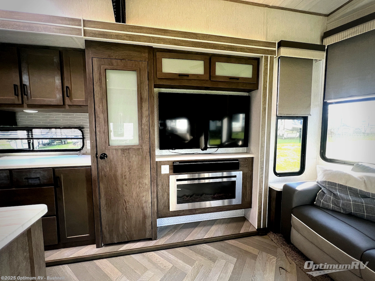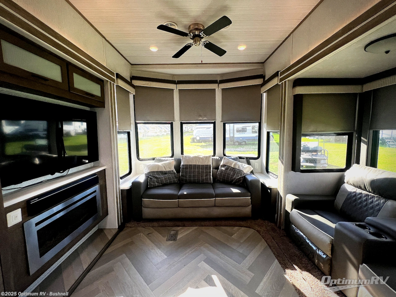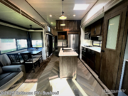 If you just need to get away from the busyness of life and need a little piece of home to escape to, the Forest River Wildwood Grand Lodge destination trailer is your ticket to paradise! The quality construction includes a 12" forged l-beam frame, 5-ply tongue and groove plywood floor decking, bowed truss roof rafters, plus more allowing you to own your trailer for many years to come! The interior is extremely beautiful and spacious with its 96" ceiling, upgraded designer furniture, stainless steel kitchen appliances, and a residential-inspired floating fireplace. The Bluetooth sound bar with a remote will provide endless nights of soothing music, and the ceiling fan in the living room is a residential touch that comes in handy when you don't want to blast the air conditioning to stay cool.