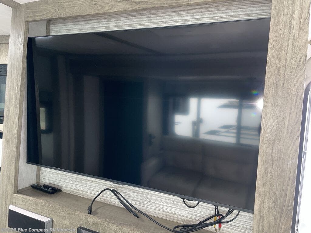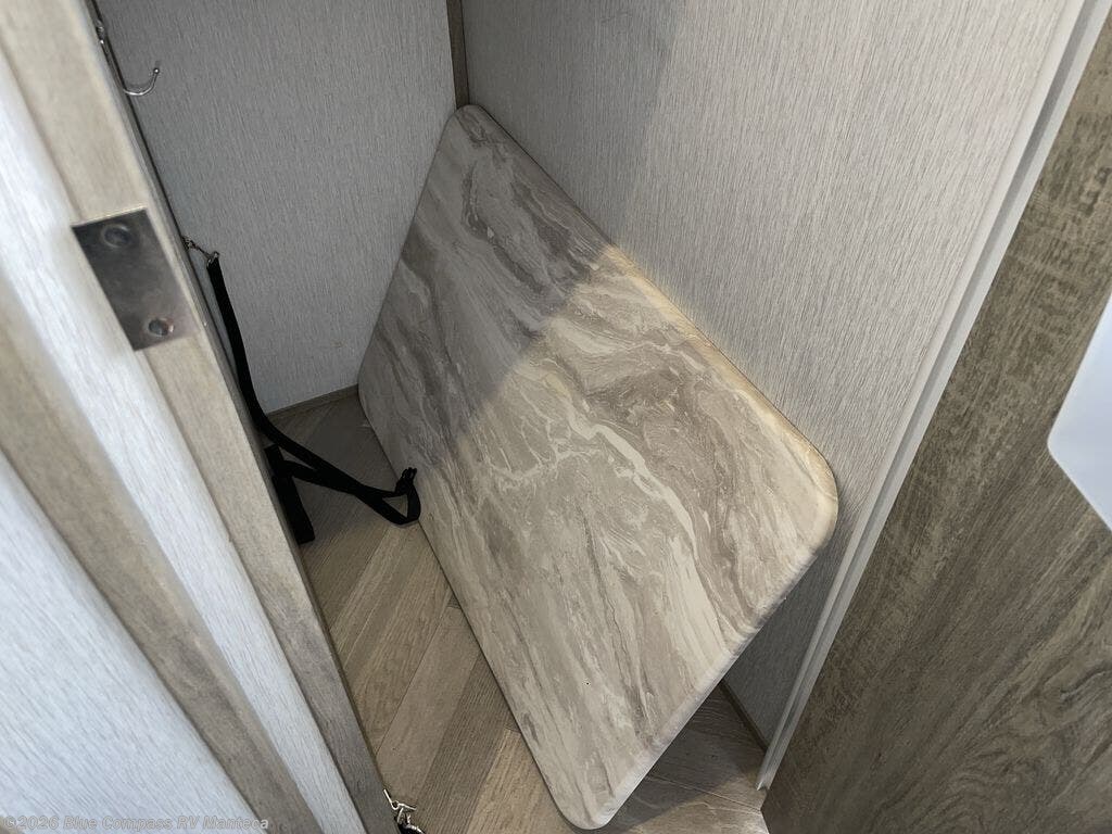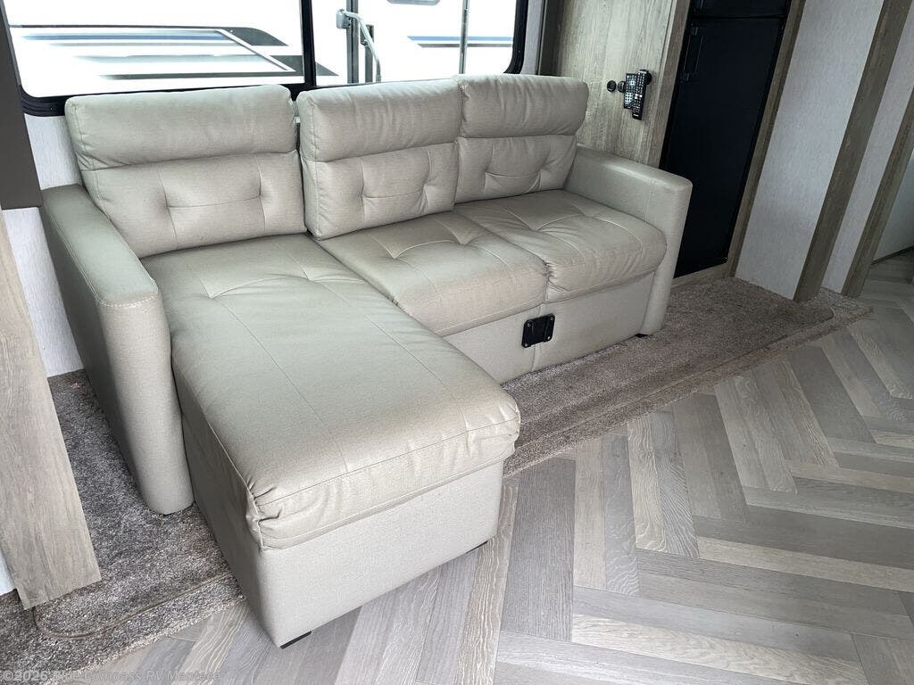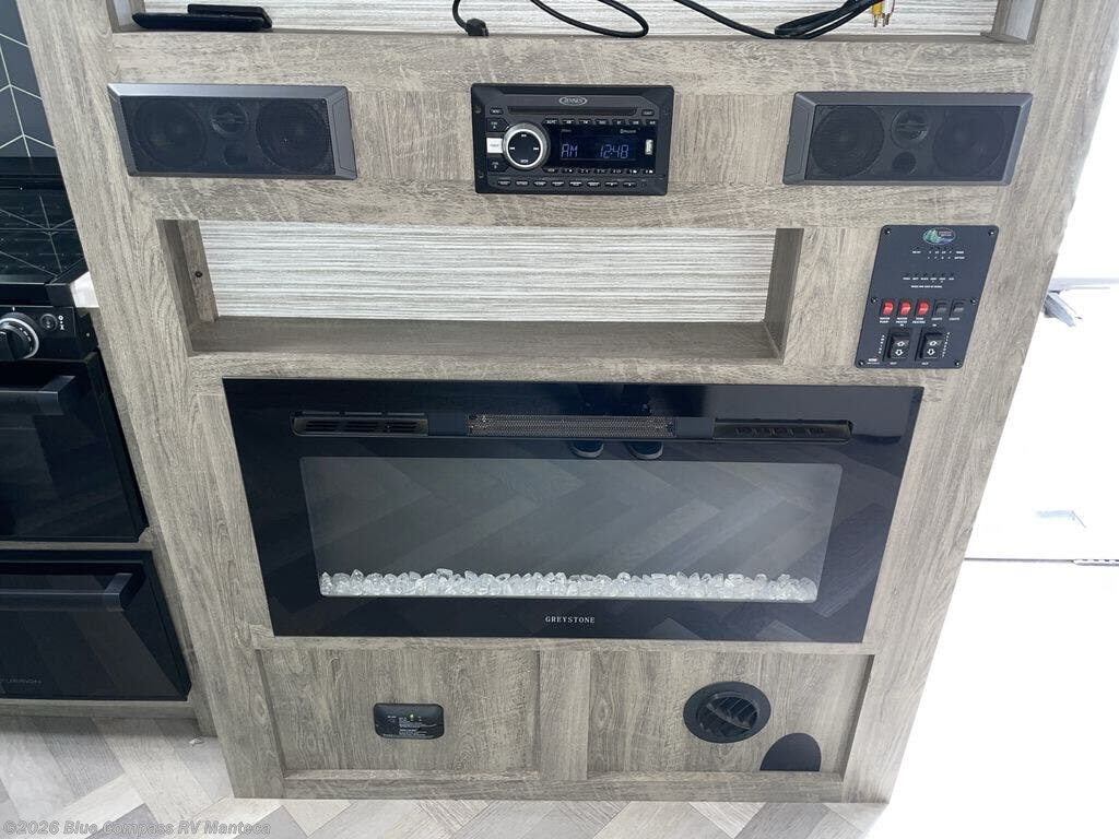 If you like to be different, this couples trailer offers a tri-fold sofa with chaise lounge extension and a removable table that you can relax on and dine at. There is also a 32" LED TV and a fireplace right across from the lounge seat for perfect viewing. The kitchen has full amenities including a residential refrigerator and walk-in pantry. The rear bath offers a walk-in shower with a skylight for more natural lighting, a large linen cabinet for all your essentials, a wardrobe and everything else you need to stay refreshed and clean without having to use the public facilities. The front bedroom offers a space savings door, a queen bed and dual wardrobes with mirrors. You will also find a Texas-sized pass-through compartment outside for the outdoor gear such as camping chairs, charcoal, and such.