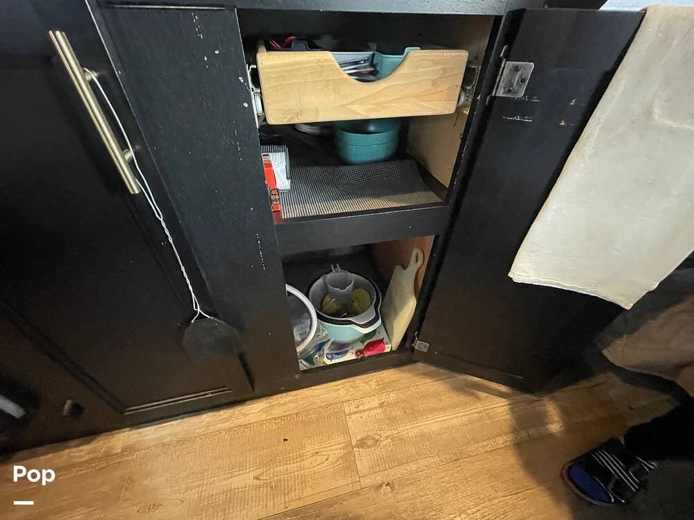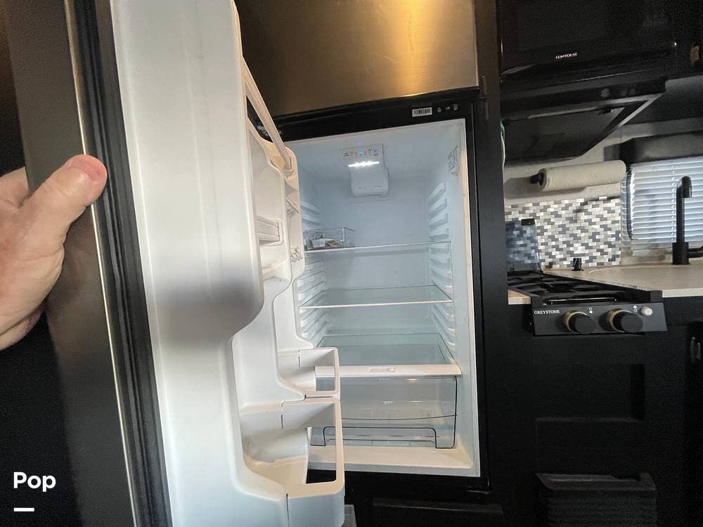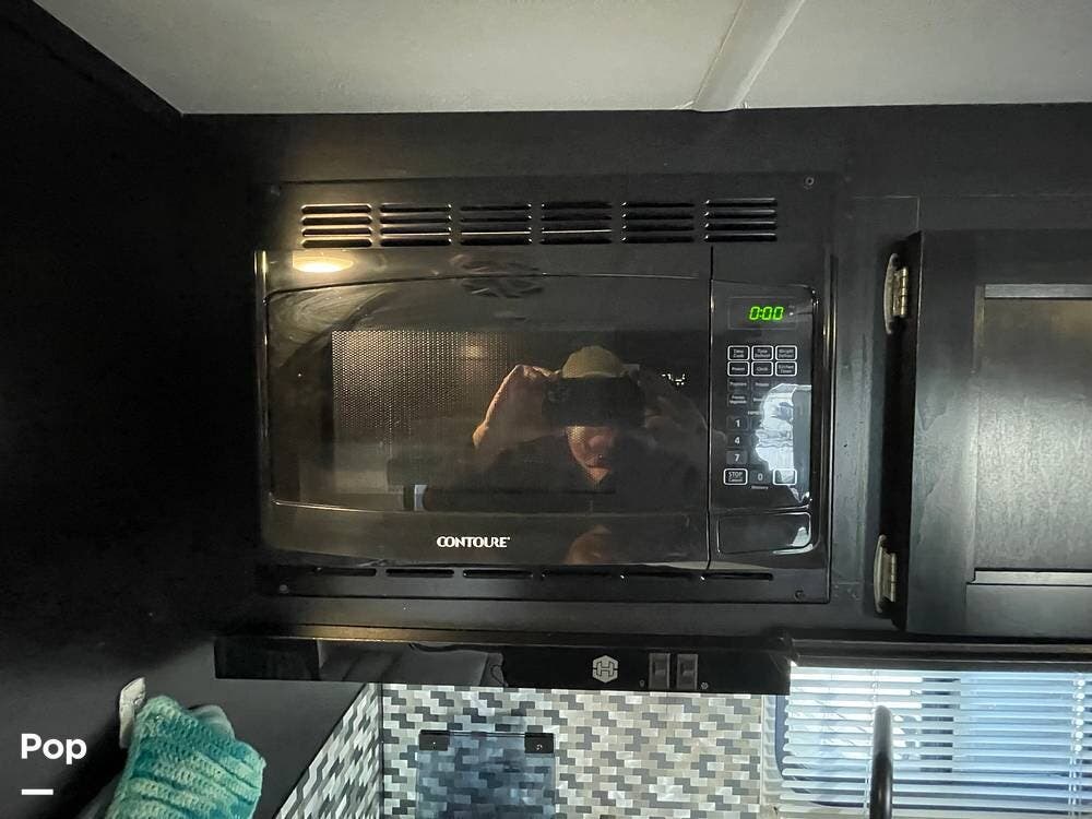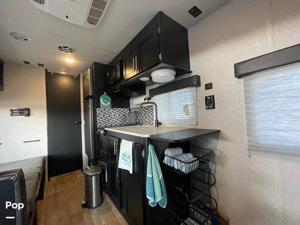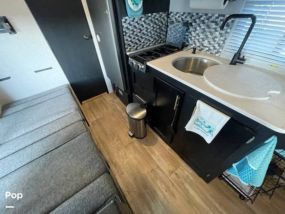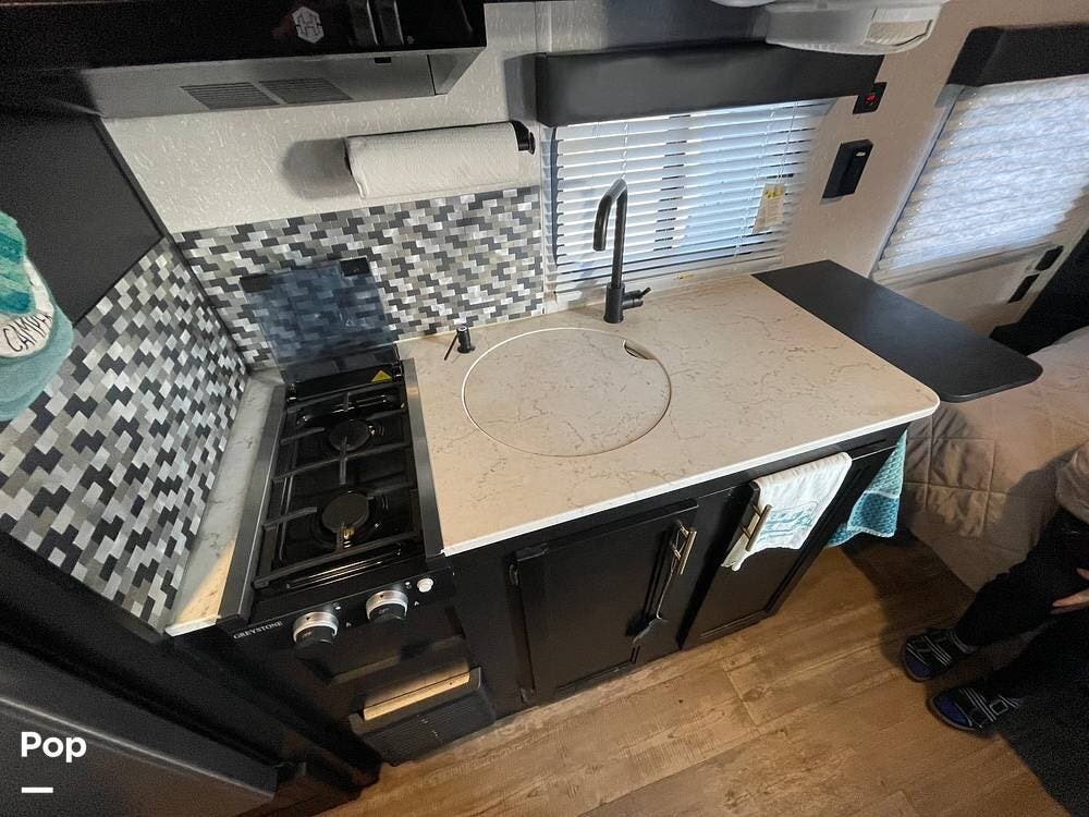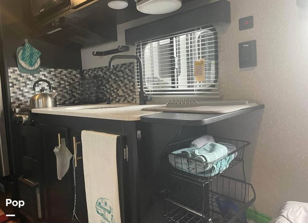This RV sleeps three, with a fold-down sofa sleeper queen and a comfy dinette sleeper. Its kitchen has a mid-sized freezer fridge, a 2-burner stove, a microwave, and a large circular kitchen sink. The huge window lets you watch the sunset or any outside activities while dining. A large power awning with LED lighting also works smoothly and quietly.