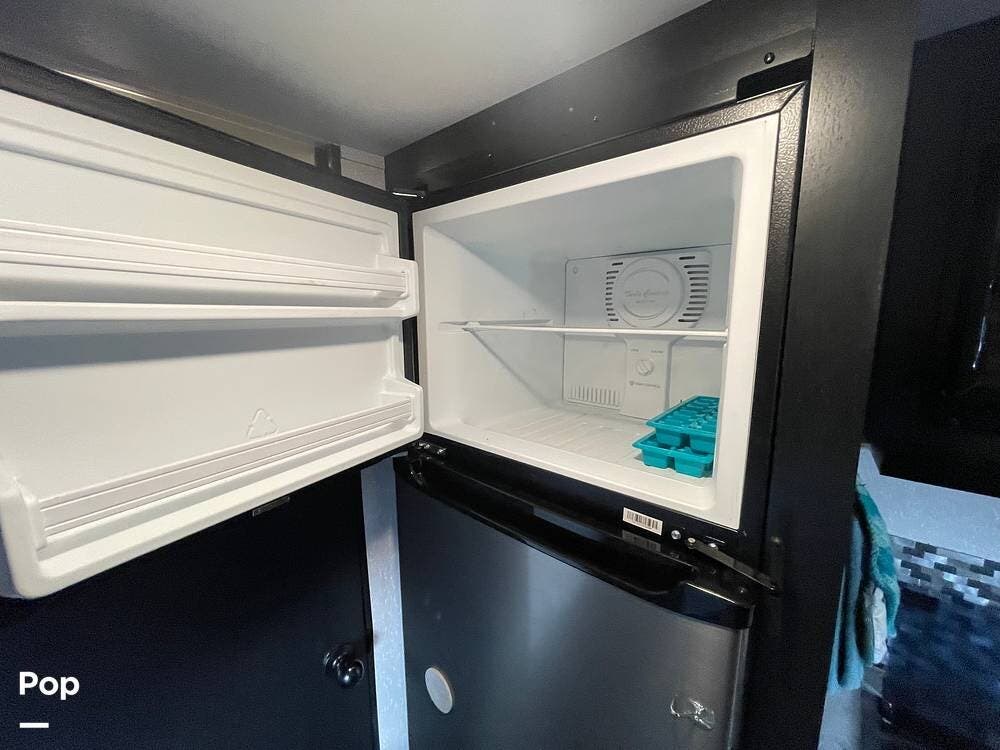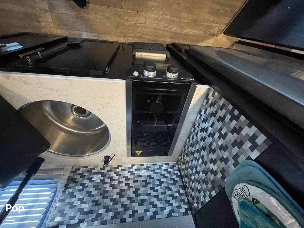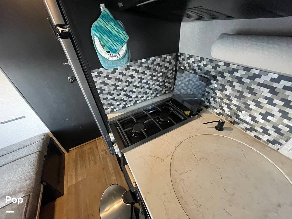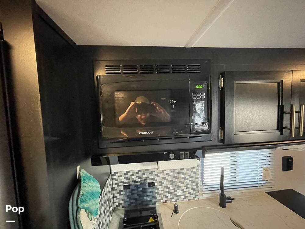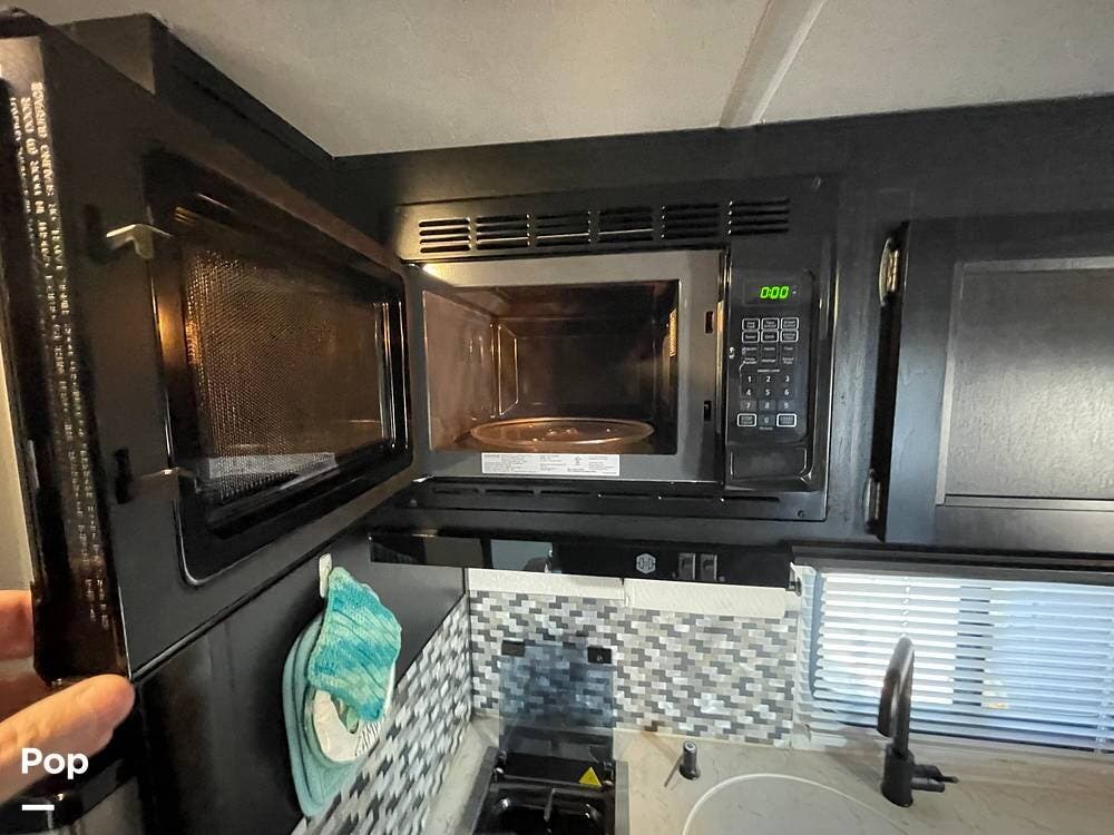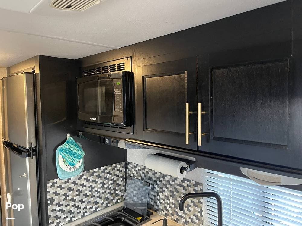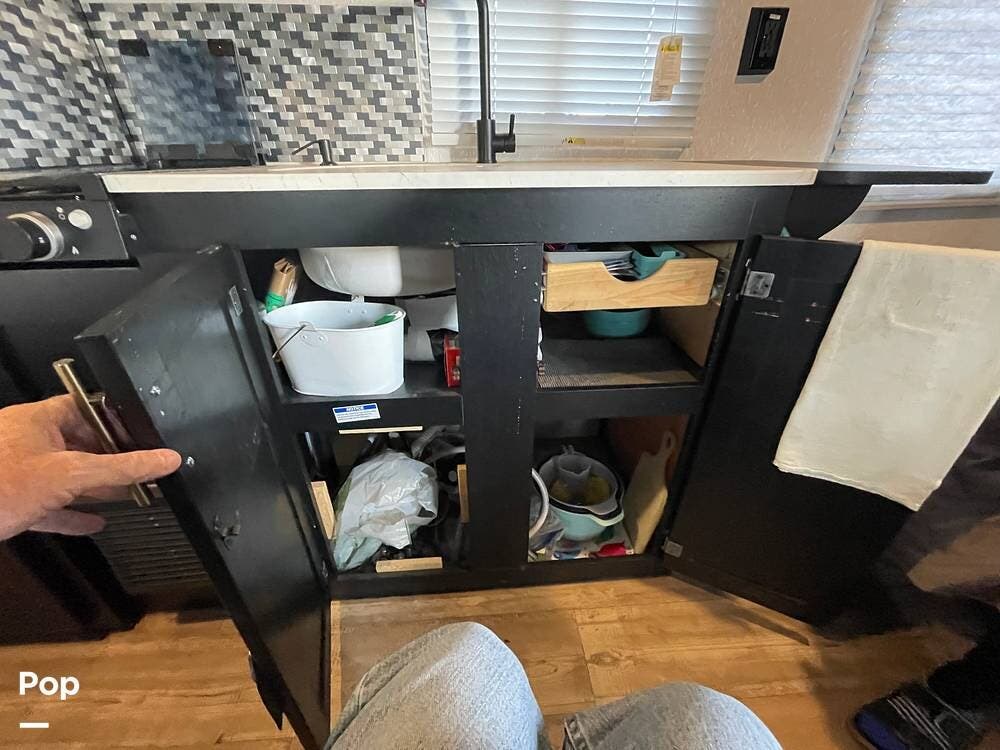 This RV sleeps three, with a fold-down sofa sleeper queen and a comfy dinette sleeper. Its kitchen has a mid-sized freezer fridge, a 2-burner stove, a microwave, and a large circular kitchen sink. The huge window lets you watch the sunset or any outside activities while dining. A large power awning with LED lighting also works smoothly and quietly.