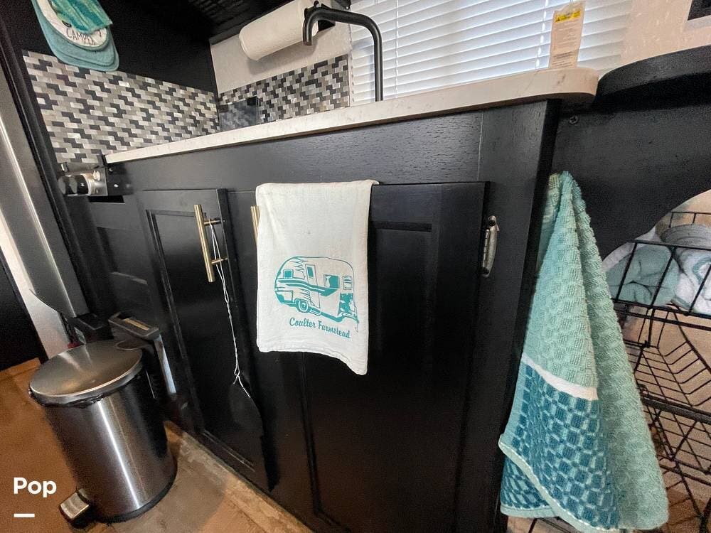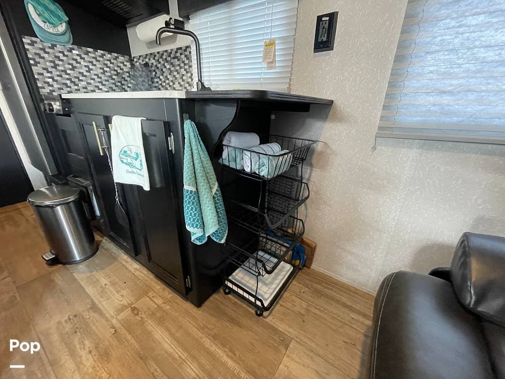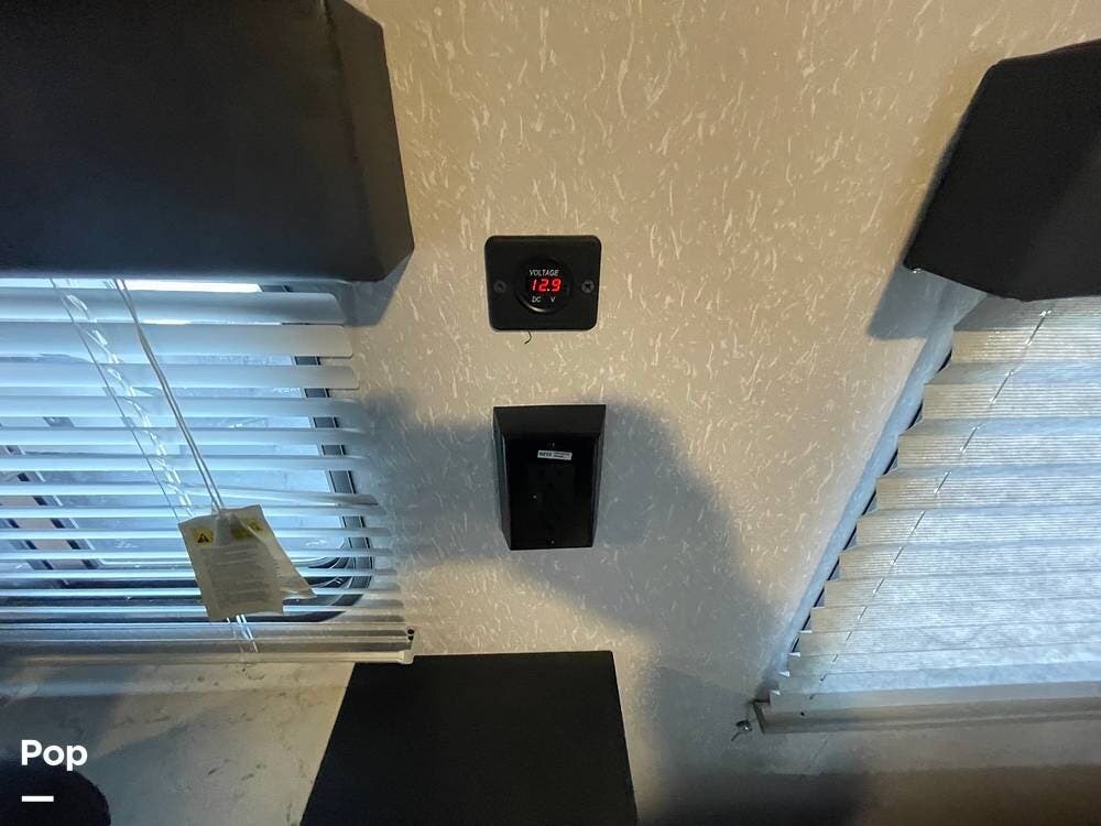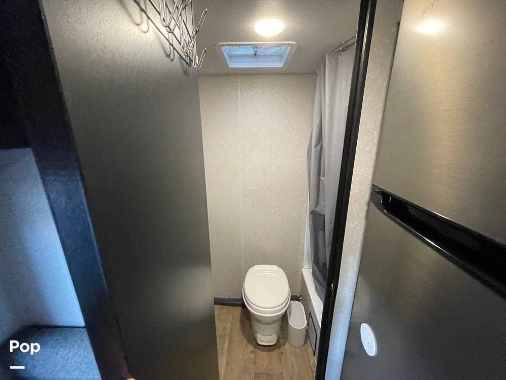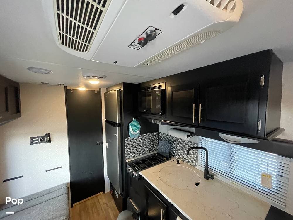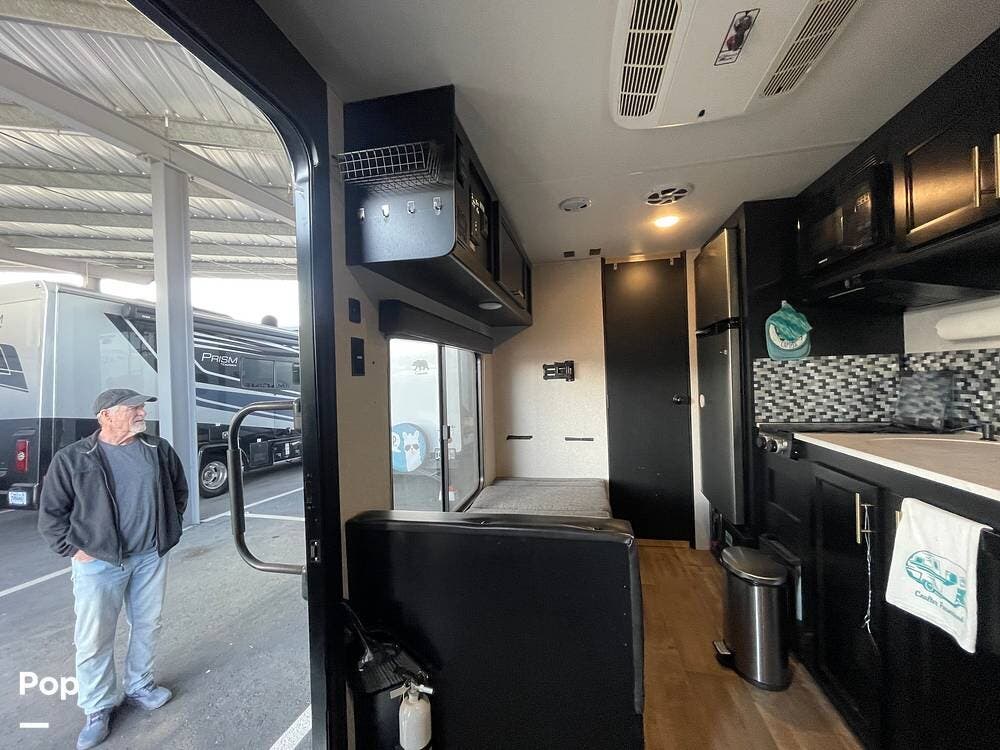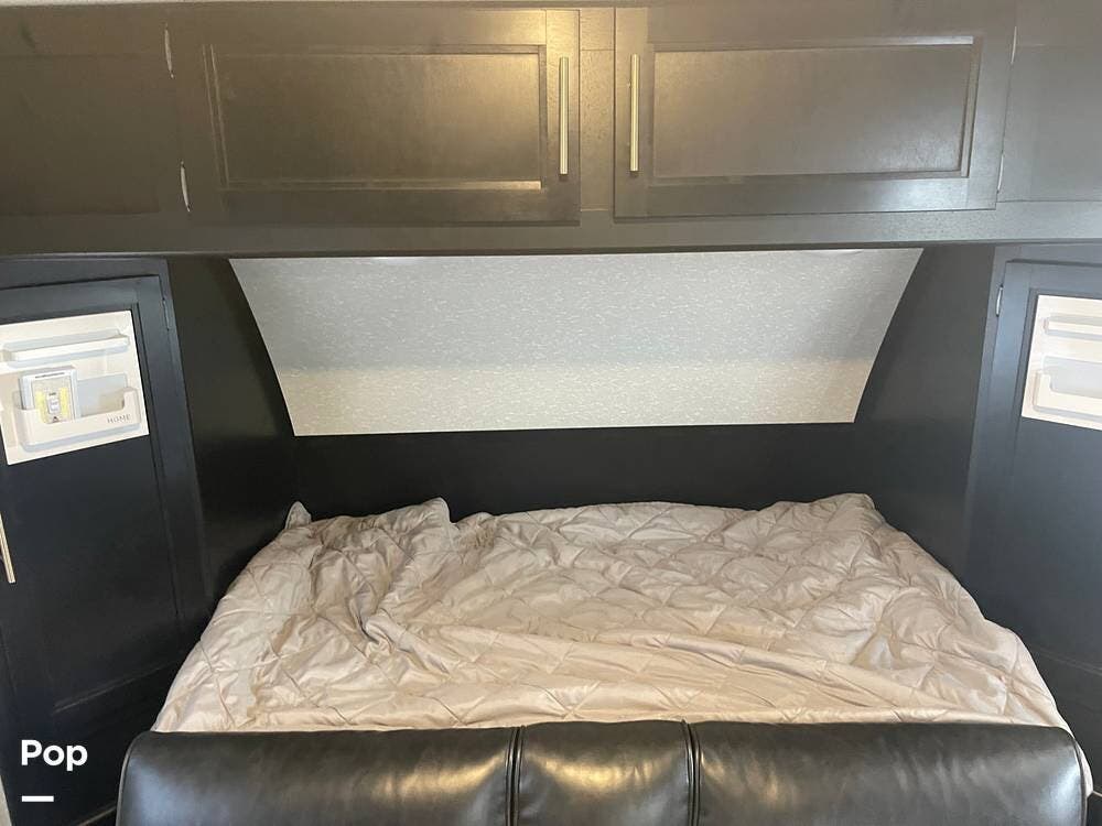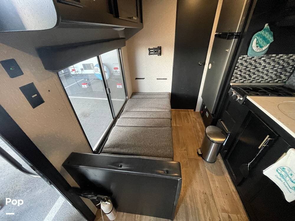 This RV sleeps three, with a fold-down sofa sleeper queen and a comfy dinette sleeper. Its kitchen has a mid-sized freezer fridge, a 2-burner stove, a microwave, and a large circular kitchen sink. The huge window lets you watch the sunset or any outside activities while dining. A large power awning with LED lighting also works smoothly and quietly.