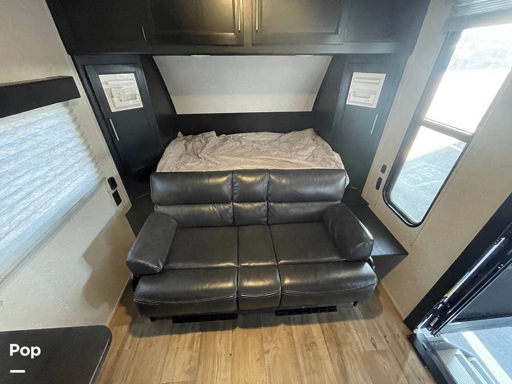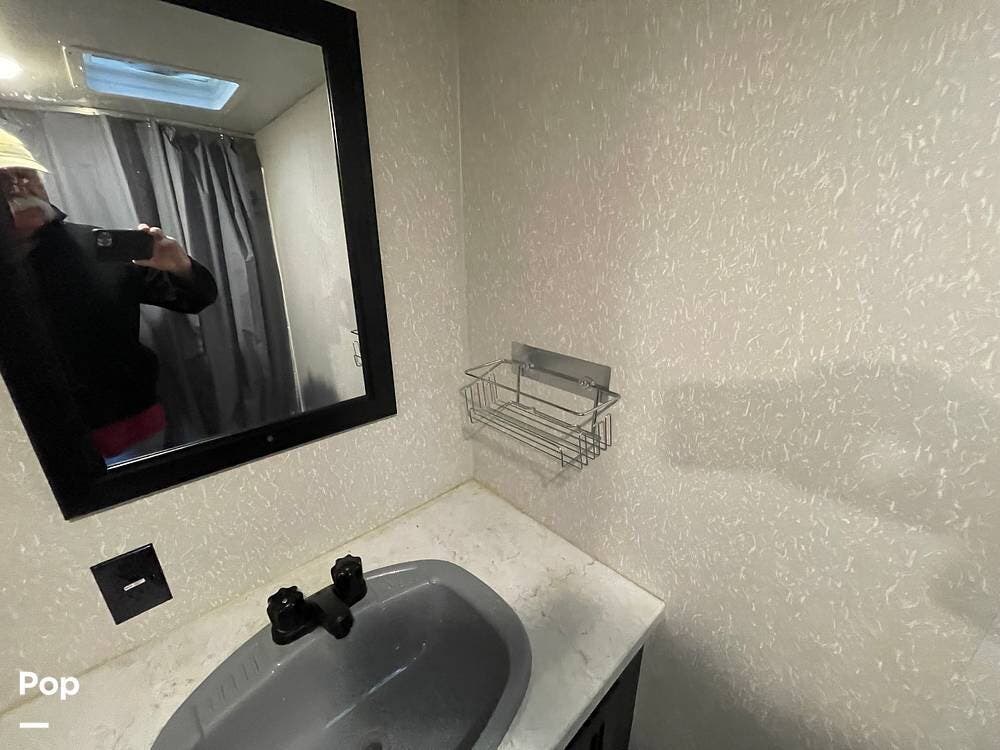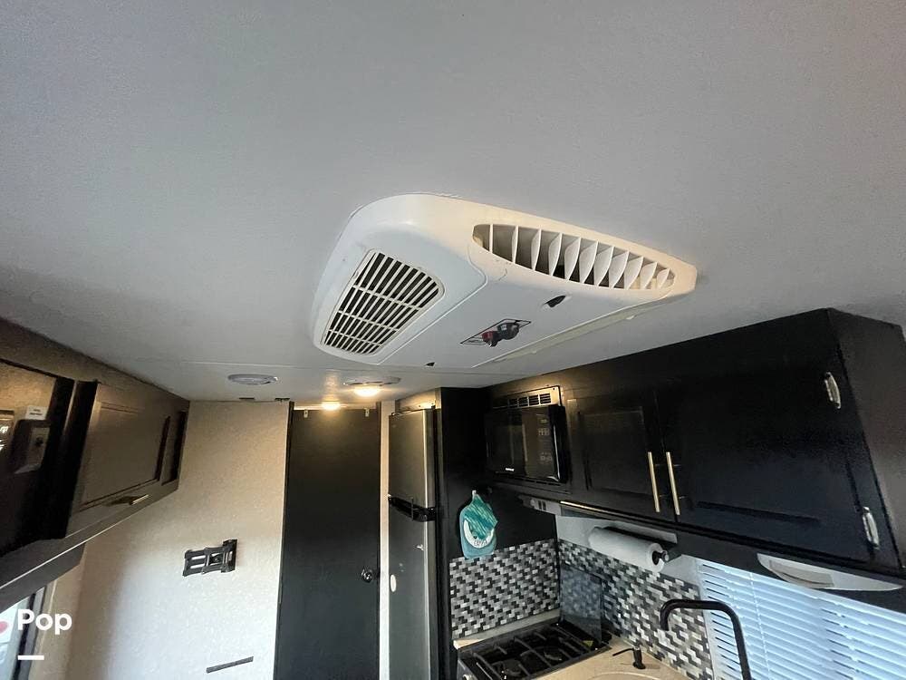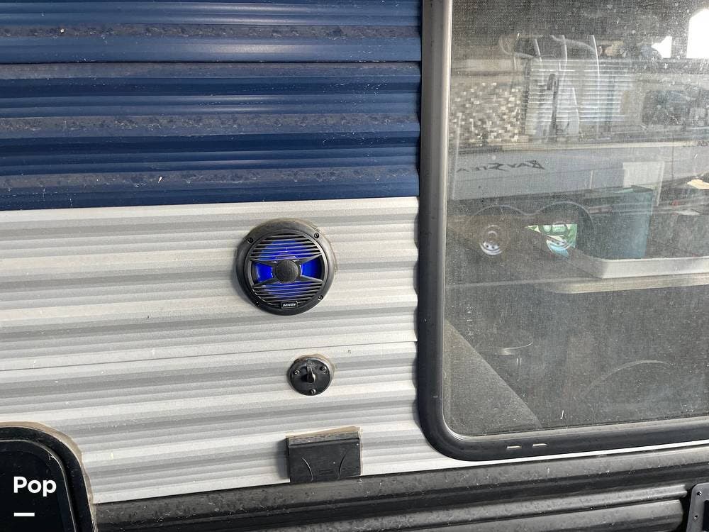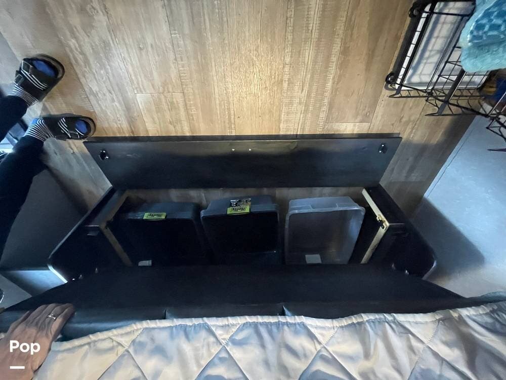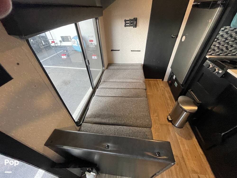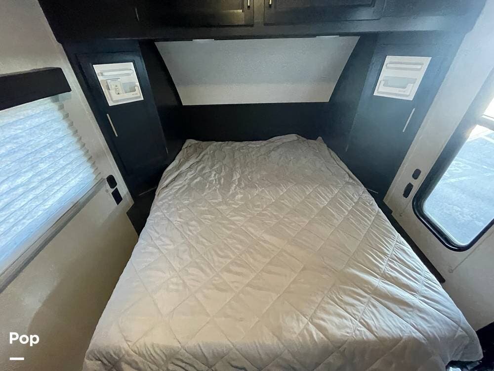 This RV sleeps three, with a fold-down sofa sleeper queen and a comfy dinette sleeper. Its kitchen has a mid-sized freezer fridge, a 2-burner stove, a microwave, and a large circular kitchen sink. The huge window lets you watch the sunset or any outside activities while dining. A large power awning with LED lighting also works smoothly and quietly.