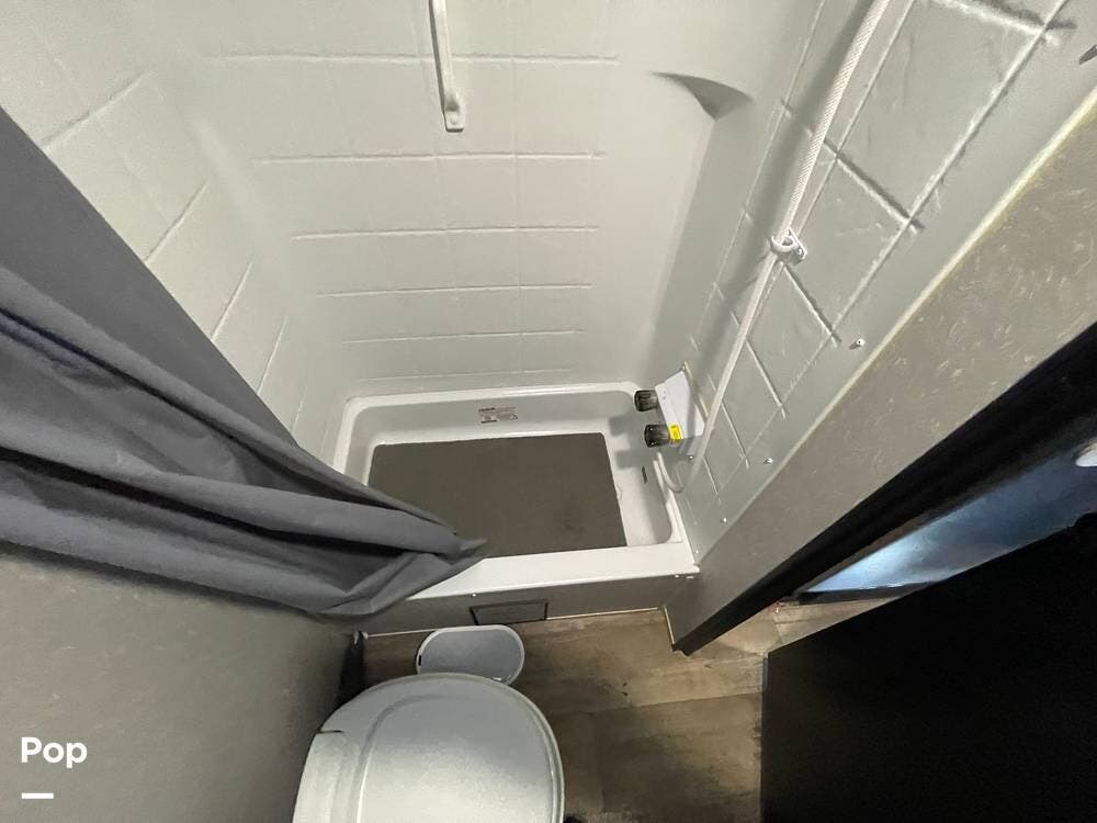 This Wolf Pup has a solar panel to keep the battery hot while going down the road or parked in the sun, but it needs to be plugged in to run the A/C. It has a full bath with a large shower.