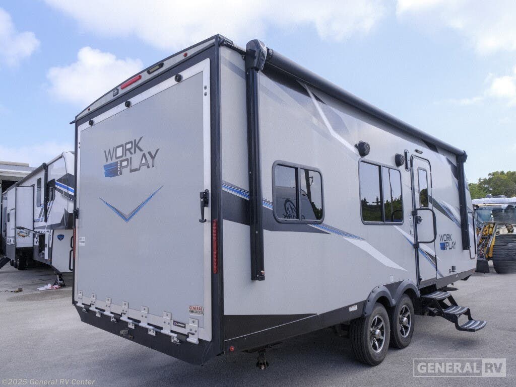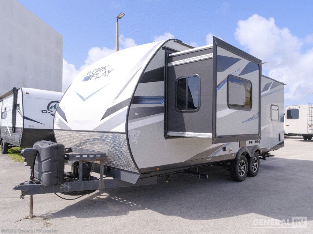 Experience the perfect blend of adventure and comfort with the 2022 Forest River Work and Play 21LT. This versatile toy hauler is designed to accommodate both your need for excitement and relaxation. Its spacious 13' 8" garage provides ample room for your favorite outdoor toys, while the cleverly designed interior ensures you and your companions can unwind in style after a day of exploration. The 60" x 80" queen bed offers a cozy retreat, and the convertible sleeping area ensures everyone has a place to rest. The heart of this RV features a well-equipped center kitchen, complete with a three-burner cooktop and a mid-size refrigerator that runs on both electric and propane. With a 98-gallon fresh water capacity and a 19-foot powered retractable awning, you're set for extended stays under the stars. The rear living area, highlighted by roll-over sofas and an entertainment center, transforms effortlessly from day to night, making it ideal for both socializing and relaxation. Whether you're hitting the road for a weekend getaway or an extended journey, the Work and Play 21LT is ready to make every trip an unforgettable adventure. For more details or to see this model in person, visit your nearest General RV dealership.
