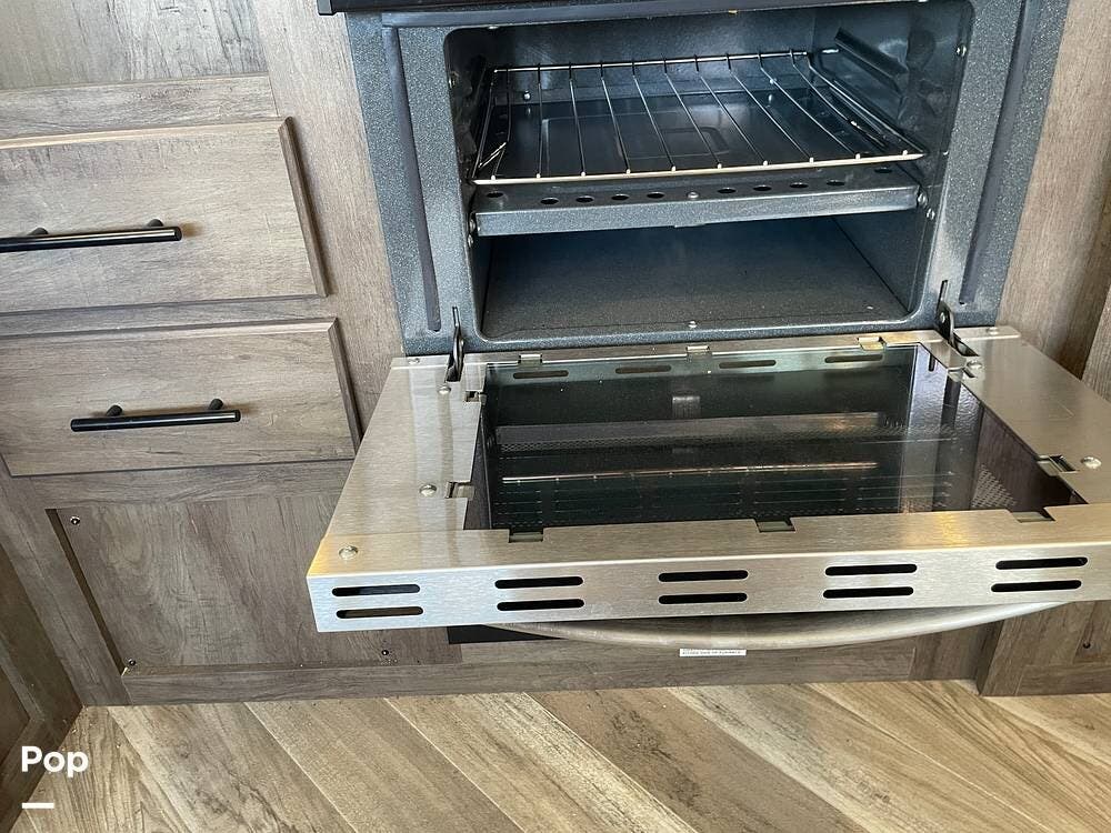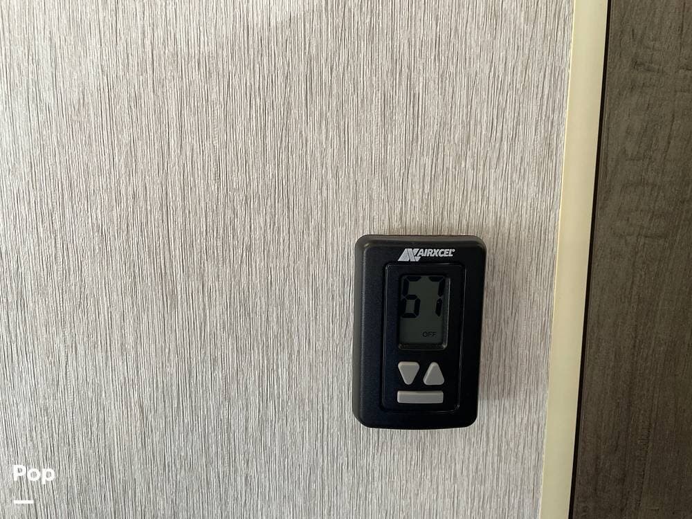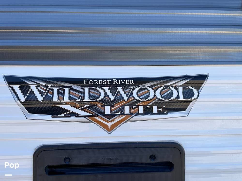 This Wildwood X-Lite model features modern amenities to enhance your camping experience. Stay comfortable year-round with the heating and cooling system. The exterior features a power awning, outdoor speakers, and an outdoor kitchen, perfect for enjoying the great outdoors.