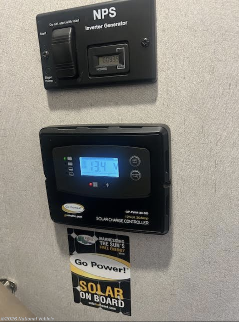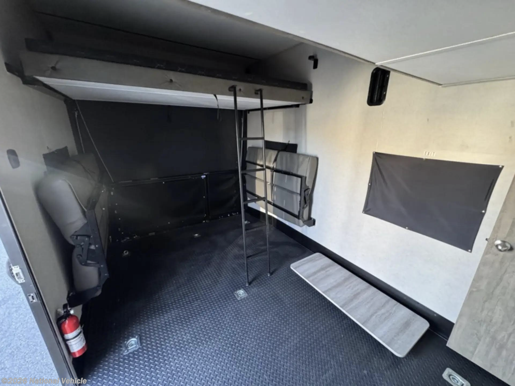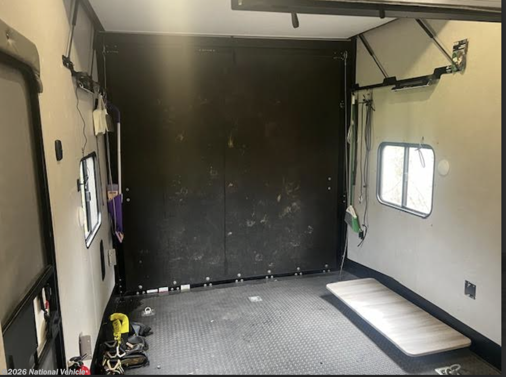 Built to hauling perfection, this triple-axle beast can handle up to 5,000 lbs in the garage, and the extra axle makes a huge difference in stability and capacity. A 30-gallon fueling station keeps your toys powered, while the Onan 5.5kW generator, solar with two batteries, and basement heater let you camp off-grid in style.