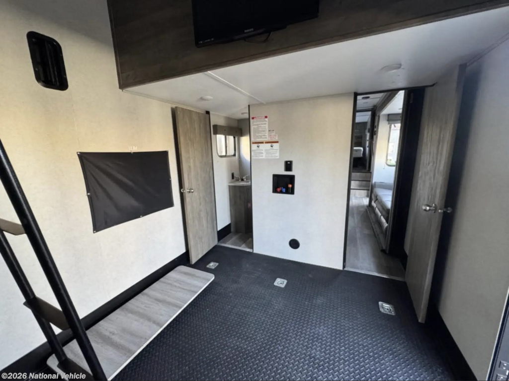 Inside, you?ll find a king bedroom, theater seating in the living room, loft bed/storage area, twin beds, and a drop-down queen in the garage, sleeping the whole gang. The 1? baths, solid-surface countertops, stove, oven, microwave, and washer/dryer hookup make this feel more like a luxury condo than a toy hauler.