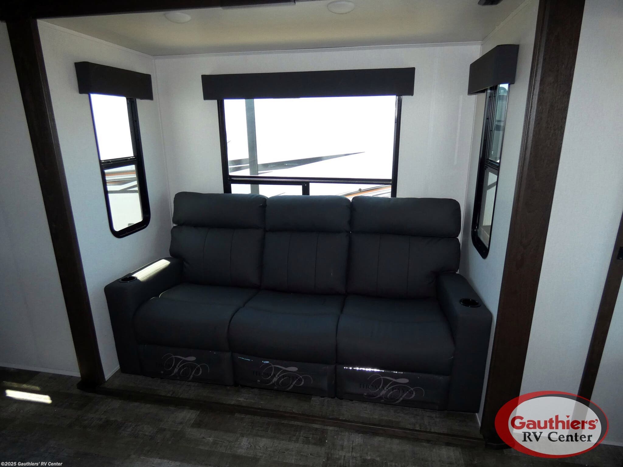 SINGLE SLIDE TOY HAULER TRAVEL TRAILER W/ POWER AWNING, FIREPLACE, REAR PATIO, TWO A/C UNITS, AND TIRE PRESSURE MONITORING SYSTEM.