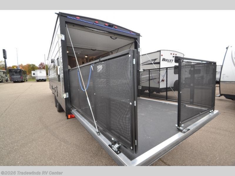 Dual entry doors in this travel trailer will make camping at your favorite state park easier than ever. Once your toys are unloaded, set up the patio deck for a cold drink. There is also Sit N Sleep sofas here and a Sleep N Store manual bed system for your guests to sleep on. Step into the walk-through bath to freshen up, then head to the full kitchen to prepare lunch on the three burner cooktop. You can relax on the theater sofa slide out, or take your plate outdoors to sit under the 15' power awning with LED lights. The RV queen bed in the front private bedroom will be calling your name after a day of fun, while your guests sleep in the separate garage. You can't beat this travel trailer!