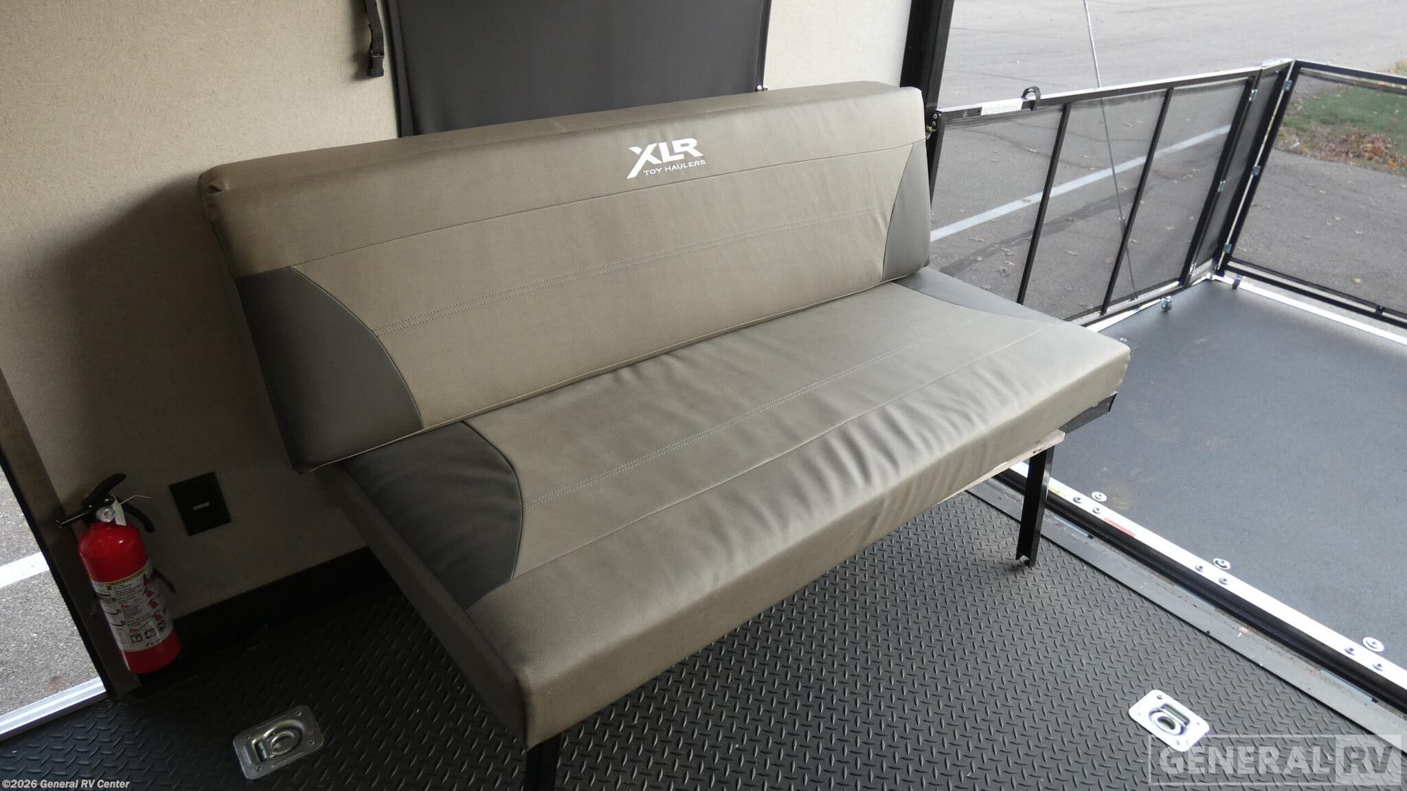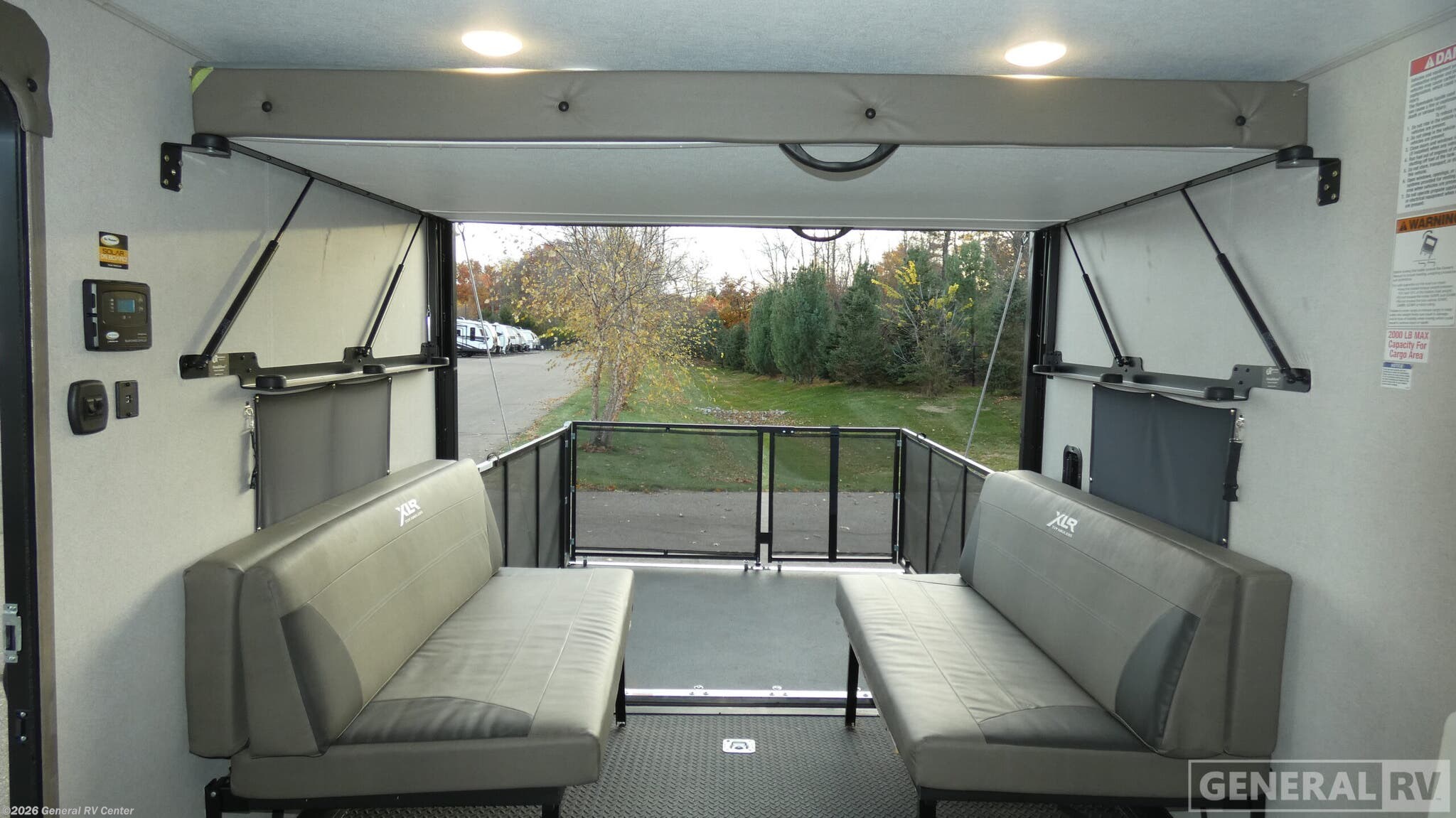 Forest River XLR Micro Boost toy hauler 27LRLE highlights: 11' Separate Garage 5,000 BTU Fireplace RV Queen Bed 190W Solar Panel Three Burner Cooktop 5,000 LB. D-Rings Dual entry doors in this travel trailer will make camping at your favorite state park easier than ever. Once your toys are unloaded, set up the patio deck for a cold drink. There is also Sit N Sleep sofas here and a Sleep N Store manual bed system for your guests to sleep on. Step into the walk-through bath to freshen up, then head to the full kitchen to prepare lunch on the three burner cooktop. You can relax on the theater sofa slide out, or take your plate outdoors to sit under the 15' power awning with LED lights. The RV queen bed in the front private bedroom will be calling your name after a day of fun, while your guests sleep in the separate garage. You can't beat this travel trailer! Each XLR Micro Boost toy hauler is made to last through years of use thanks to the seamless PVC roof system, the diamond plate front rock guard, and the Body Armor enclosed and insulated underbelly. You will appreciate the oil and gas resistant residential linoleum and the moisture barrier floor enclosure to keep your space clean, and the lightweight design will be perfect for smaller tow vehicles. Each model includes residential stainless steel sinks, decorative kitchen backsplash, solid core cabinet stiles, and large panoramic windows for breathtaking outdoor views. The exterior includes many convenient features to make camping easier than ever, including a pet leash for your furry friends, insulated storage doors, a hot and cold exterior shower, plus a friction hinge entry door. There is even a power awning with blue LED lights and two exterior speakers for the ultimate outdoor living space.