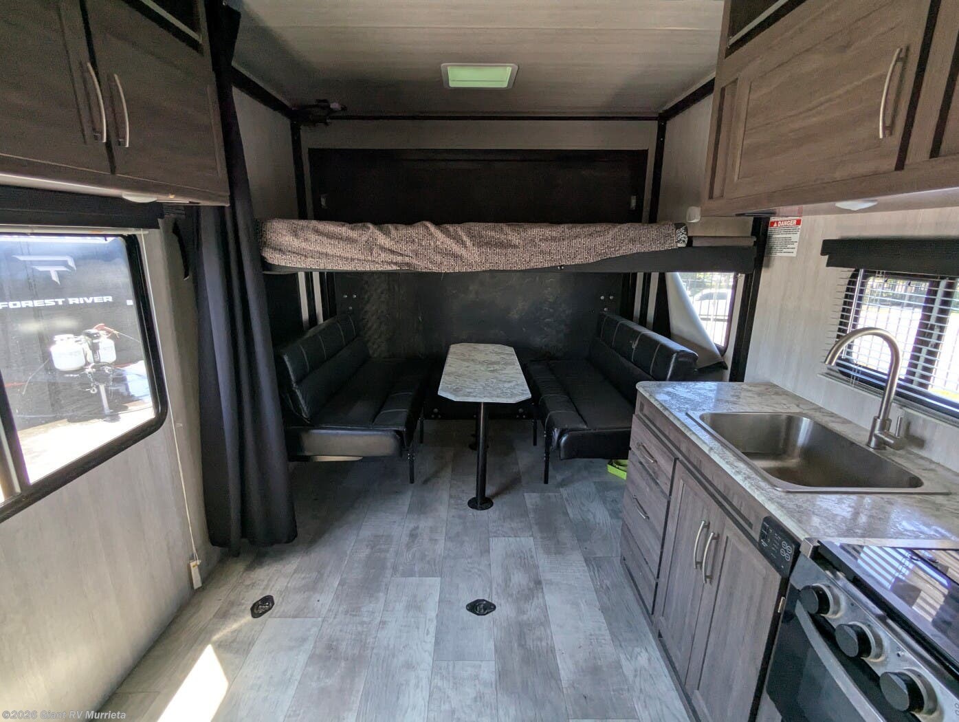 - 13'11" Cargo Garage: Spacious toy hauler area with a ramp door, tie-downs, and flip-up bed for ATVs or extra sleeping.