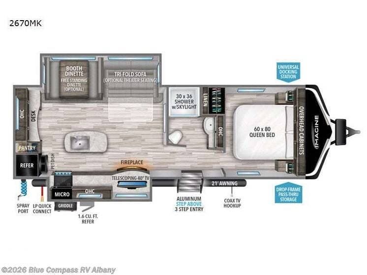 The 2022 Grand Design Imagine 2670MK is a well-appointed travel trailer designed for comfort, convenience, and extended RV adventures. It offers a thoughtful layout, high-quality construction, plenty of storage, modern amenities, and residential-style features.