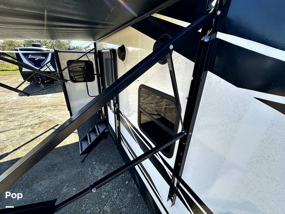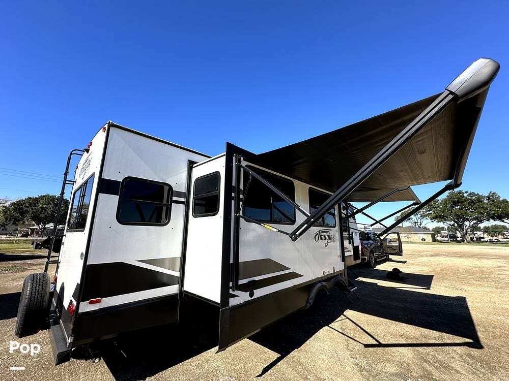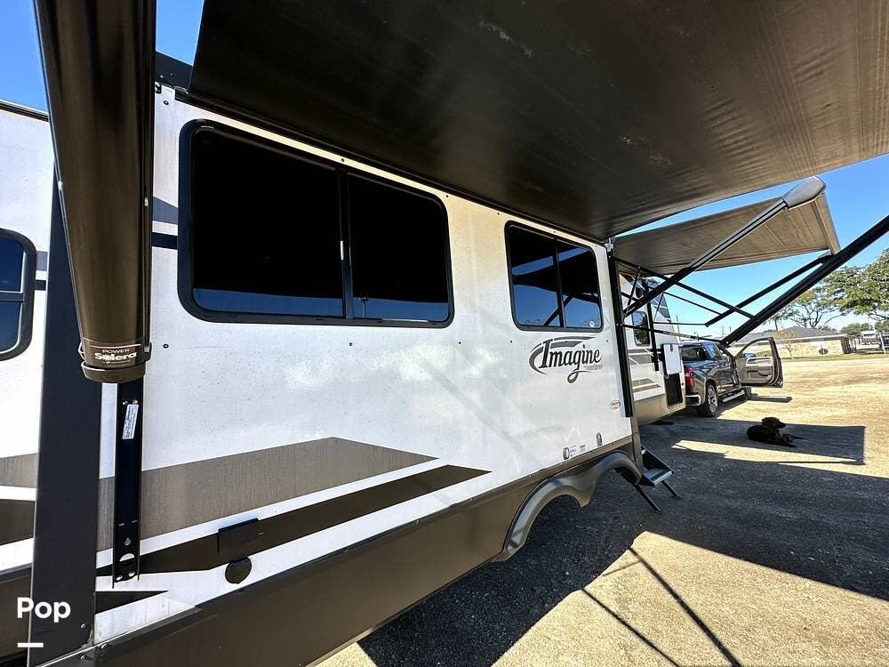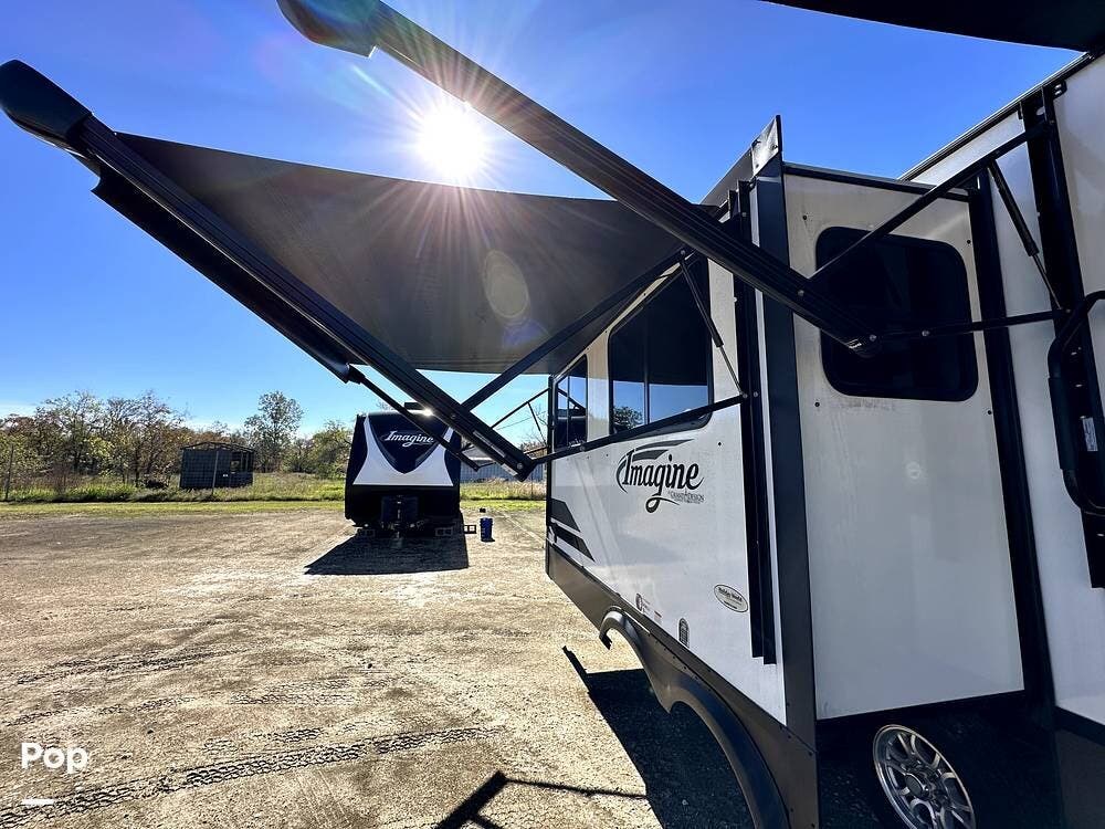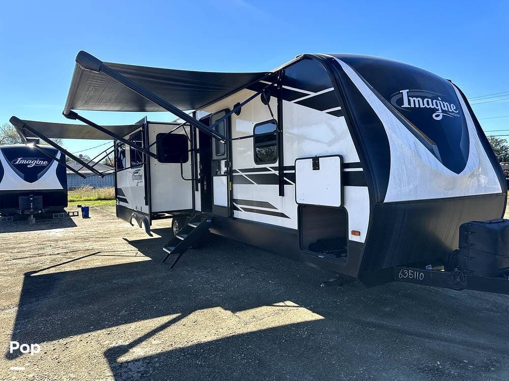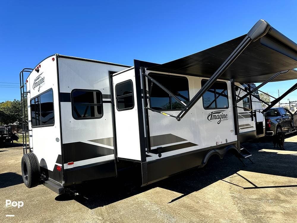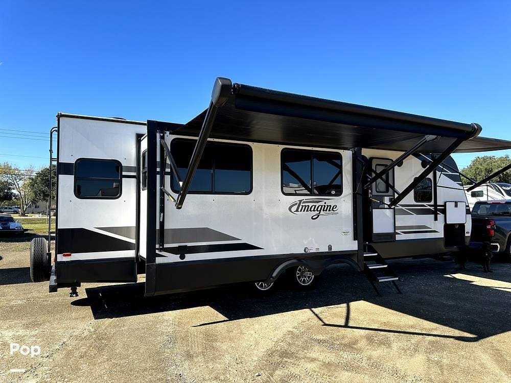 This 2022 Imagine 2970RL By Grand Design, located in Pearland, Texas, features front and back leveling jacks, two power retractable slide-outs, and two 21-foot power retractable awnings.