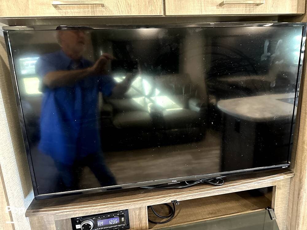 The bedroom is equipped with a queen bed and an LED television. This unit sleeps six people with an additional sofa bed and two recliners.