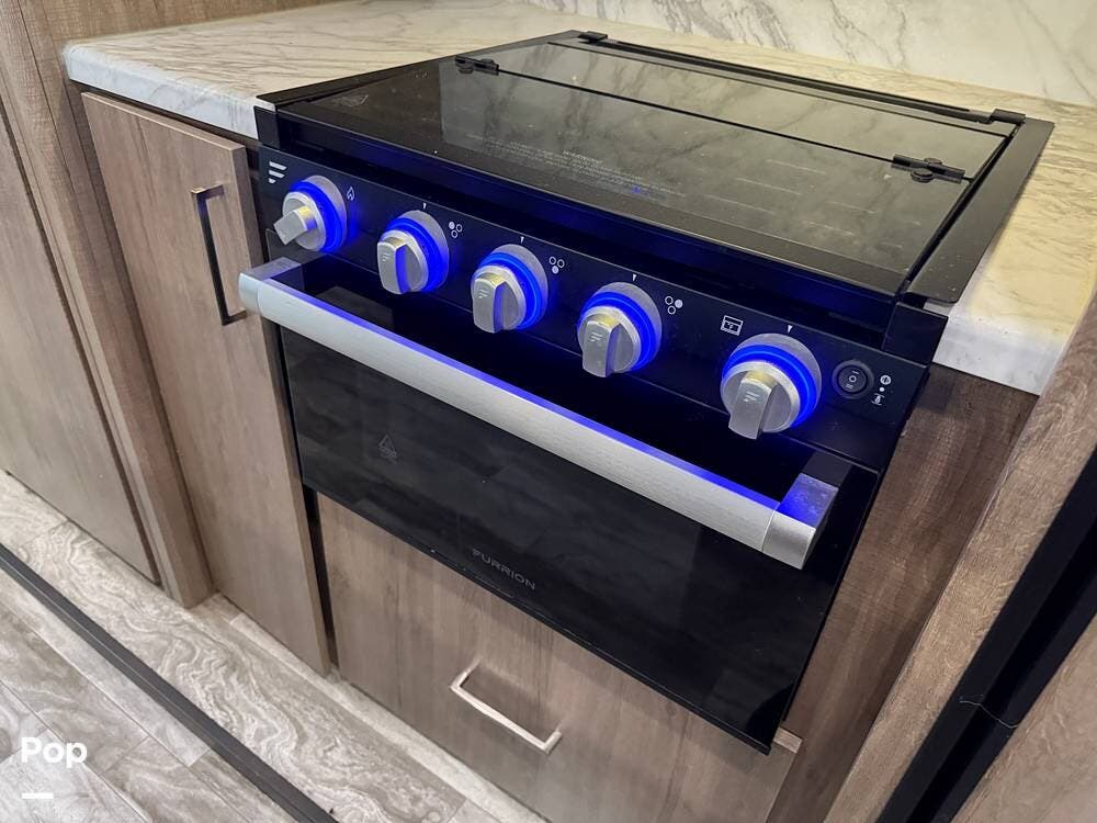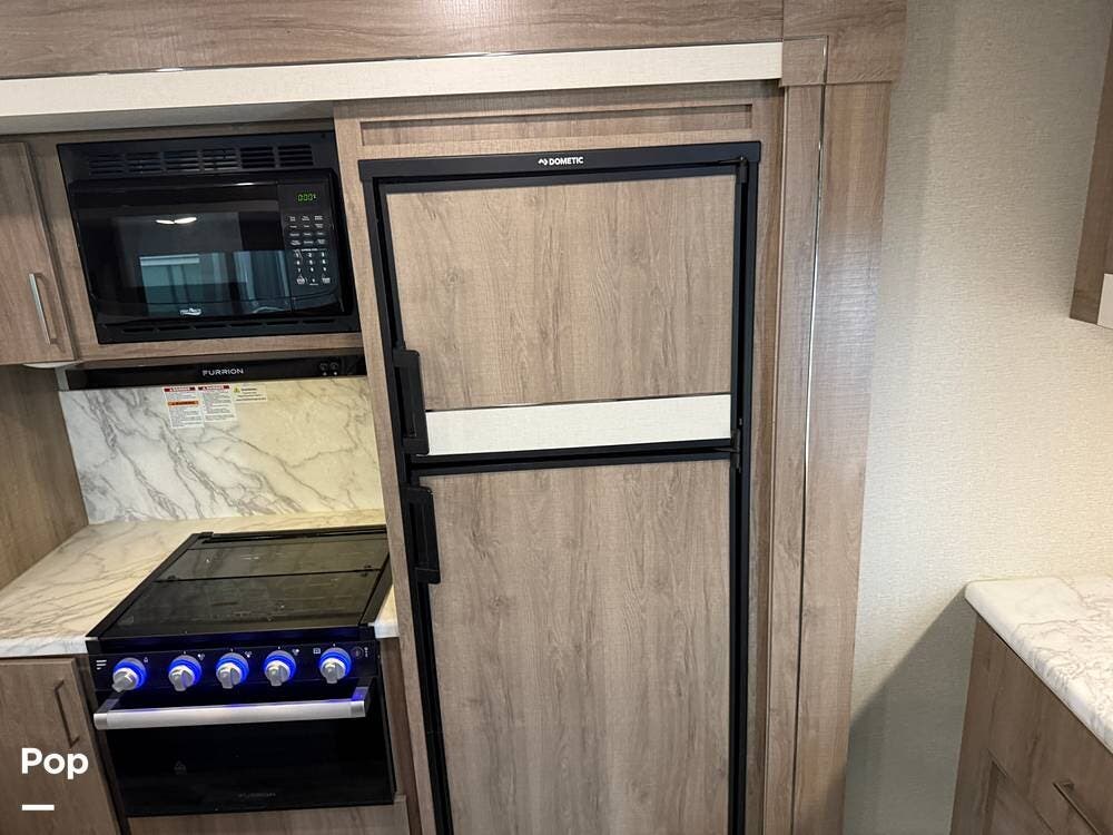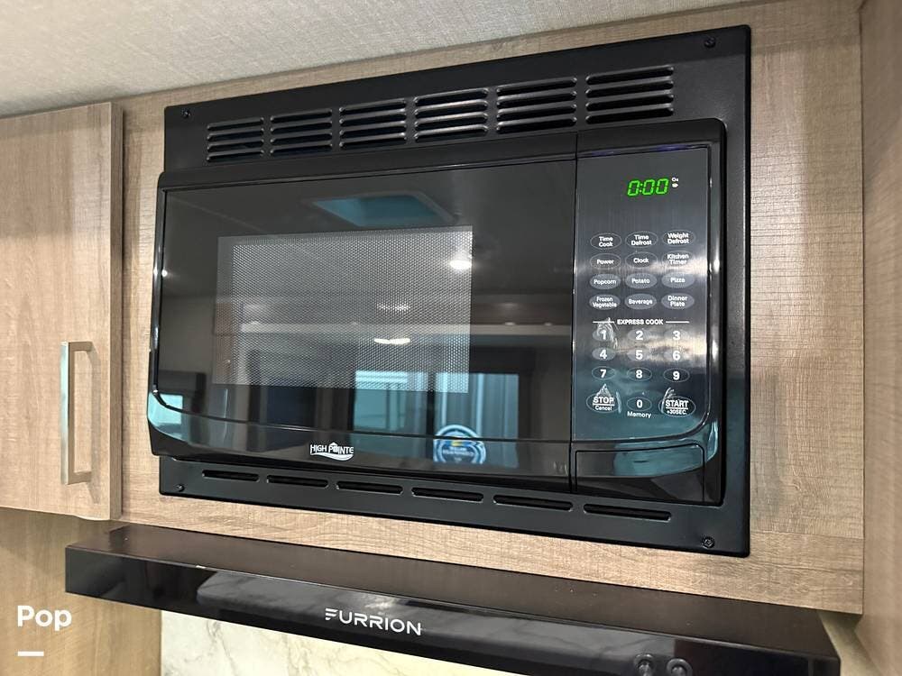 The kitchen has a three-burner cooktop, oven, microwave, and refrigerator, making it easy to prepare meals while traveling. This unit is even large enough to lend itself to full-time living.