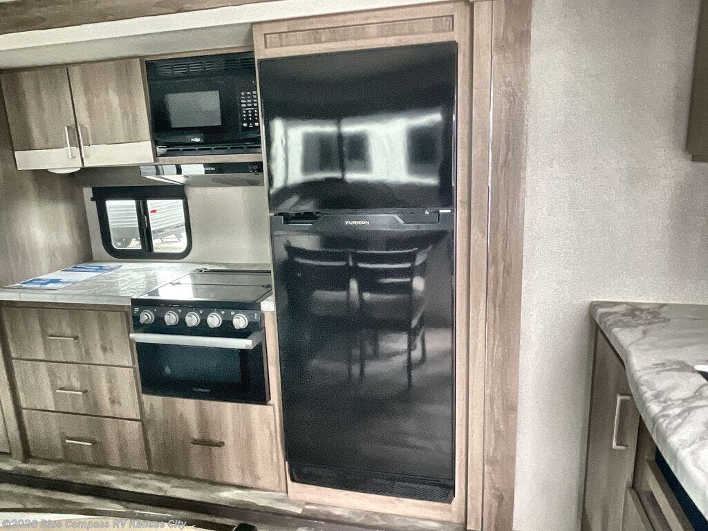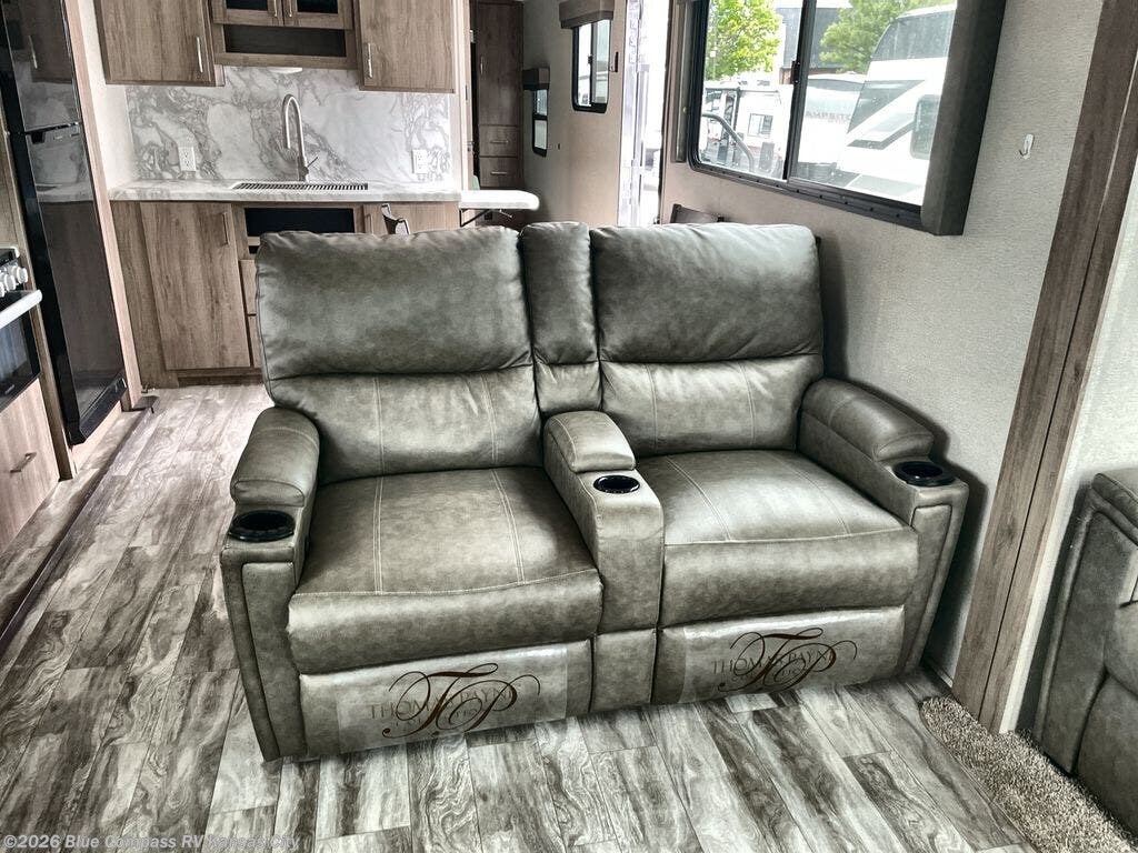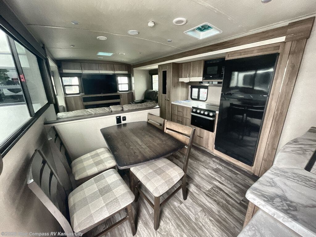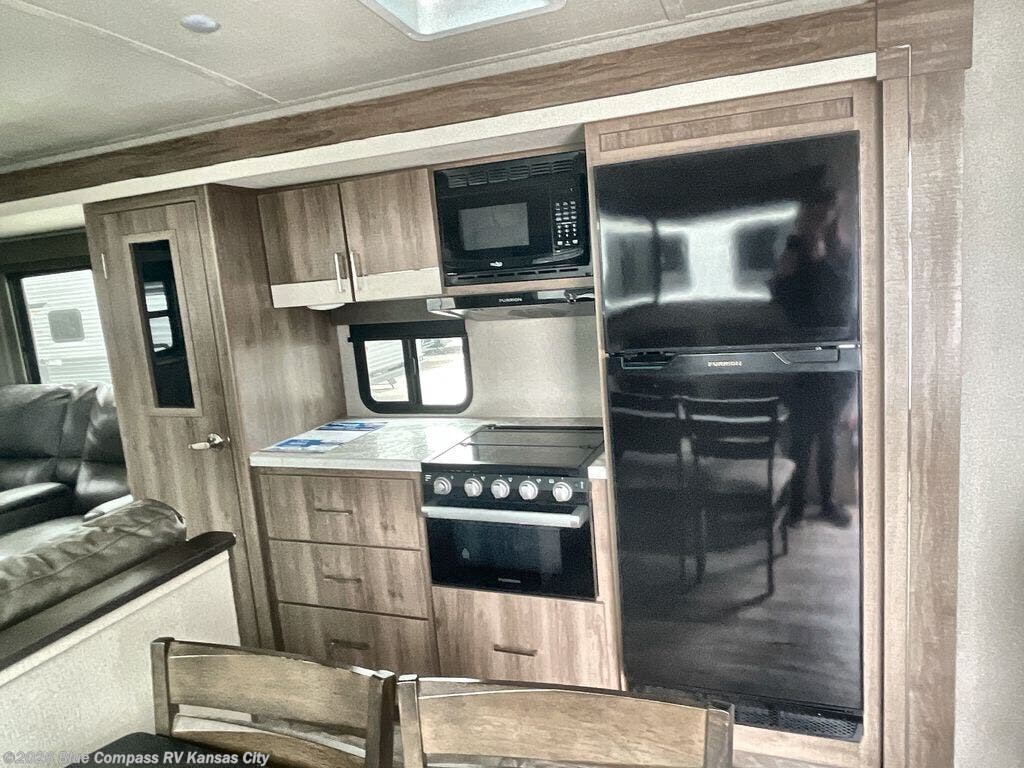 The rear living room on this Imagine travel trailer is just what you'll want when you're looking for a little down time. This room has opposing tri-fold sofas on slide outs, theater seating, a 50" LED HDTV, and a 48" fireplace. Another place that you can sit down is the free-standing dinette. You can sit here with a fresh cup of coffee in the afternoon as you map out your hike for tomorrow. The kitchen offers you a microwave, three-burner range with oven, 10-cubic foot refrigerator, and pantry to help you make meals, and there is a private bedroom with a 60" x 80" bed to rest on at the end of the day.