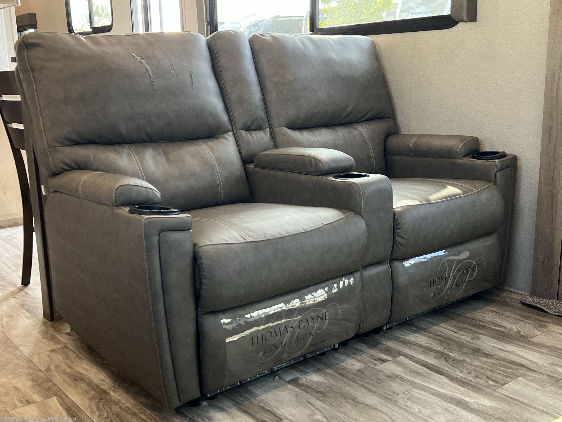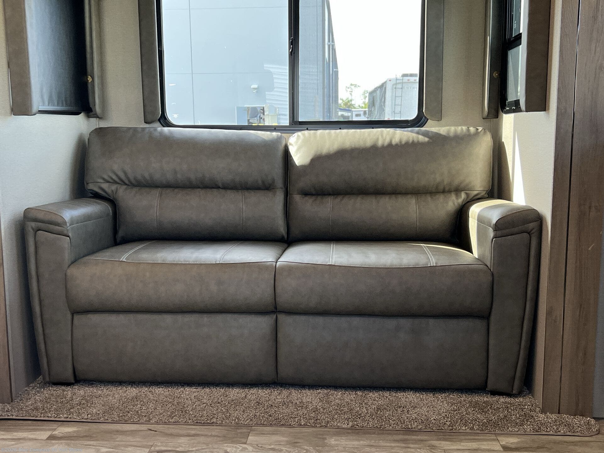 The rear living room on this Imagine travel trailer is just what you'll want when you're looking for a little down time. This room has opposing tri-fold sofas on slide outs, theater seating, a 50" LED HDTV, and a 48" fireplace. Another place that you can sit down is the free-standing dinette. You can sit here with a fresh cup of coffee in the afternoon as you map out your hike for tomorrow. The kitchen offers you a microwave, three-burner range with oven, 10-cubic foot refrigerator, and pantry to help you make meals, and there is a private bedroom with a 60" x 80" bed to rest on at the end of the day.