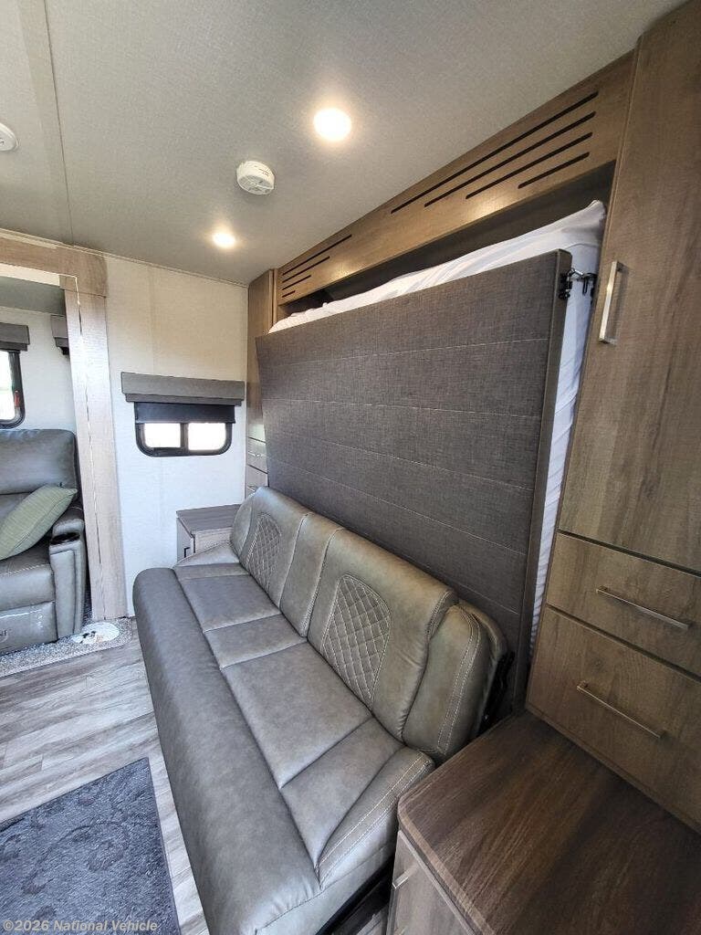 The main living area features a plush sofa along with two reclining loungers equipped with heat and massage functions, creating the perfect environment to unwind after a day outdoors. A large slide-out expands the living space, giving the interior an open, airy feel that?s ideal for couples or solo travelers with pets.