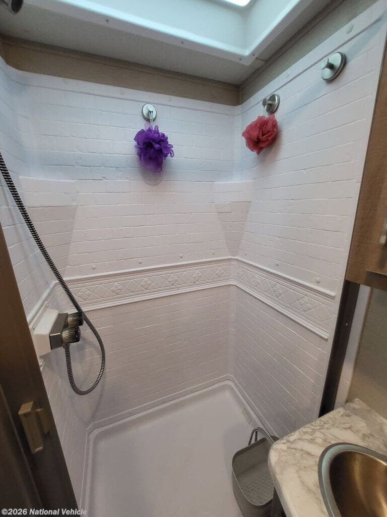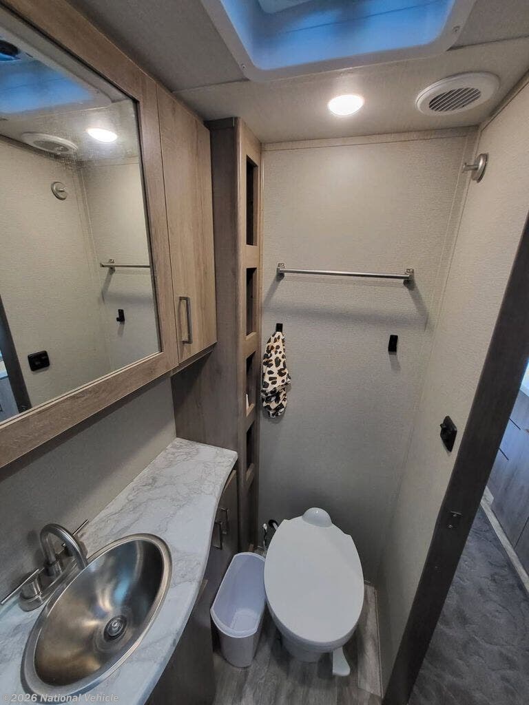 The kitchen is well-appointed with a generous refrigerator/freezer, ample storage, and efficient layout, making meal prep simple whether you're on a weekend getaway or extended trip. The bathroom includes a porcelain toilet and quality fixtures, reflecting the same attention to detail found throughout the coach.