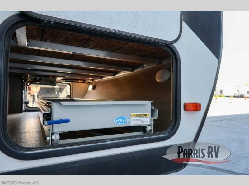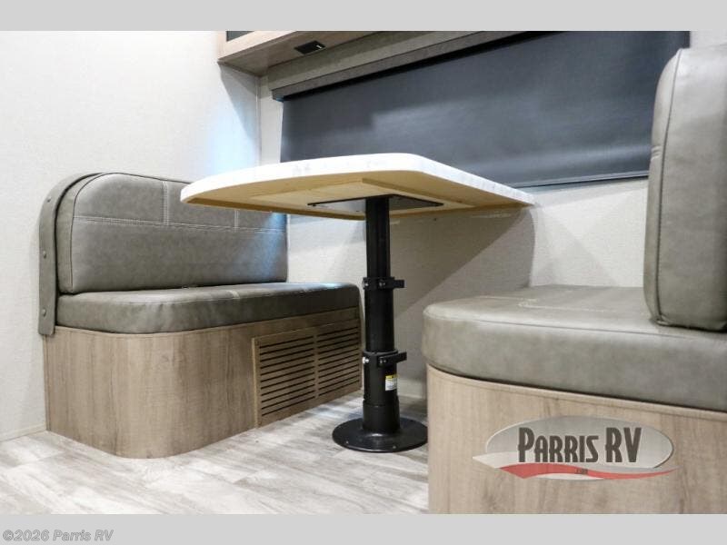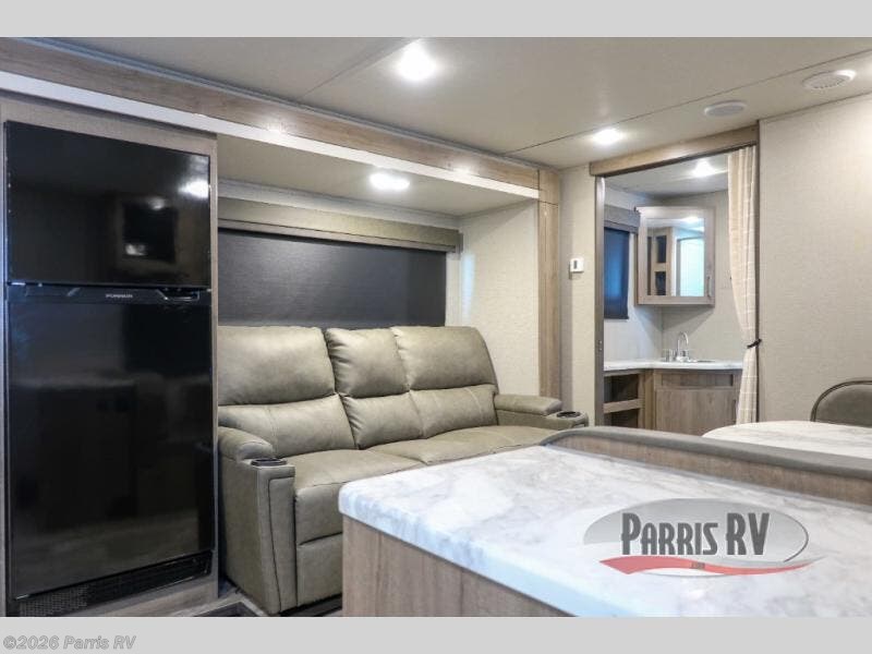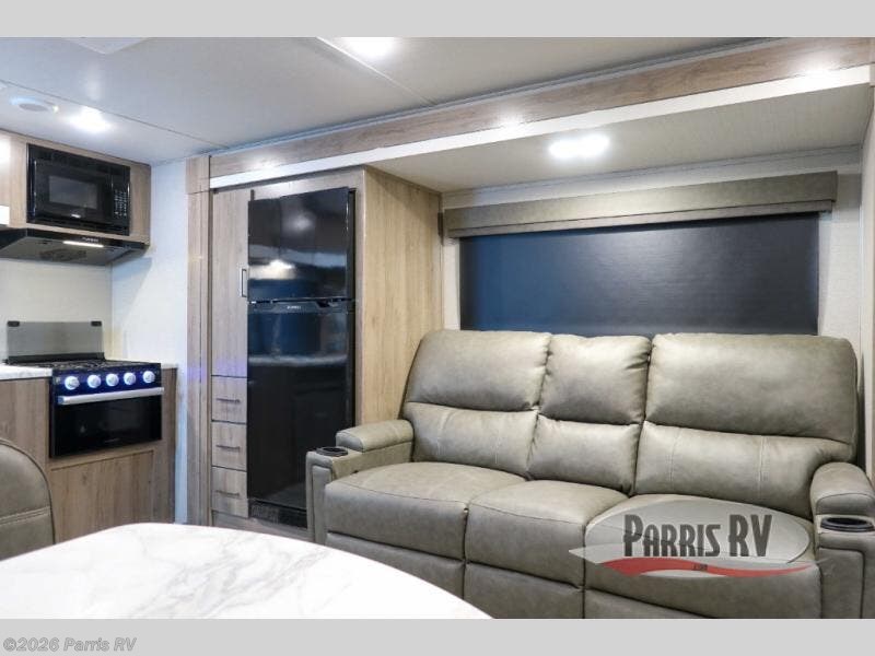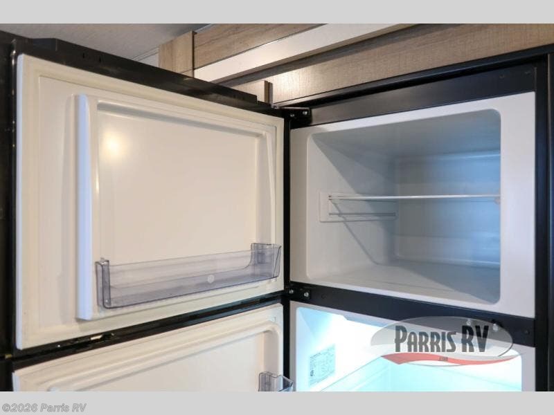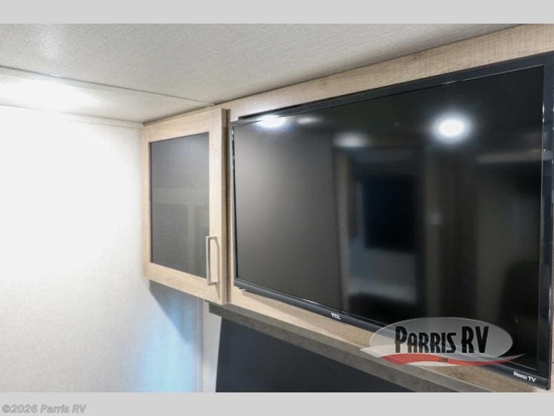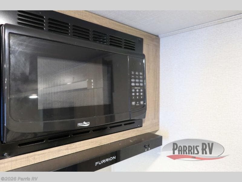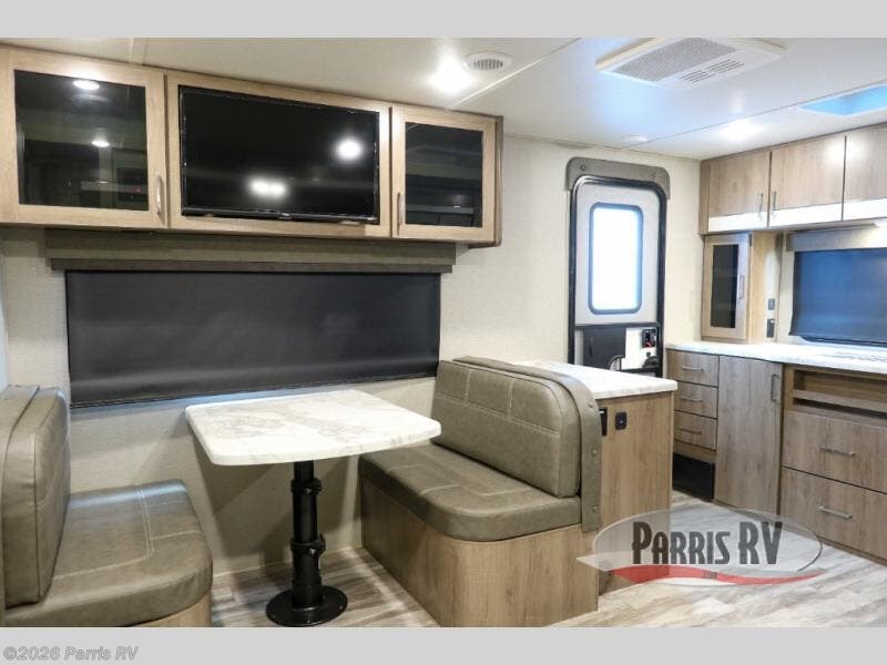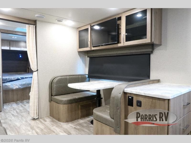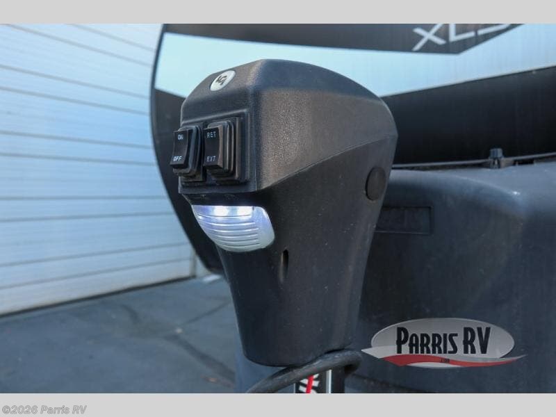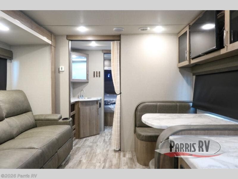 Treat yourself to a weekend of fun in this Imagine XLS travel trailer! Whether it's just you and your spouse, or you've chosen to bring along a group of friends, this trailer will meet the need. The front bedroom can sleep two people on the walk-around queen-size bed. The bedroom is quite functional because it not only contains the second exterior entry door, but it also has a private entrance into the walk-through bathroom since it is located on the other side of the bathroom. The booth dinette is functional too because it can transform from a dining location into a sleeping location, and the theater seating is directly across from the 32" LED TV for easy viewing. When you enter through the entry door that is right next to the rear kitchen, you'll be able to take off your shoes and put them in the shoe storage below the dinette.