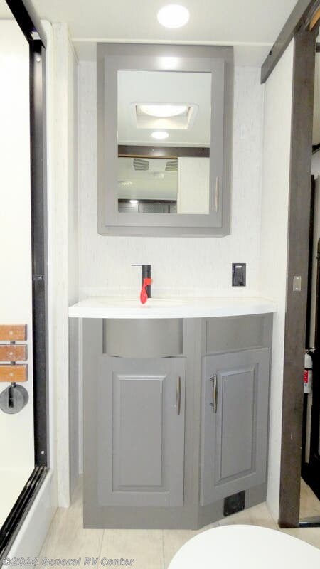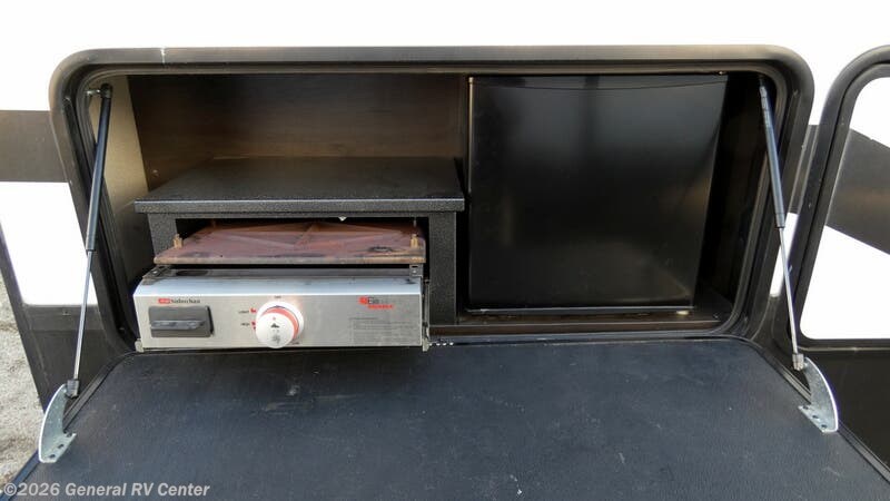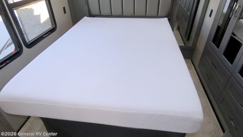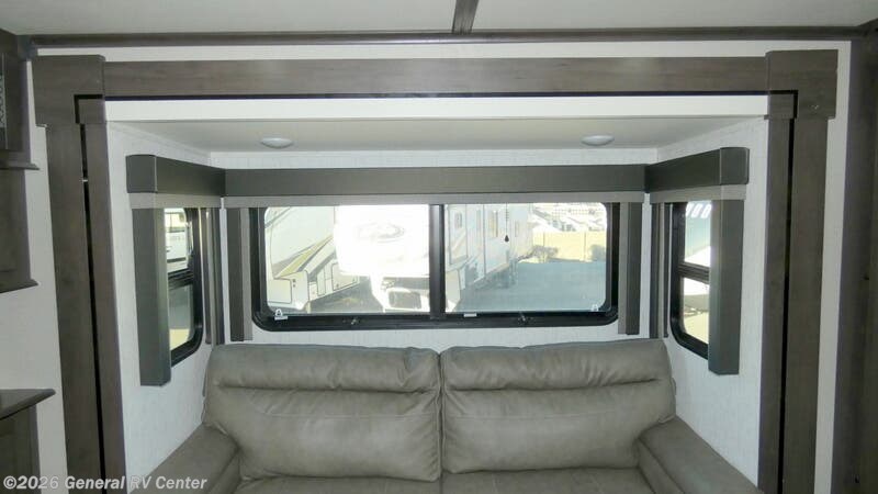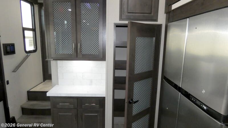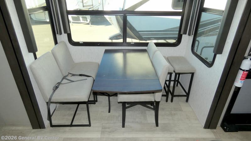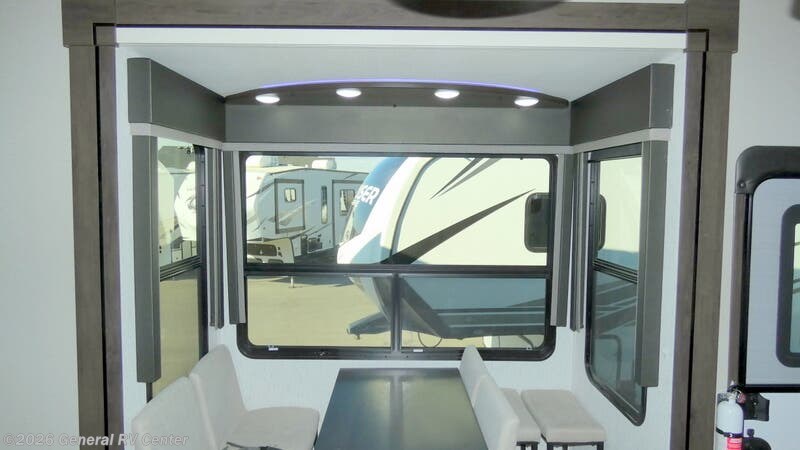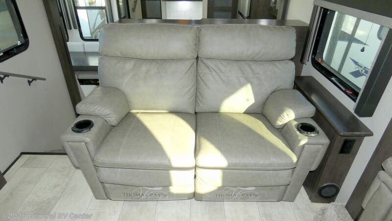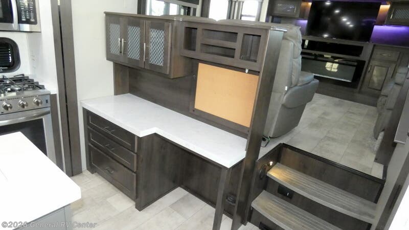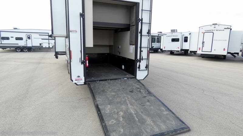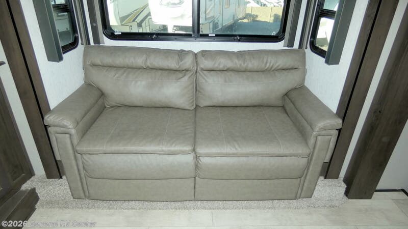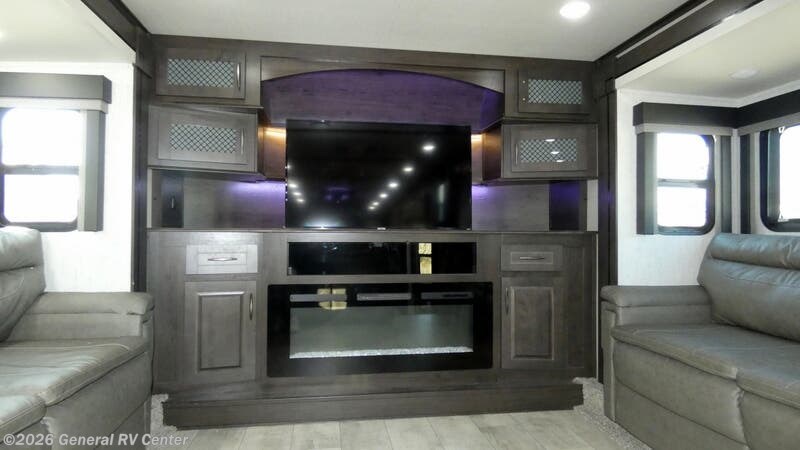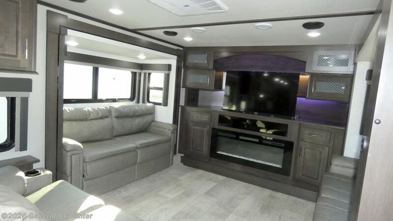 Step into luxury and adventure with the 2022 Grand Design Momentum 376THS, a fifth wheel toy hauler that redefines comfort on the road. This stunning model offers an inviting front living area, complete with plush tri-fold sofas and an entertainment center featuring a cozy fireplace. Imagine unwinding here after a day of exploration, surrounded by panoramic views from the ample windows that bathe the space in natural light. The heart of this RV is its well-appointed center kitchen, featuring a full-size refrigerator and a three-burner cooktop, perfect for crafting gourmet meals. The freestanding dinette offers a lovely spot for family dinners or morning coffee. At the rear, the bedroom awaits with a luxurious queen bed, ensuring restful nights. Outside, dual powered awnings create an inviting outdoor living space, perfect for enjoying the great outdoors while staying sheltered from the elements. For more details, visit your nearest General RV dealership.