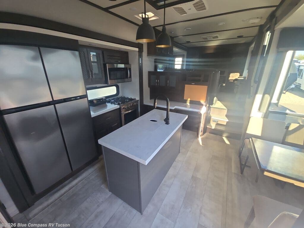 This unique fifth wheel offers a below-floor garage for your toy(s), an outside kitchen and LED TV, two pass-through compartments and two awnings, plus much more to enjoy the outdoors when you aren't inside soaking in the luxury and comfort! The front, separate living area gives you a place to relax with opposing tri-fold sofa slides and theatre seating or choose the lounge chairs option, and you can watch the 49" LED TV with fireplace below. The separate kitchen is spacious as well and includes a kitchen island with stools, a hutch and a desk, plus a free standing dinette within a slide with windows for great views. The pantry even has a prepped space for a washer/dryer option to keep the linens clean. You will enjoy dual access to the full bath, and the rear bedroom provides a walk-around queen bed or choose the king option, plenty of storage and USB charging outlets. If you would prefer to have a residential refrigerator, you should check out model 376THS-R!