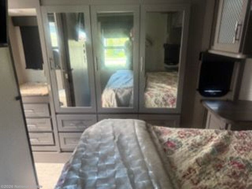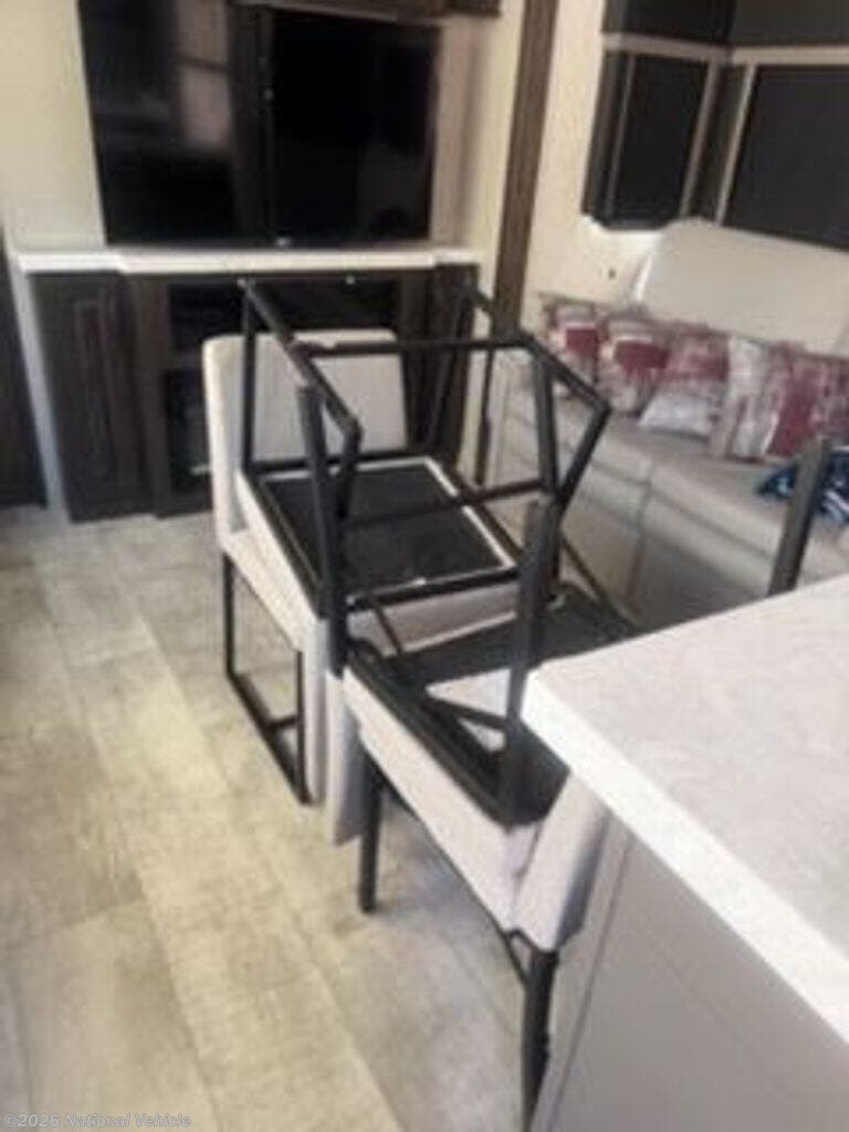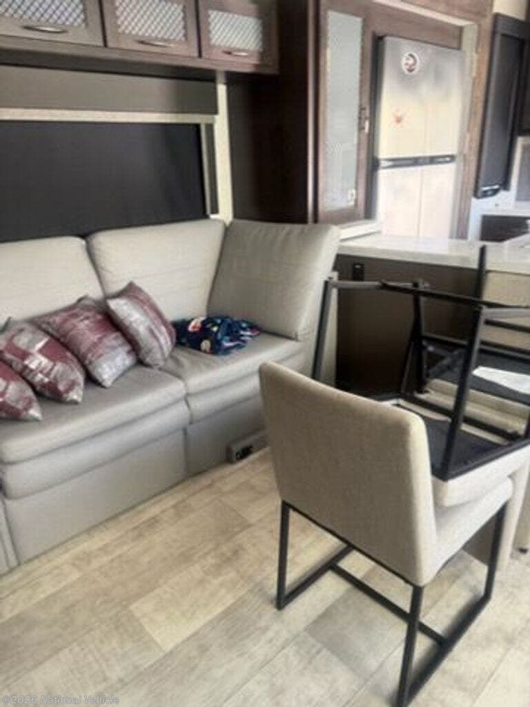 Inside, the Momentum lives up to its reputation with a wide-open layout, tall ceilings, and upscale finishes throughout. The main living area features plush seating, a fireplace, large TV, and modern entertainment system?creating a true residential feel on the road. The gourmet kitchen includes solid-surface countertops, a large residential refrigerator, and premium appliances, making it perfect for extended stays.