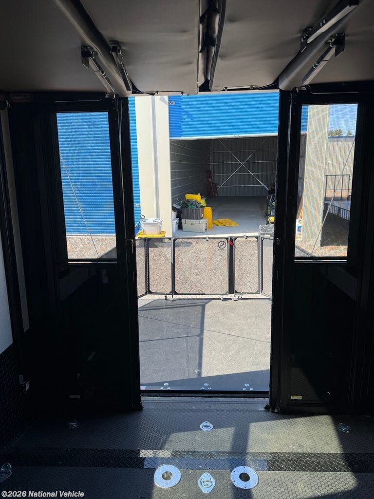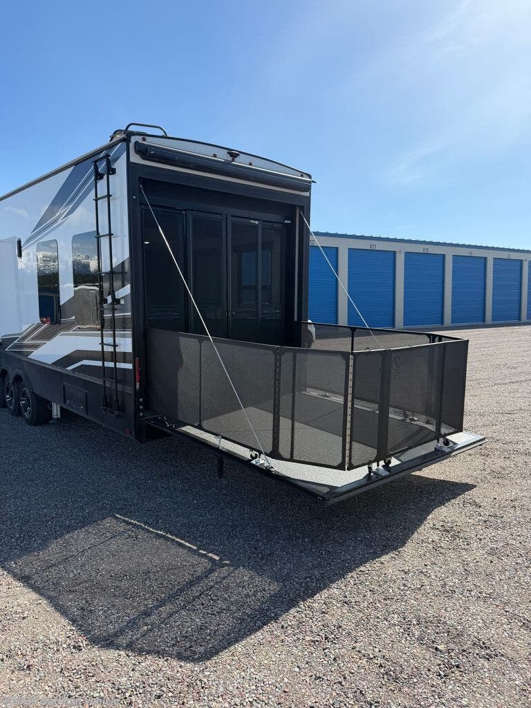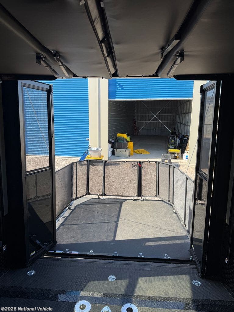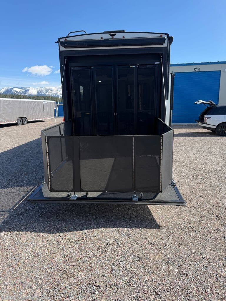 The master suite features a king bed with under-bed storage, a wardrobe, and a private bath with a large shower and skylight. The garage area is perfect for ATVs, motorcycles, or other toys, with a built-in ramp and tie-downs, plus convertible space for additional living or sleeping quarters. Convenience features include a stacked washer and dryer, hydraulic leveling jacks, heated holding tanks, and multiple TVs inside and out for entertainment anywhere.