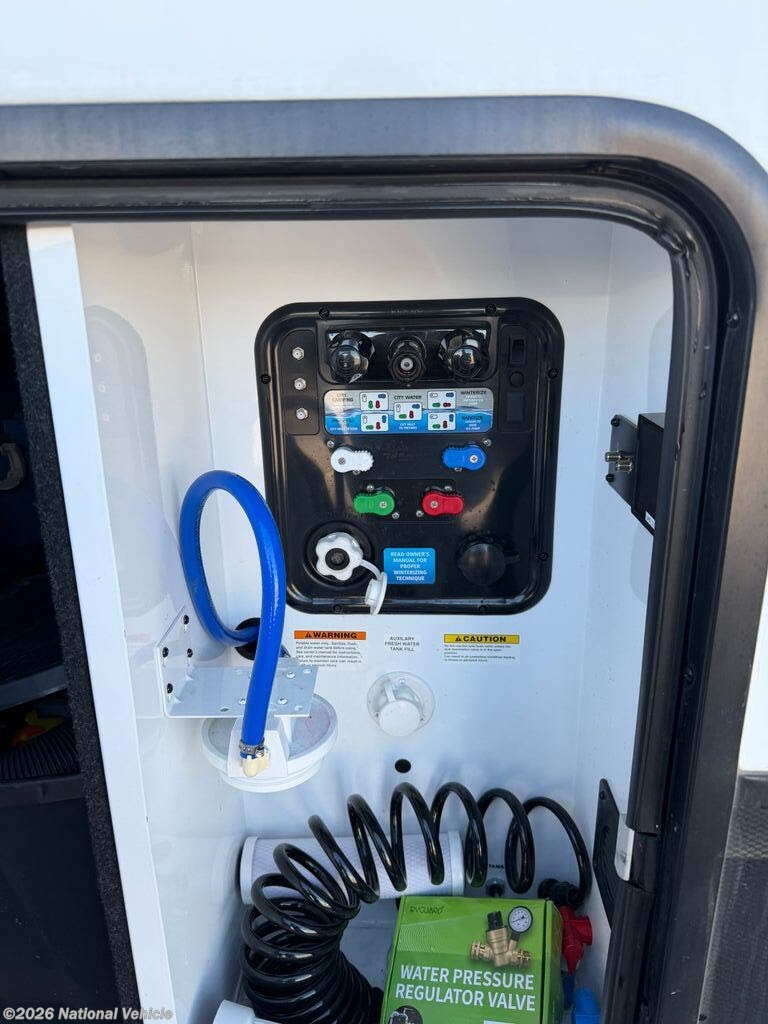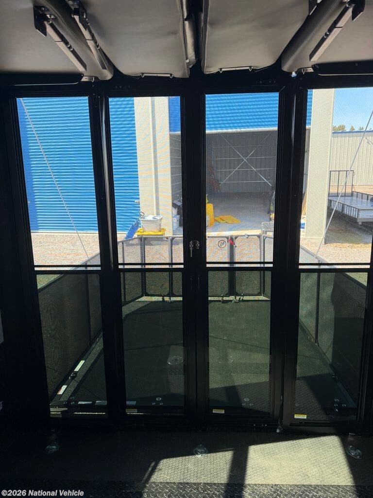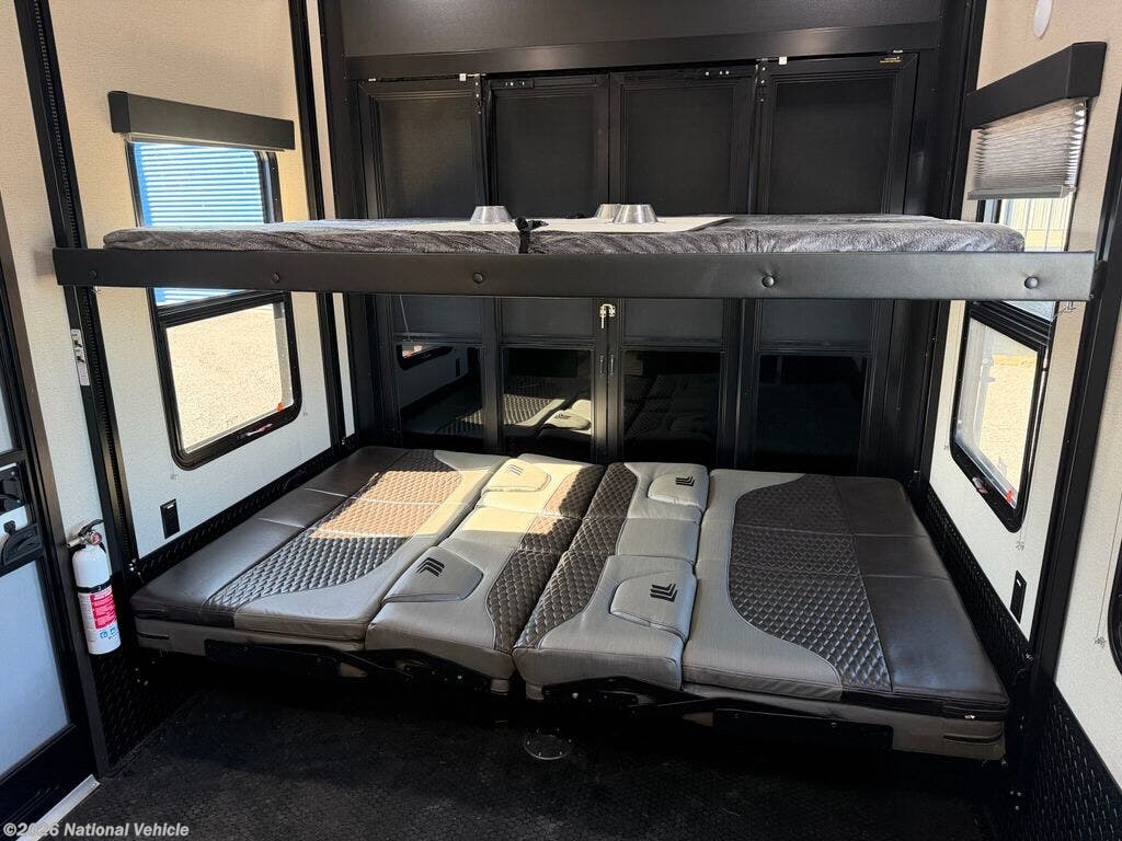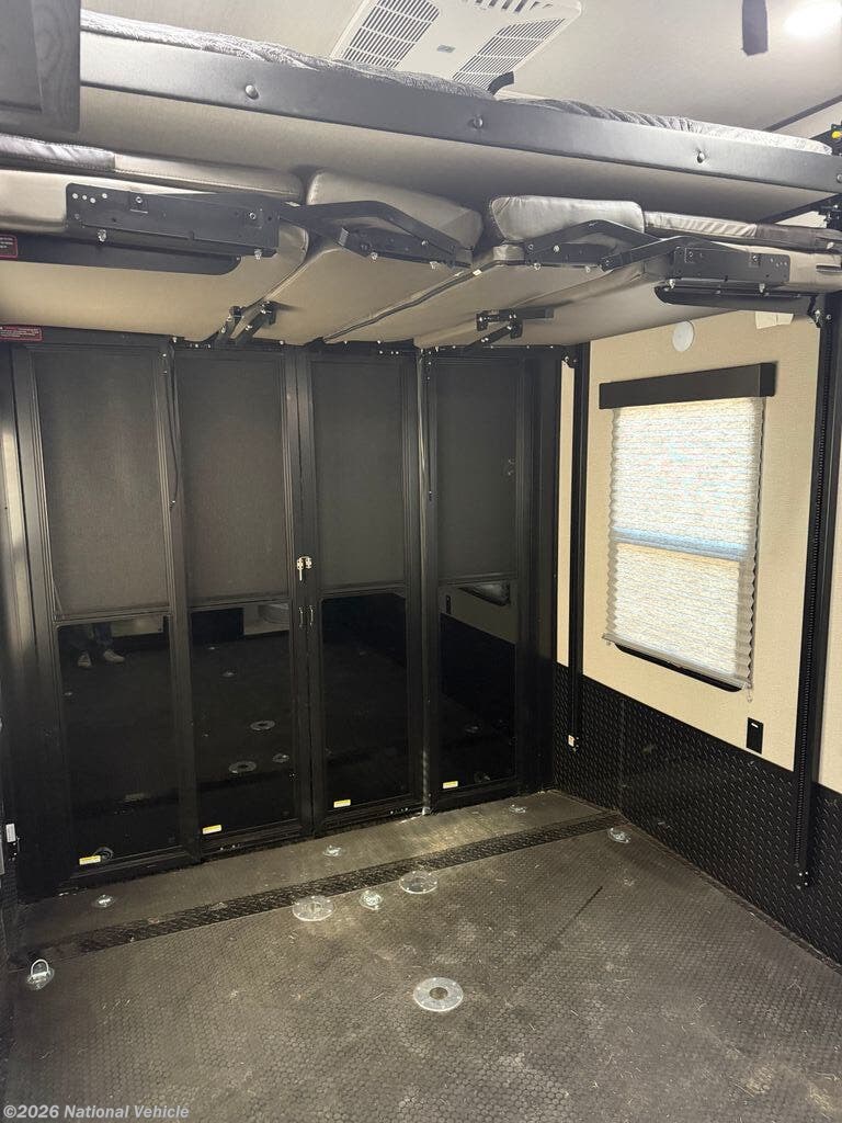 The master suite features a king bed with under-bed storage, a wardrobe, and a private bath with a large shower and skylight. The garage area is perfect for ATVs, motorcycles, or other toys, with a built-in ramp and tie-downs, plus convertible space for additional living or sleeping quarters. Convenience features include a stacked washer and dryer, hydraulic leveling jacks, heated holding tanks, and multiple TVs inside and out for entertainment anywhere.